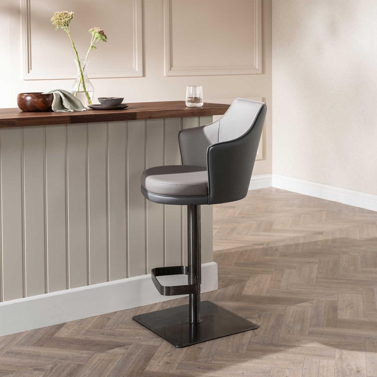 I’d pick this grey-leather bar stool for its pared-back silhouette and sturdy metal base - the gently curved back offers real comfort without bulk. The adjustable height and swivel seat make it a versatile choice for everything from a sleek city apartment to a pared-back Scandi or industrial-inspired kitchen. Styling tip: team the stool with a matt-black breakfast bar or warm oak counter to play off the frame, then introduce a textured wool rug underneath to define the seating area. A couple of slim, metal-framed pendant lamps above will complete the look and add a touch of contrast against the soft leather.
