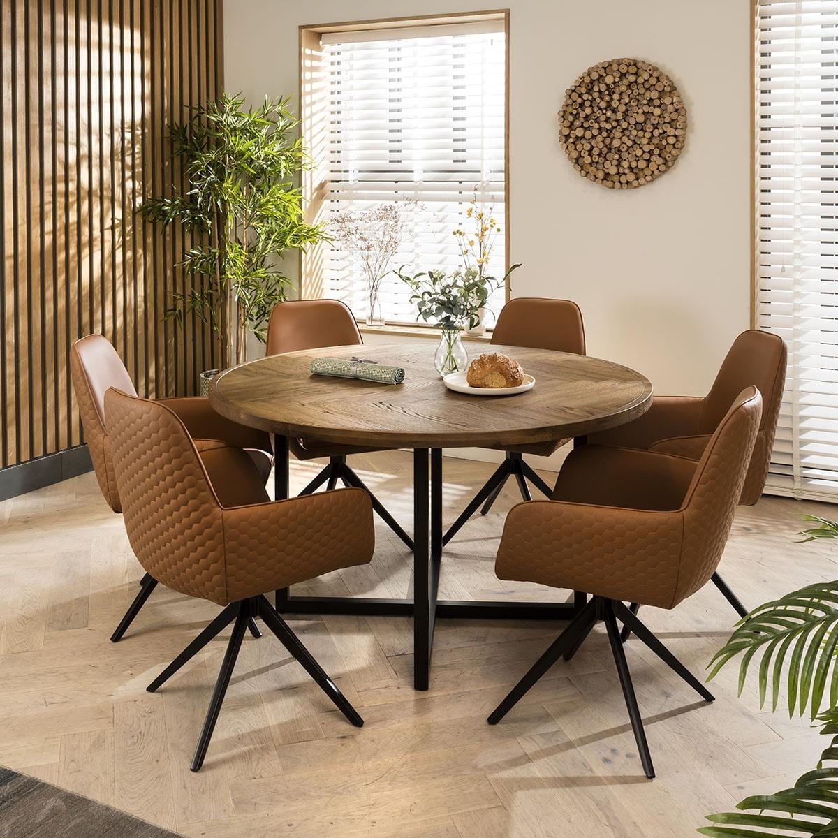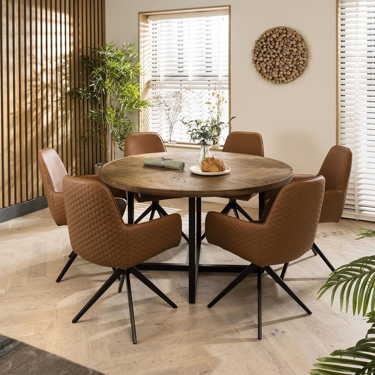 Embrace industrial sophistication with the Emma tan faux leather dining ensemble. At the centre, it's the the 140cm round Gemini herringbone solid wooden dining table, surrounded by six tan faux leather dining chairs, forming a round 6 seater dining set where industrial charm intertwines with practical sophistication. The modern industrial-style round dining table in this set, a fusion of style and durability. Crafted with solid wood and oak veneer, the circular 140cm table comfortably accommodates 6 seats. The black metal pedestal base supports the round tabletop, featuring an industrial parquet herringbone pattern in a premium stained finish. The 6 chair dining set includes the Emma carver dining chairs with arms, crafted with a simple yet thoughtful outline and designed for comfortable dining. Upholstered in easy-clean tan faux leather which adds a touch of opulence to any setting. The dining room chair has a swivel base with a black metal finish for a blend of modern aesthetics and plush comfort. This 6 seater dining set combines modern Emma chairs with the stunning Gemini table. Whether you love the Emma chairs and would like to purchase them individually, or you think the Gemini table would complete your interior scheme better with another chair, you can easily mix and match our modern dining tables and chairs to curate something truly unique. Table Size W140cm D140cm H78cm Chair Size W62cm D62cm H87cm Dining Table And Chair Set For 6
