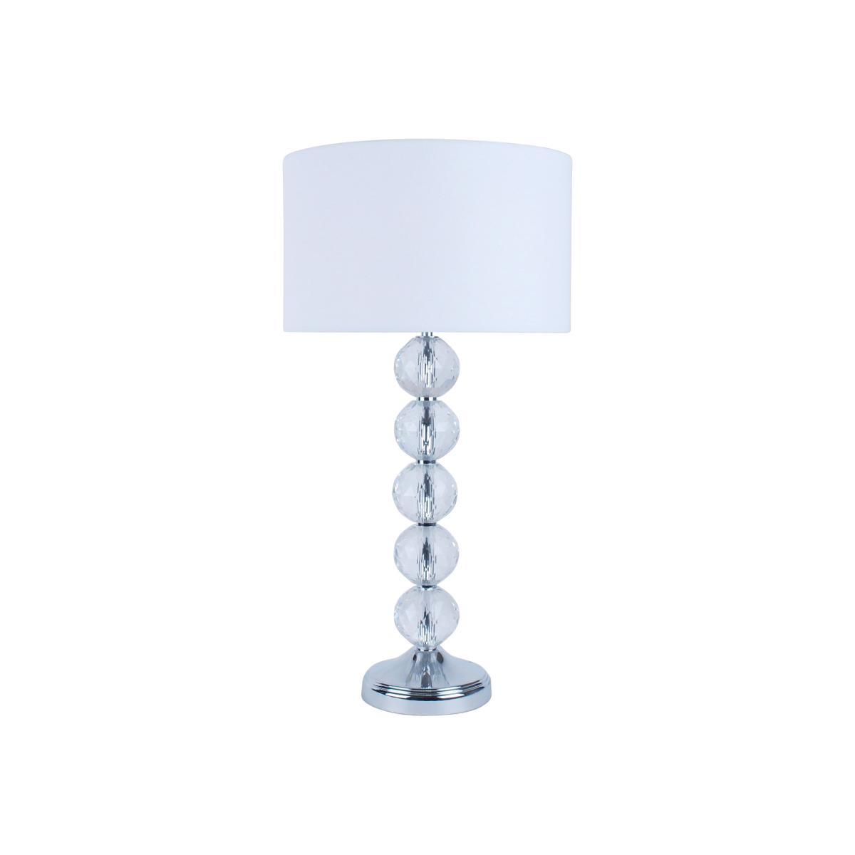 Contemporary Crystal Table Lamp with White Shade. Complete your home with the Emma Crystal Ball table lamp. Contemporary in design, the lamp boasts a crystal ball detail and polished chrome finish. The versatile white light shade completes the look, perfect for any interior design.. Style this light with one of our vast selection of LED E27 light bulbs.