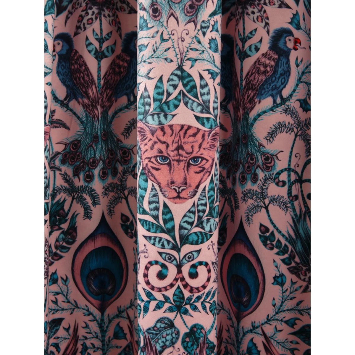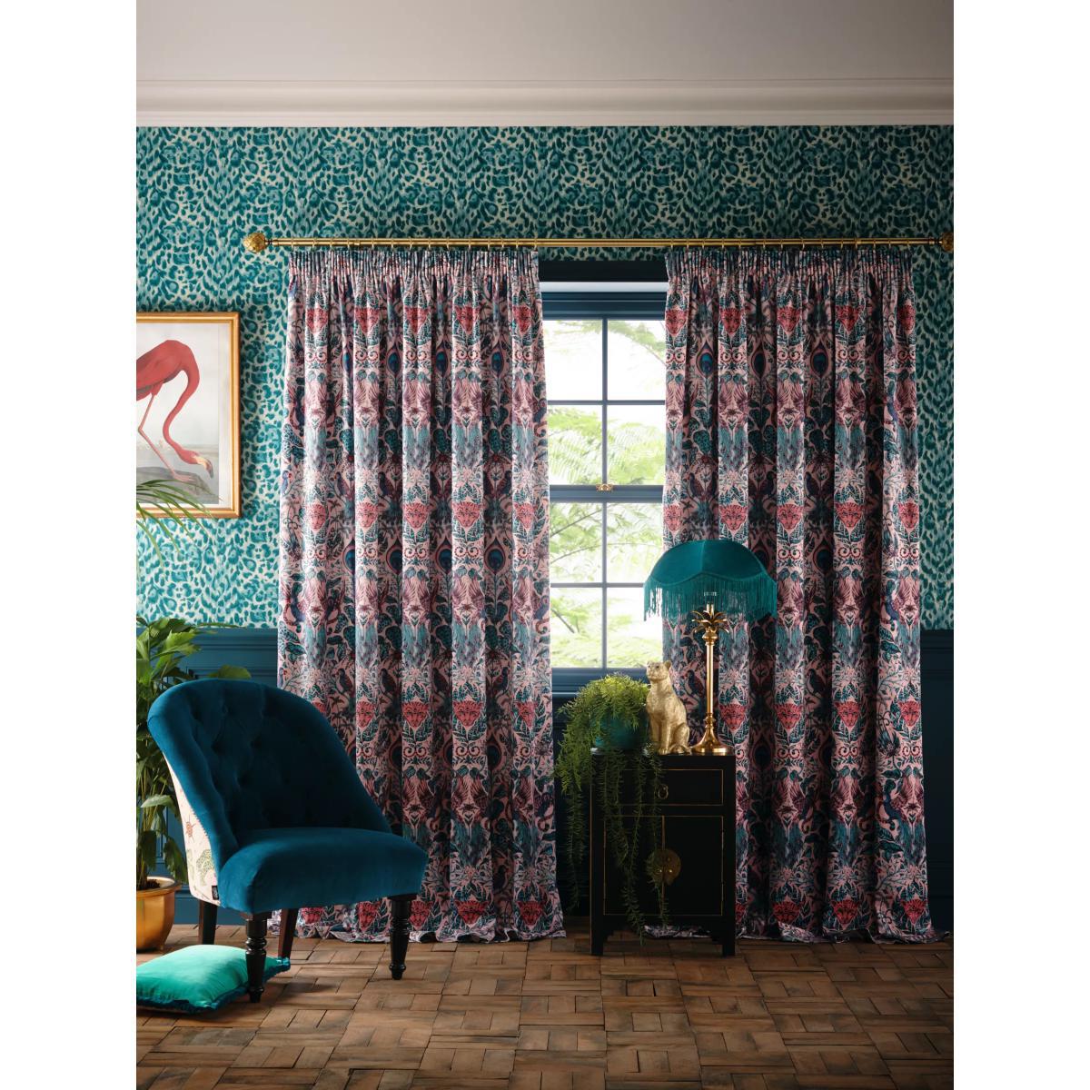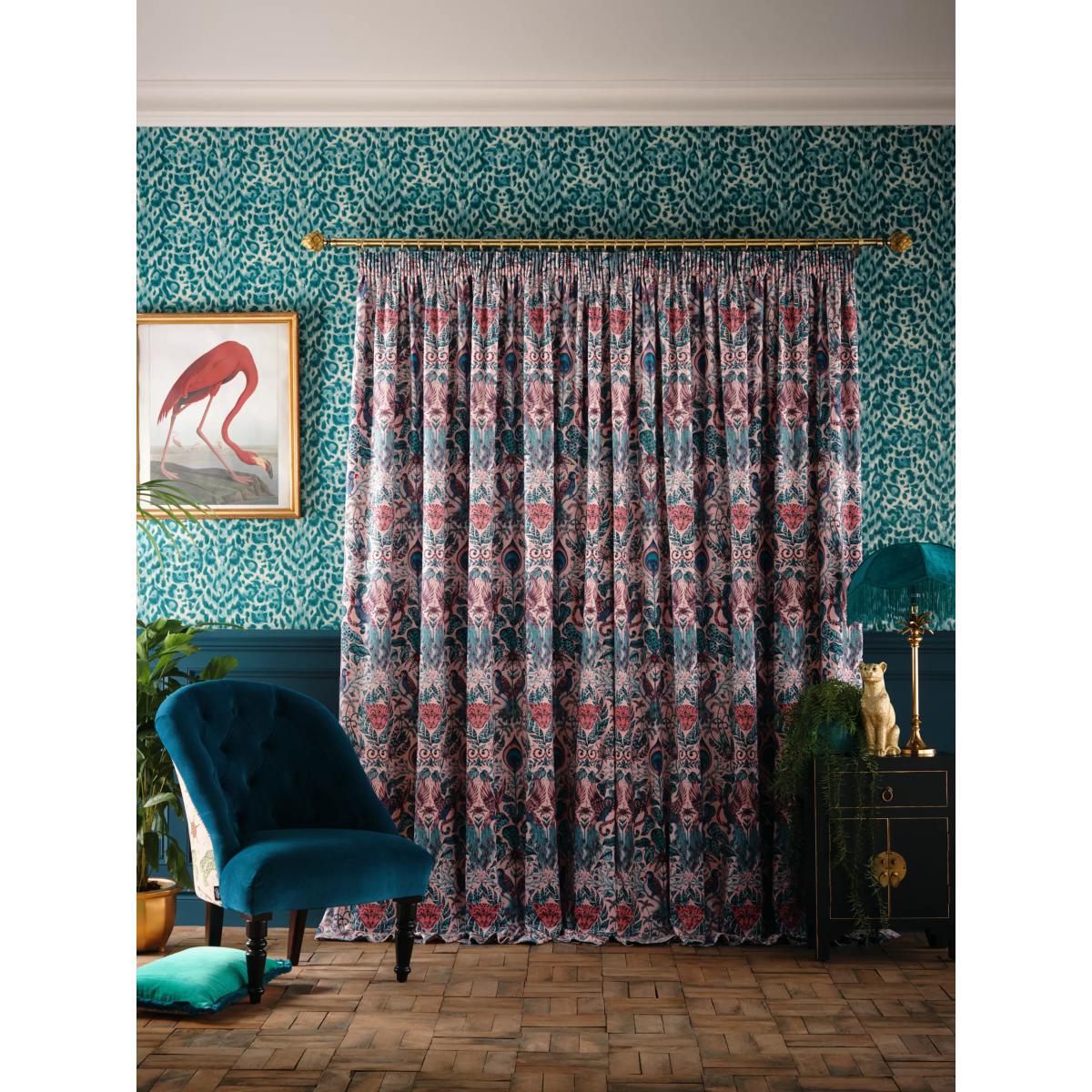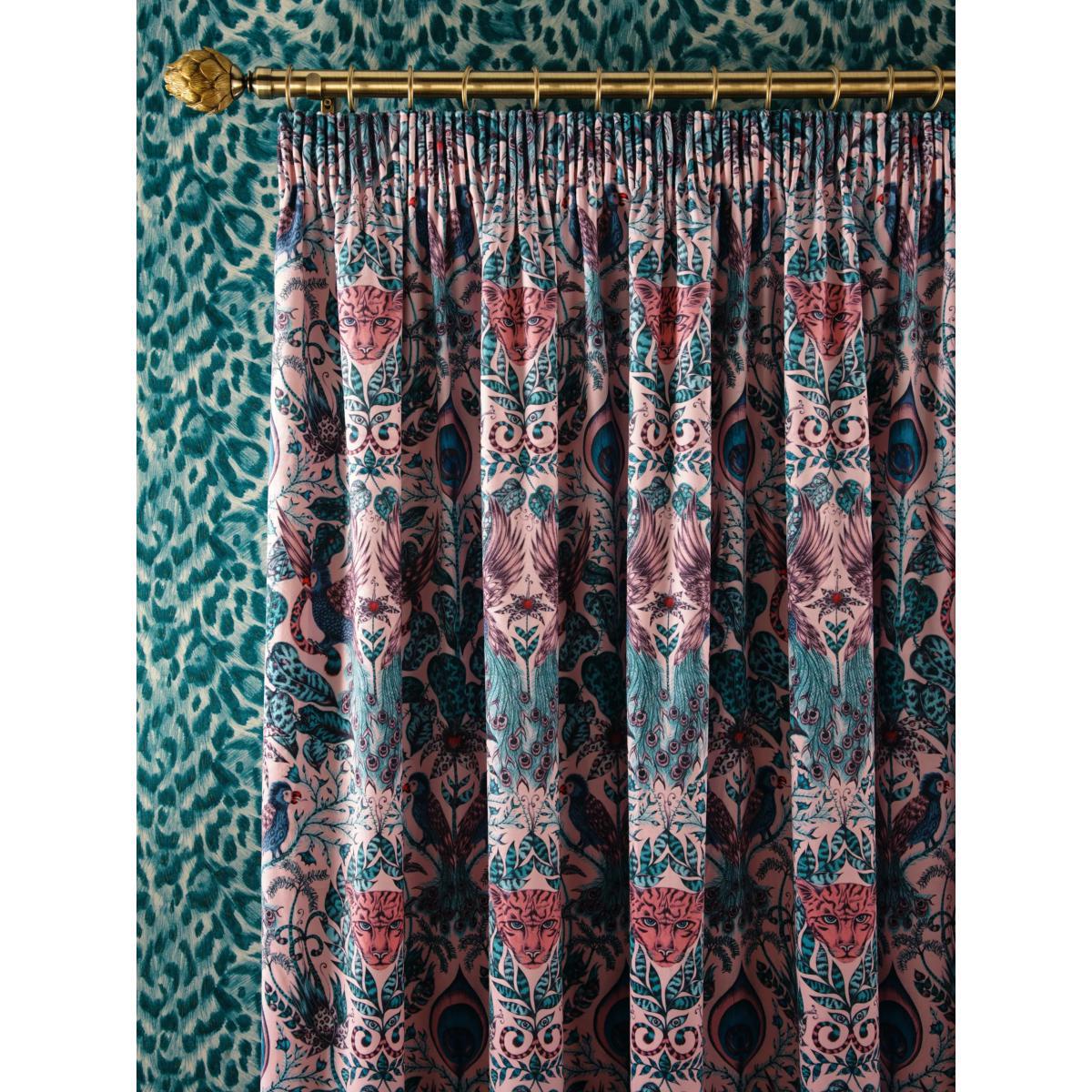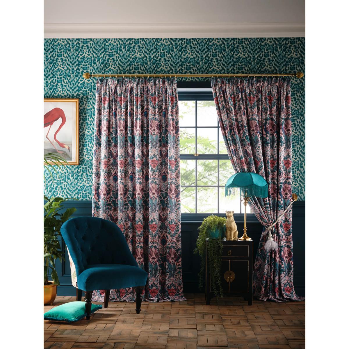 Transform your home into a maximalist paradise with the Amazon velvet curtains from Emma J Shipley. Inspired by a trip to the Amazon jungle and featuring jaguar faces and surrealist parrots, the striking pink and turquoise design provides a fantastical addition to your windows. Each pair of curtains contains recycled materials in the lining which prevents plastic bottles from going to landfill. This lining also improves the drape of the curtains, enhancing the vibrancy of the pattern. Choosing the right size These curtains can be hung with a pole or track using curtain hooks (not included). There are three hook positions on the heading, allowing you to choose how your curtains sit against the track or pole. For example, if you're using a track you may want to use the middle or lower row of hooks to cover the track, whereas if you're using a pole you may want to use the top row of hooks so the curtains hang below the rings. The specified drop is taken from the top row of hook pockets to the bottom edge of the curtain. The width stated indicates the size of one curtain panel when laid completely flat. This pack contains two panels, and the track/pole length we've recommended allows for the two panels to be gathered when the curtains are drawn. For a fuller look, increase the curtain width. One pair of 167cm width curtains will fit a curtain track/pole size of 133-167cm One pair of 228cm width curtains will fit a curtain track/pole size of 182-228cm Do you need a curtain pole and accessories?