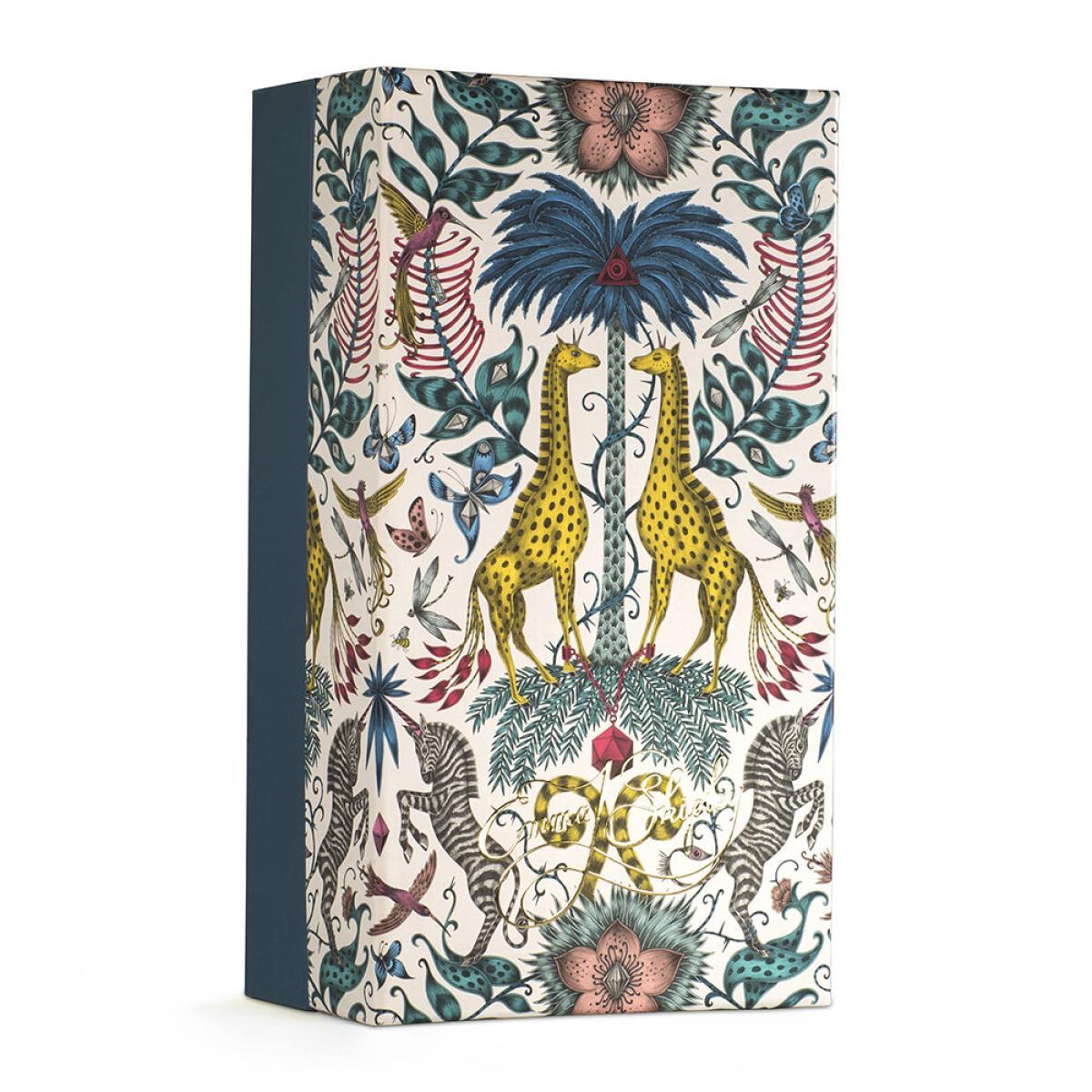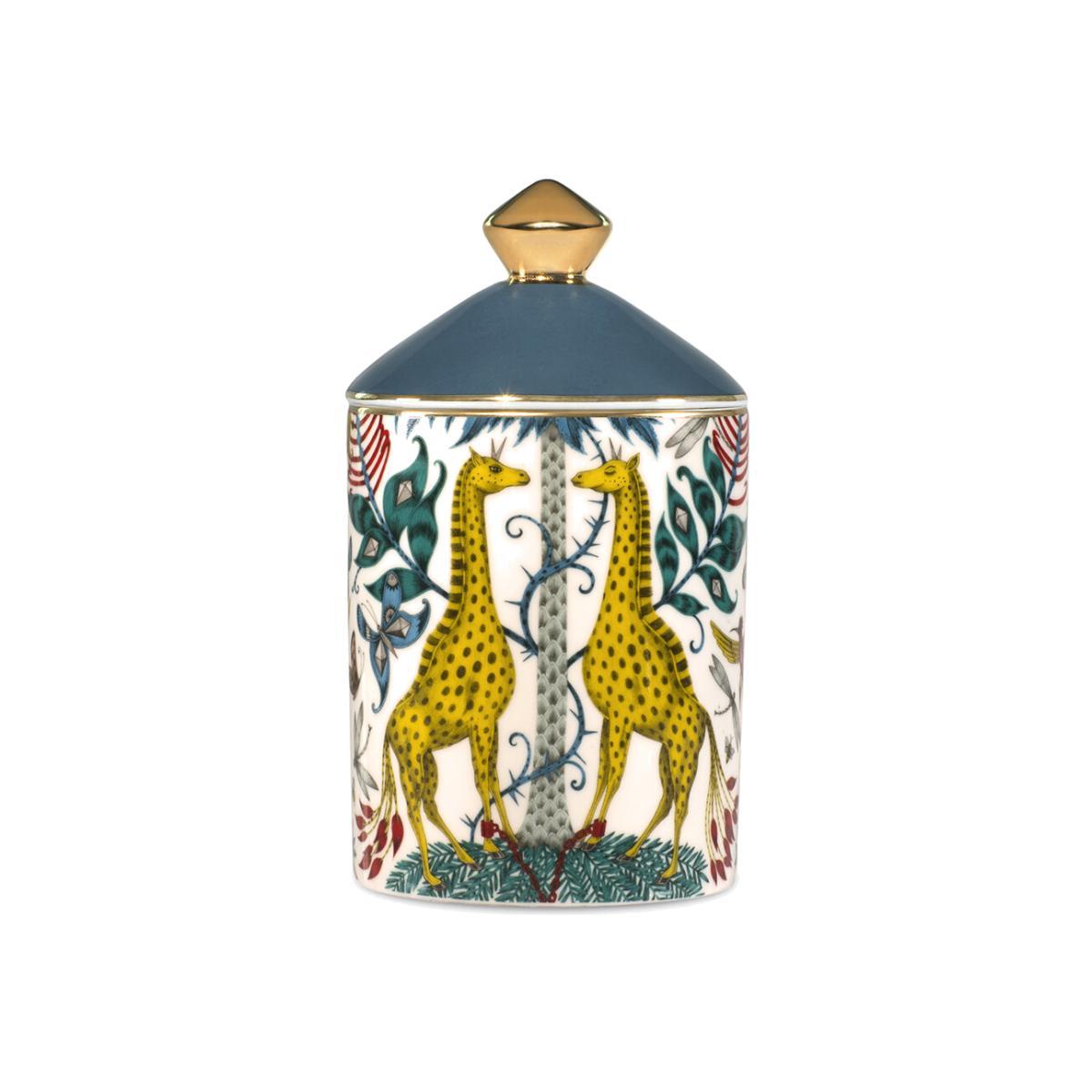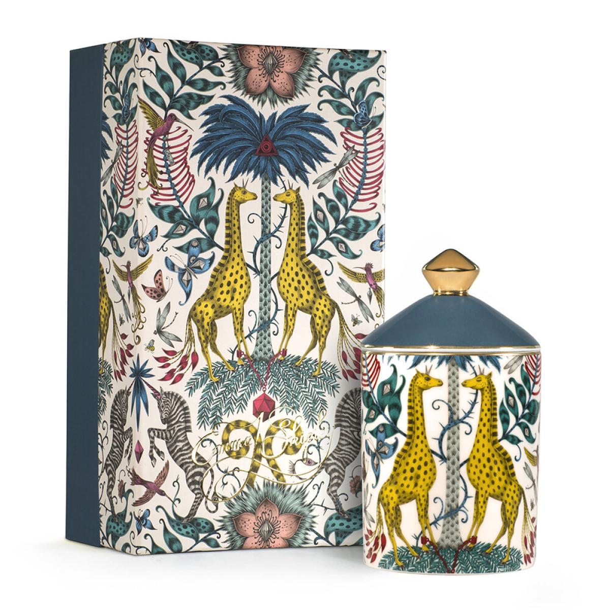 Bring wild fragrance into your home with this Kruger scented candle from Emma J Shipley. Designed in London and encased in a fine bone china vessel, this candle features notes of sandalwood, tonka beans, and vanilla absolute. Designed to complement the exotic Kruger design, inspired by an African safari adventure, and features a fantastical array of creatures and foliage, including spotted giraffes sheltering under tropical palms.