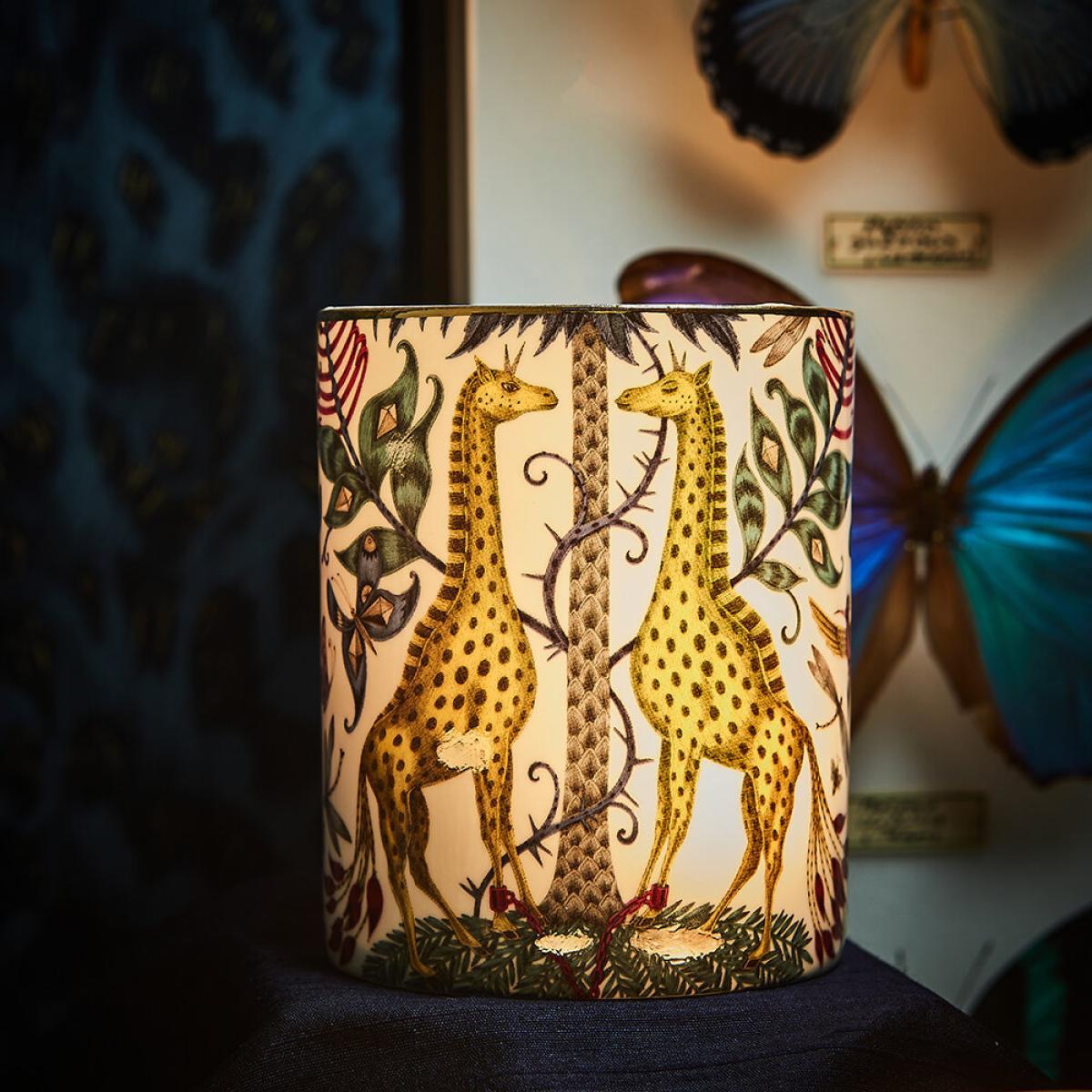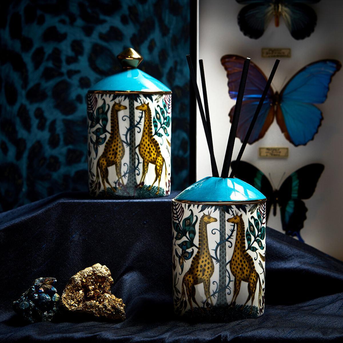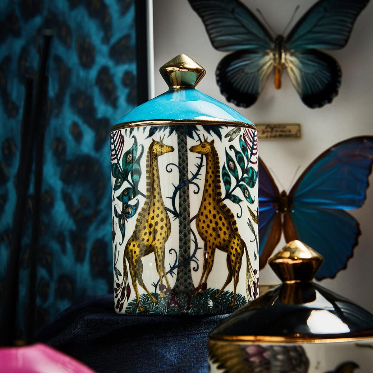 Bring wild fragrance into your home with this Kruger scented candle from Emma J Shipley. Designed in London and encased in a fine bone china vessel, this candle features notes of sandalwood, tonka beans, and vanilla absolute. Designed to complement the exotic Kruger design, inspired by an African safari adventure, and features a fantastical array of creatures and foliage, including spotted giraffes sheltering under tropical palms.