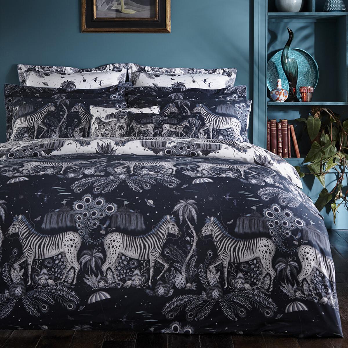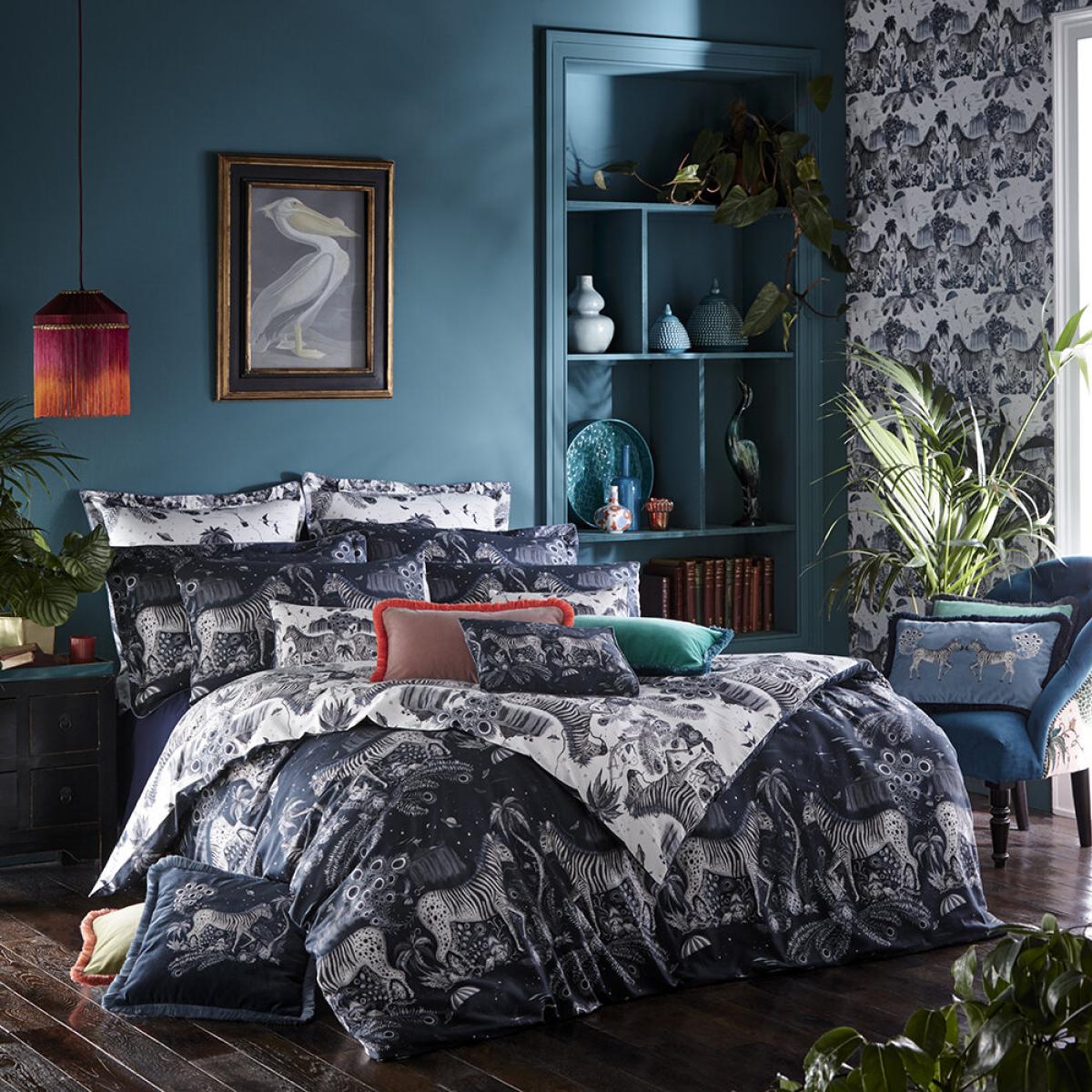 I love the Emma J Shipley duvet in navy for its bold, graphic animal print that adds a striking focal point to the bedroom. It works particularly well in contemporary or eclectic interiors where statement pieces are key. The deep navy tone provides versatility, complementing both neutral and colour-styled schemes. Practical styling tips include pairing it with simple, solid-coloured bed linen to let the print stand out or layering it with textured cushions in contrasting fabrics for added visual interest. Its pattern grants both a luxe and playful touch, making it suitable for a mix of modern, boho, or even minimal spaces looking for that subtle edge.