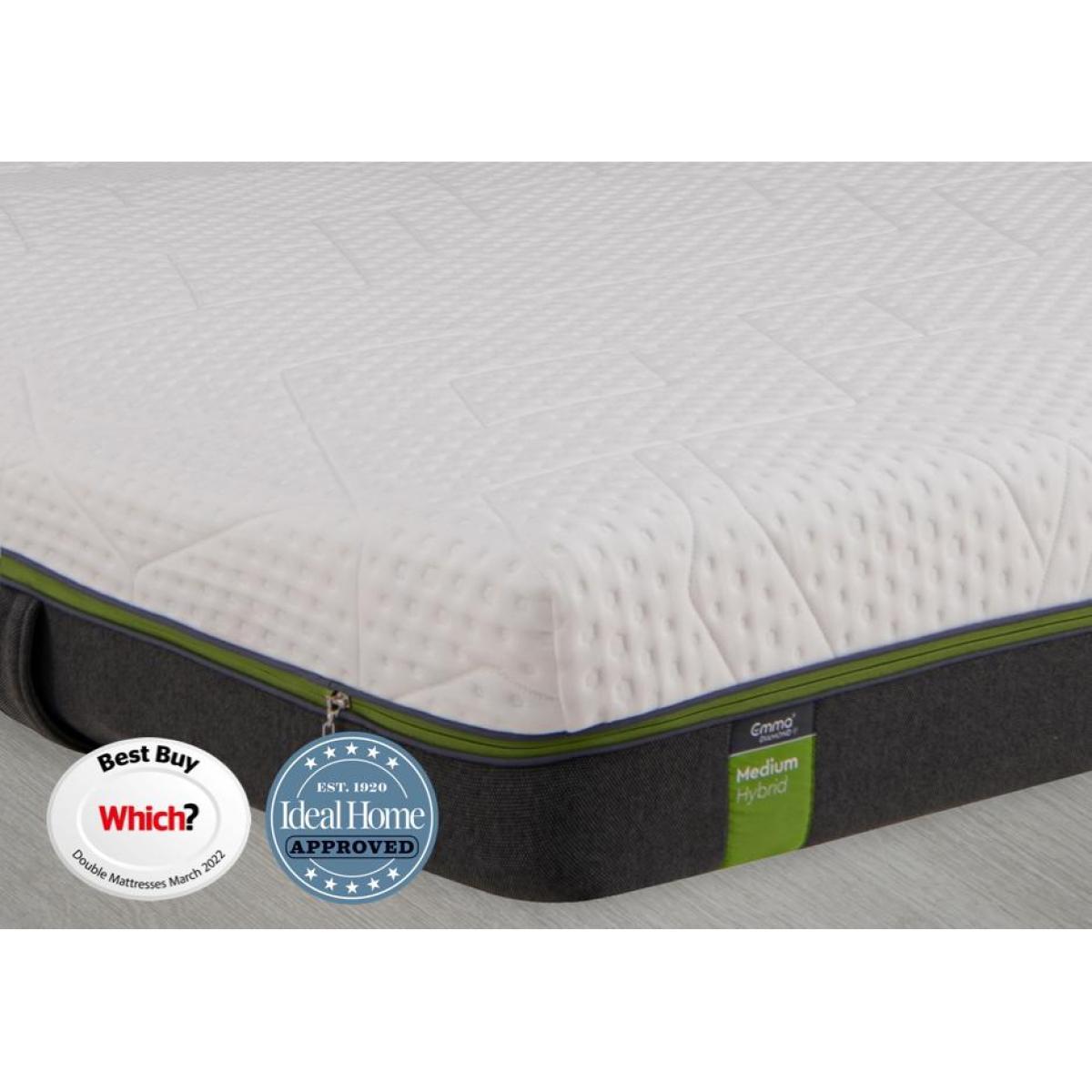 Designed to prolong deep sleep, the Emma Select Diamond Hybrid Mattress uses heat-dissipating graphite particles and a pocket spring core to give you cooling, high-performance comfort night after night. Perfect for those who need restorative and regenerative deep sleep. 5 day delivery. 100 night sleep trial. 20-year guarantee. Revolutionary foam technology with graphite particles prolongs deep sleep phases by dissipating excess body heat. Ideal sleeping temperature is achieved in record time. Adaptive comfort foam provides precise pressure relief. Zoned HRX foam offers optimal body support. Pocket spring core ensures zero motion transfer - ideal for couples. Fully removable premium cover with handles and washable up to 40 C. Anti-slip coating on the underside of the mattress. What you need to know. Mattress type: Hybrid Pocket Sprung. Depth: 25 cm. Firmness: Medium. Fillings: Diamond degree graphite foam, HRX foam, adaptive comfort foam and a pocket spring core. Cover: 99% polyester, 1% elastane. Sizes: Super king, king, double, small double, single. Requires turning: Yes. Turn from head to foot. Mattress care: Air for 4 hours before using to remove any odour. Allow at least 4 hours for mattress to attain its full size. Indentations caused by settlement of fillings or body weight are normal and are not considered defects. If used on a slatted bed frame, slats must be no more than 7 cm apart. Rotate regularly.
