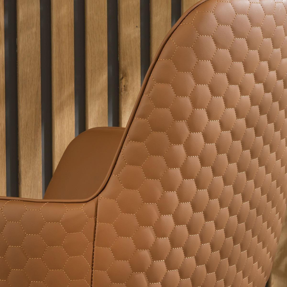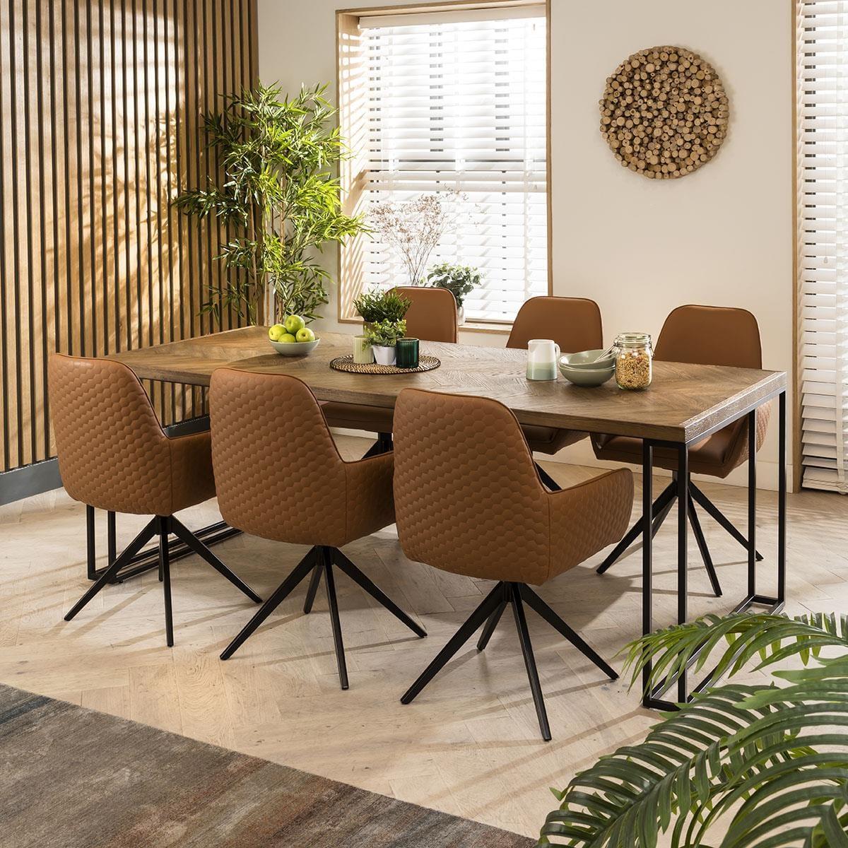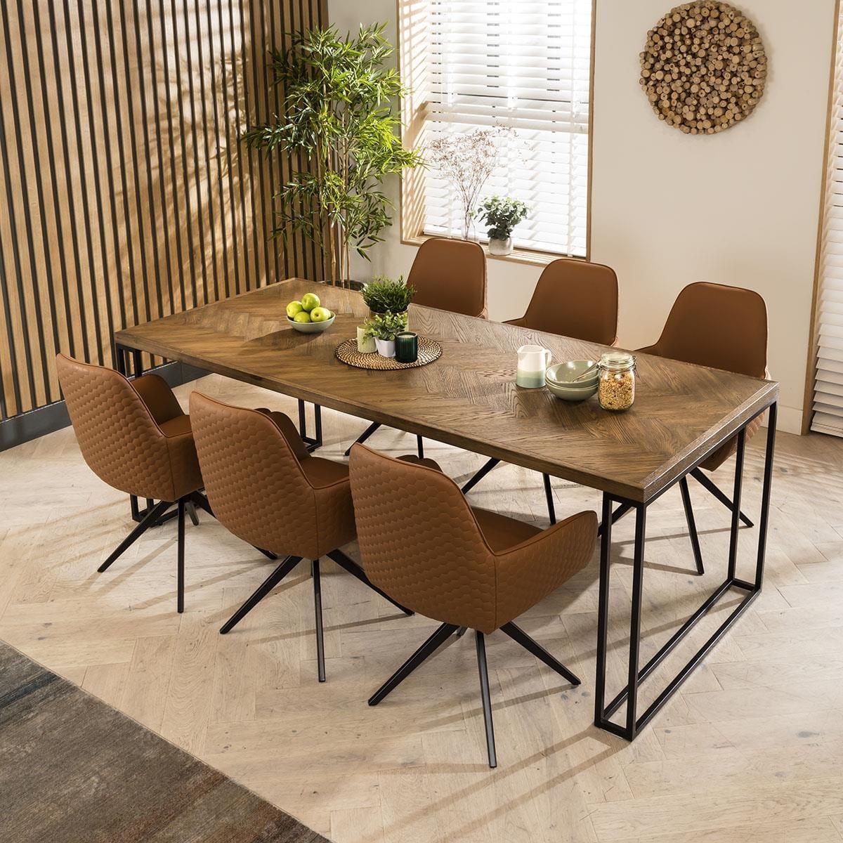 Embrace industrial sophistication with the Emma tan faux leather dining ensemble. At the centre, it's the large 220cm Gemini herringbone solid wooden dining table with six tan faux leather dining chairs, forming a 6 seater dining table and chairs set where industrial charm intertwines with practical sophistication. The modern industrial-style Gemini dining table in this set, a fusion of style and durability. Crafted with solid wood and oak veneer, this spacious 220cm table comfortably accommodates 6 seats. The unique black metal legs support the large tabletop, featuring an industrial parquet herringbone pattern in a premium stained finish. The 6 chair dining set includes the Emma carver dining chairs with arms, crafted with a simple yet thoughtful outline and designed for comfortable dining. Upholstered in easy-clean tan faux leather which adds a touch of opulence to any setting. The dining room chair has a swivel base with a black metal finish for a blend of modern aesthetics and plush comfort. This 6 seater dining set combines modern Emma chairs with the stunning Gemini table. Whether you love the Emma chairs and would like to purchase them individually, or you think the Gemini table would complete your interior scheme better with another chair, you can easily mix and match our modern dining tables and chairs to curate something truly unique. Table Size W220cm D95cm H78cm Chair Size W62cm D62cm H87cm Dining Table And Chair Set For 6