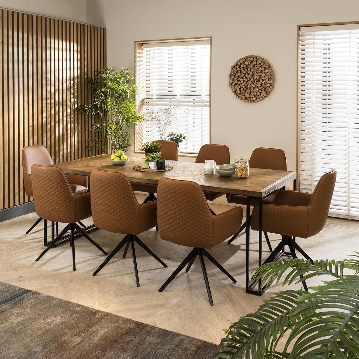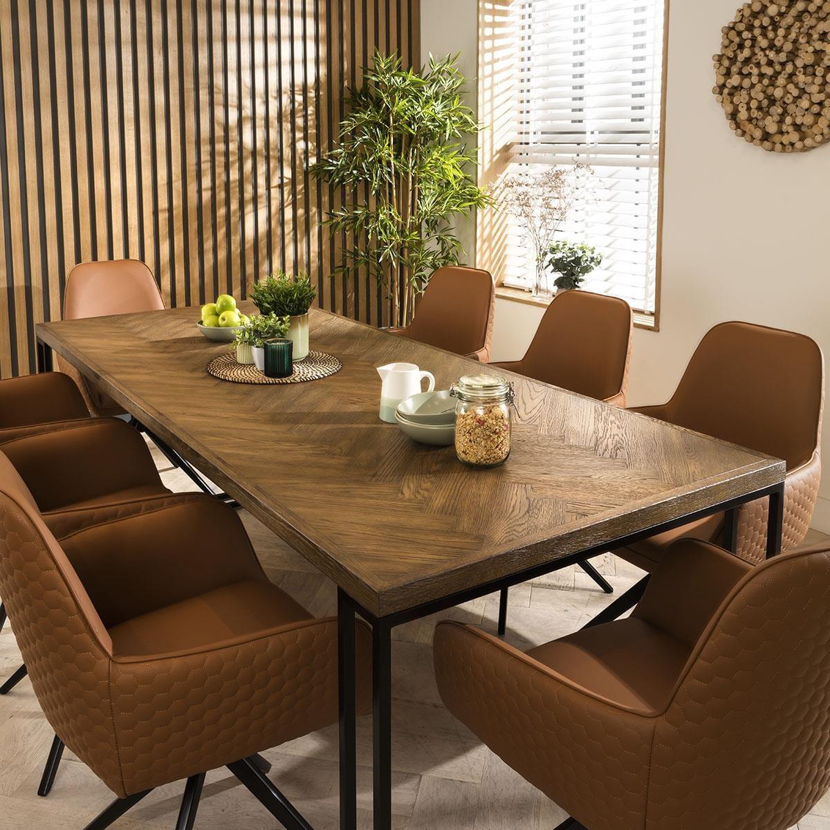 Embrace industrial sophistication with the Emma tan faux leather dining ensemble. At the centre, it's the large 220cm Gemini herringbone solid wooden dining table with eight tan faux leather dining chairs, forming a 8 seater dining table and chairs set where industrial charm intertwines with practical sophistication. The modern industrial-style Gemini dining table in this set, a fusion of style and durability. Crafted with solid wood and oak veneer, this spacious 220cm table comfortably accommodates 8 seats. The unique black metal legs support the large tabletop, featuring an industrial parquet herringbone pattern in a premium stained finish. The 8 chair dining set includes the Emma carver dining chairs with arms, crafted with a simple yet thoughtful outline and designed for comfortable dining. Upholstered in easy-clean tan faux leather which adds a touch of opulence to any setting. The dining room chair has a swivel base with a black metal finish for a blend of modern aesthetics and plush comfort. This 8 seater dining set combines modern Emma chairs with the stunning Gemini table. Whether you love the Emma chairs and would like to purchase them individually, or you think the Gemini table would complete your interior scheme better with another chair, you can easily mix and match our modern dining tables and chairs to curate something truly unique. Table Size W220cm D95cm H78cm Chair Size W62cm D62cm H87cm Dining Table And Chair Set For 8