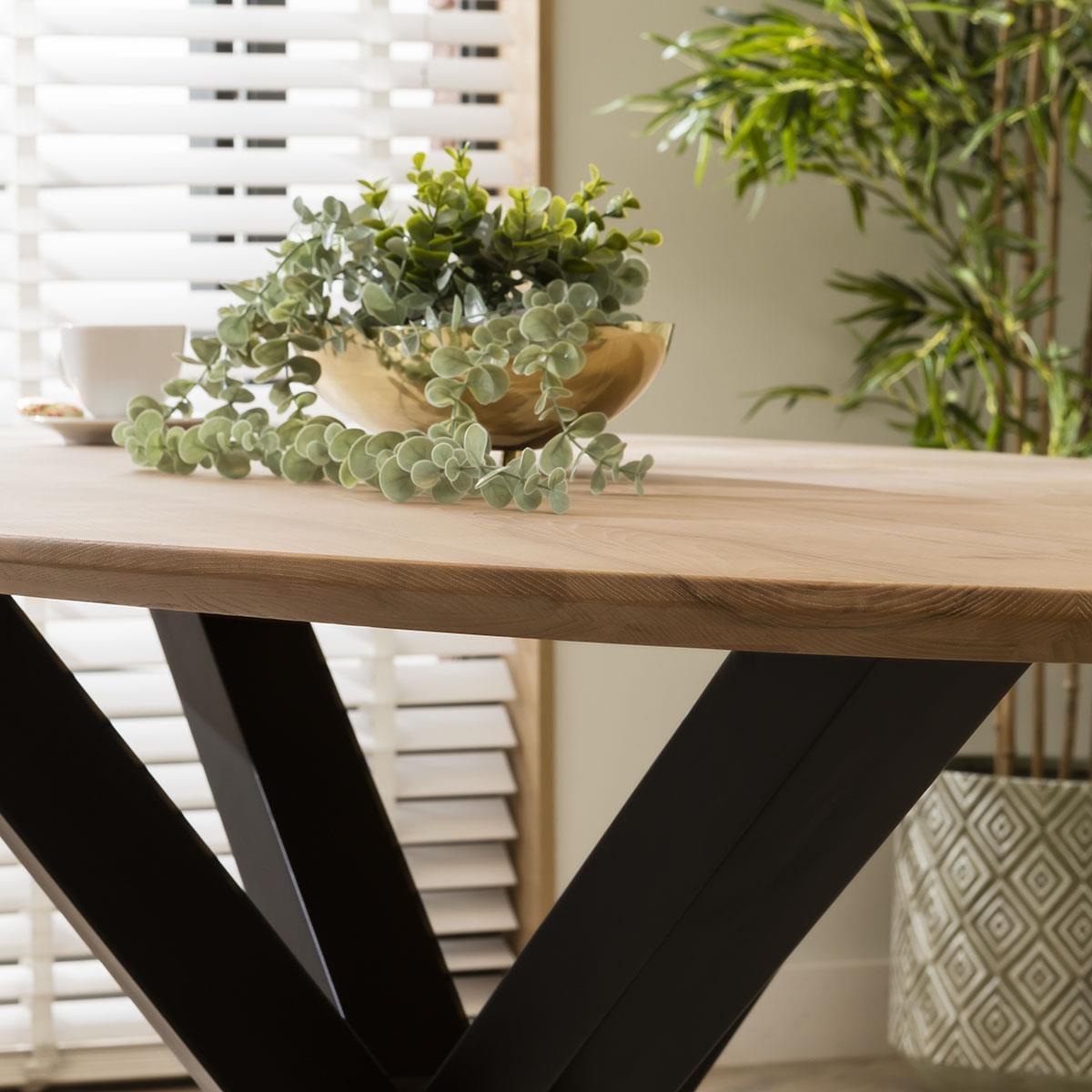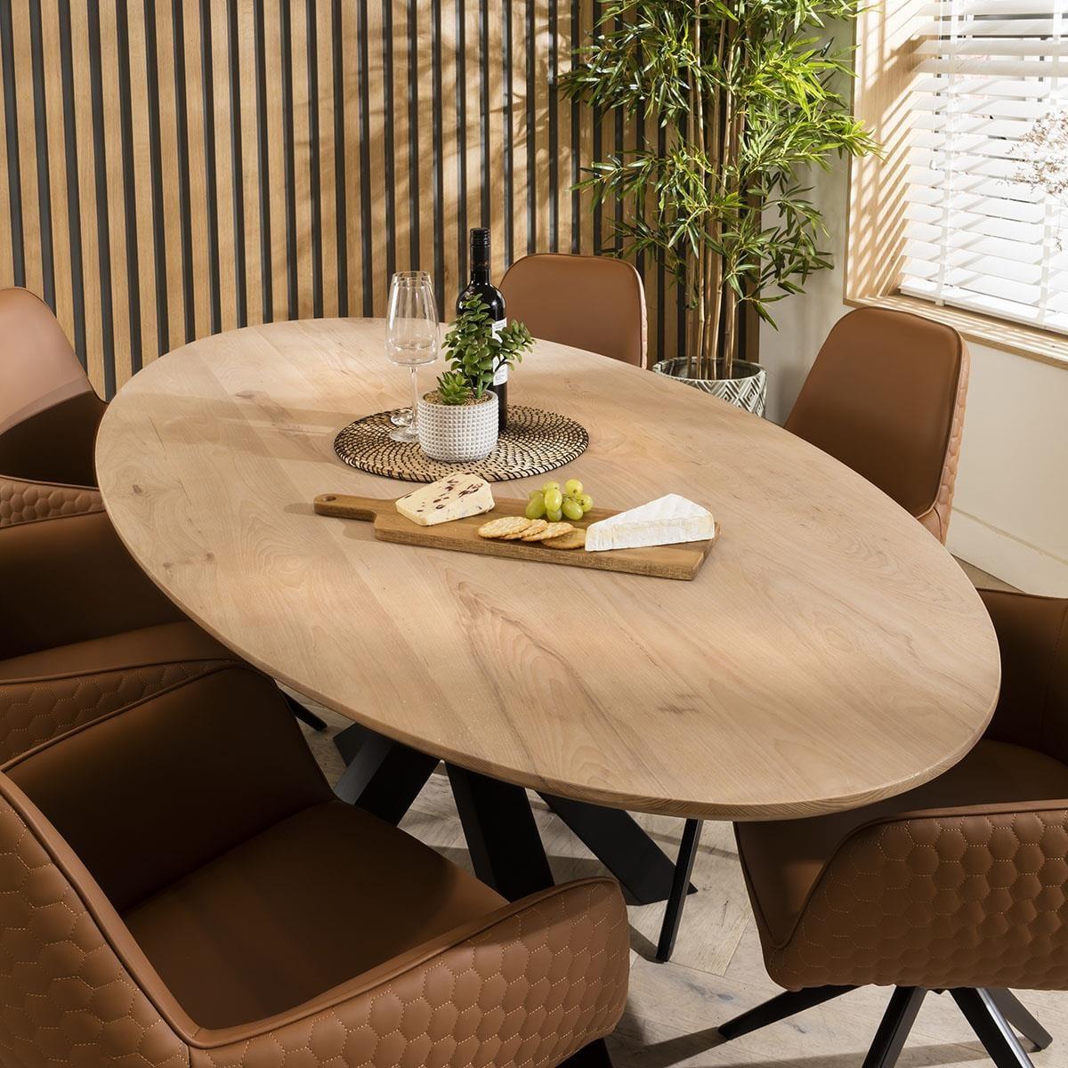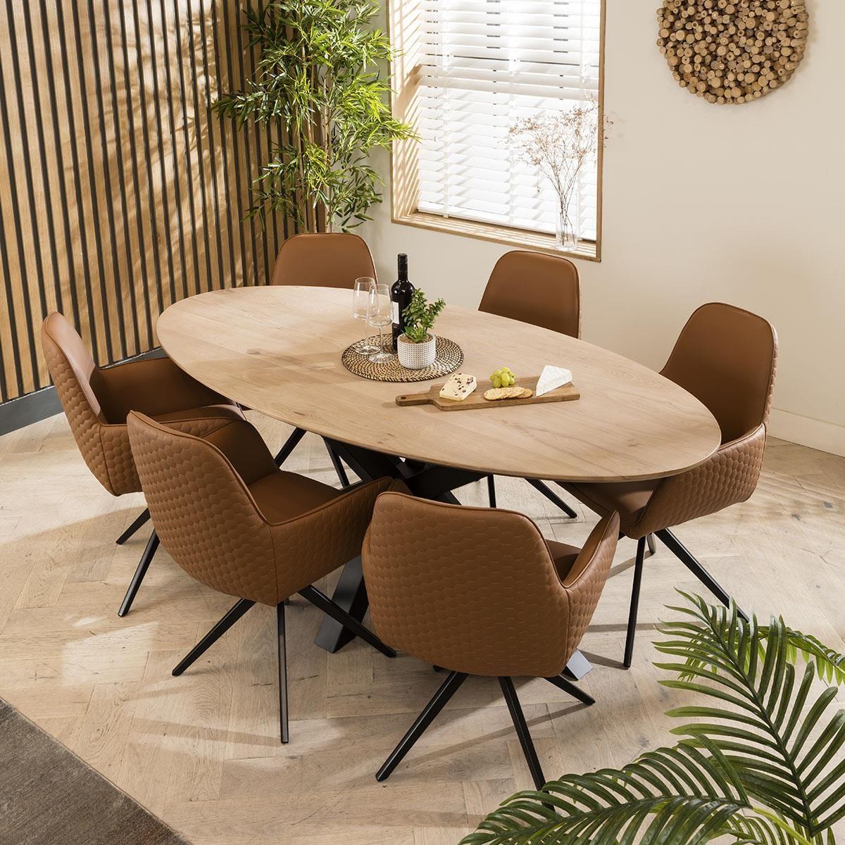 The Emma 6 seater dining set marries modern design with the irresistible allure of rustic charm. The carver dining chairs with arms in a rugged tan faux leather, paired with an oval shaped solid wood dining table with a natural finish, create a look that effortlessly balances contemporary elegance with timeless beauty. The Aries Dining Table included in this dining set is a masterpiece designed to elevate your dining experience. This industrial inspired 6-seater table boasts an elegant oval shape crafted from solid wood, its natural finish showcases the beauty of the wood. The sleek black wood star spider pedestal base supports the premium oval table top. The 6 chair dining set includes the Emma carver dining chairs with arms, crafted with a simple yet thoughtful outline and designed for comfortable dining. Upholstered in easy-clean tan faux leather which adds a touch of opulence to any setting. The dining room chair has a swivel base with a black metal finish for a blend of modern aesthetics and plush comfort. This 6 seater dining set combines modern Emma chairs with the stunning Aries table. Whether you love the Emma chairs and would like to purchase them individually, or you think the Aries table would complete your interior scheme better with another chair, you can easily mix and match our modern dining tables and chairs to curate something truly unique. Table Size W200cm D100cm H78cm Chair Size W62cm D62cm H87cm Dining Table And Chair Set For 6