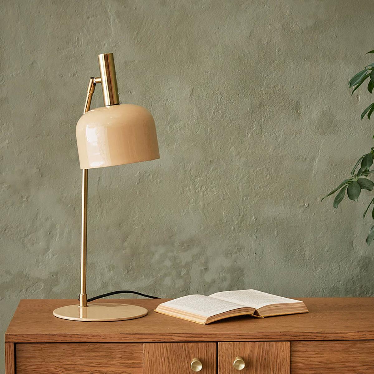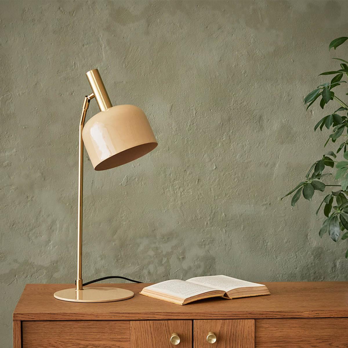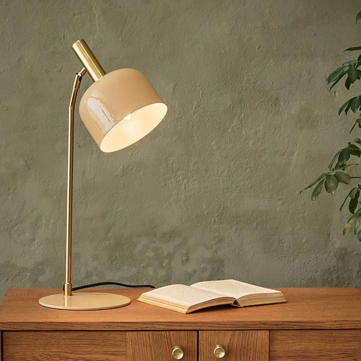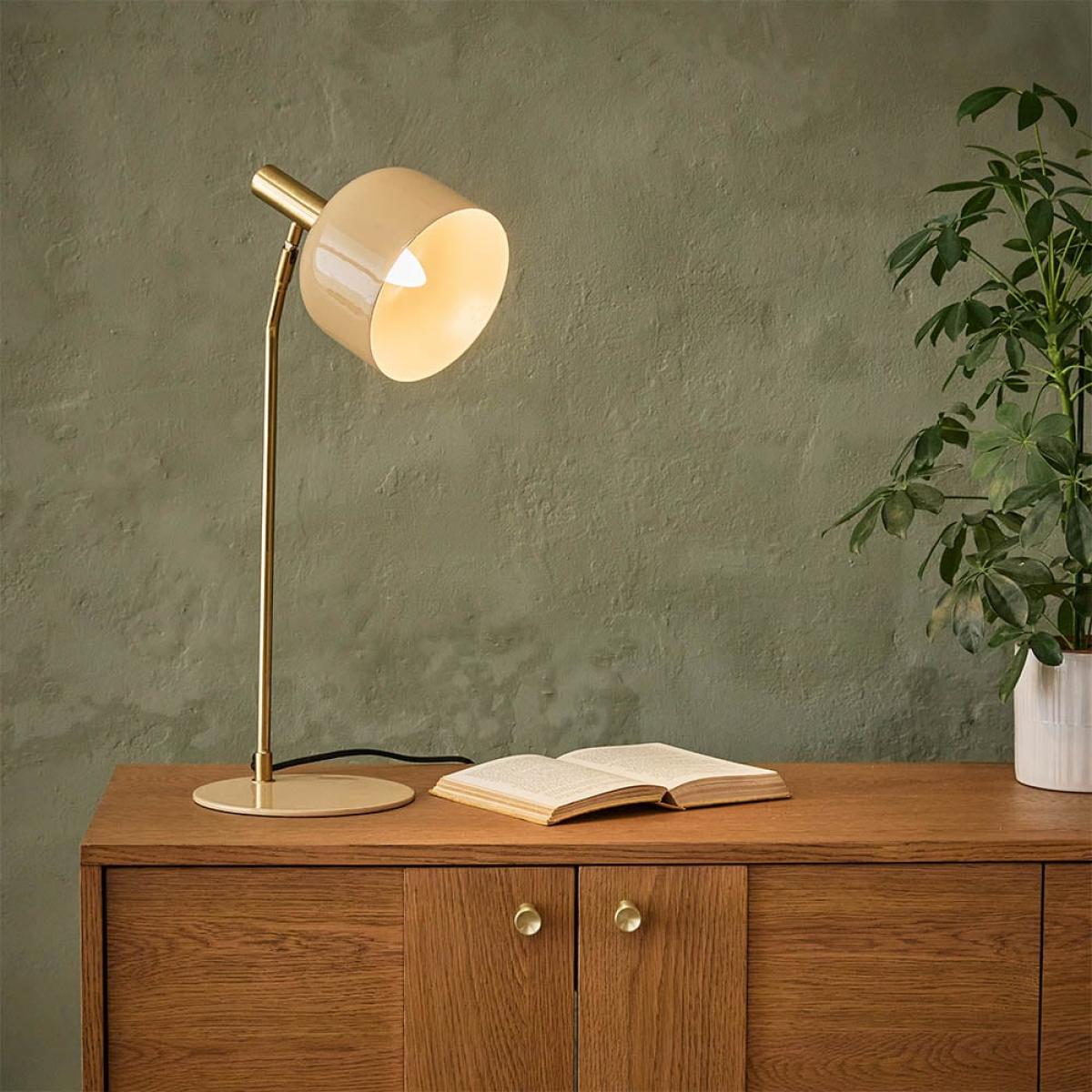 With a high-gloss finish in on-trend latte, this modern table lamp is sure to light up your living room. The glossy swivel shade and flat metal base are complemented by an elegant brass stem and fabric-covered cable, while the head can be easily adjusted to shine light where it’s needed. Emma is perfect for adding a little elegance to your desk. Also available in olive green.