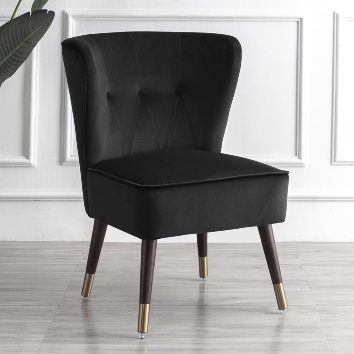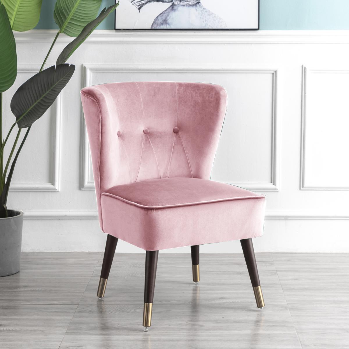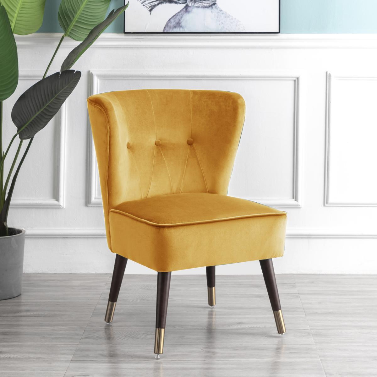 The Emmeline Accent Chair is a relatively new addition to our range that has proved instantly popular with our customers. The chair is constructed from solid hardwood and foam covered for comfort. The chair is then upholstered with a velvet fabric which is complimented by classical studded detail on the back and long, slender wooden legs with a brass-effect tip. This chair is ideal for any room in your home to both provide additional seating and add a little colour to your decor.