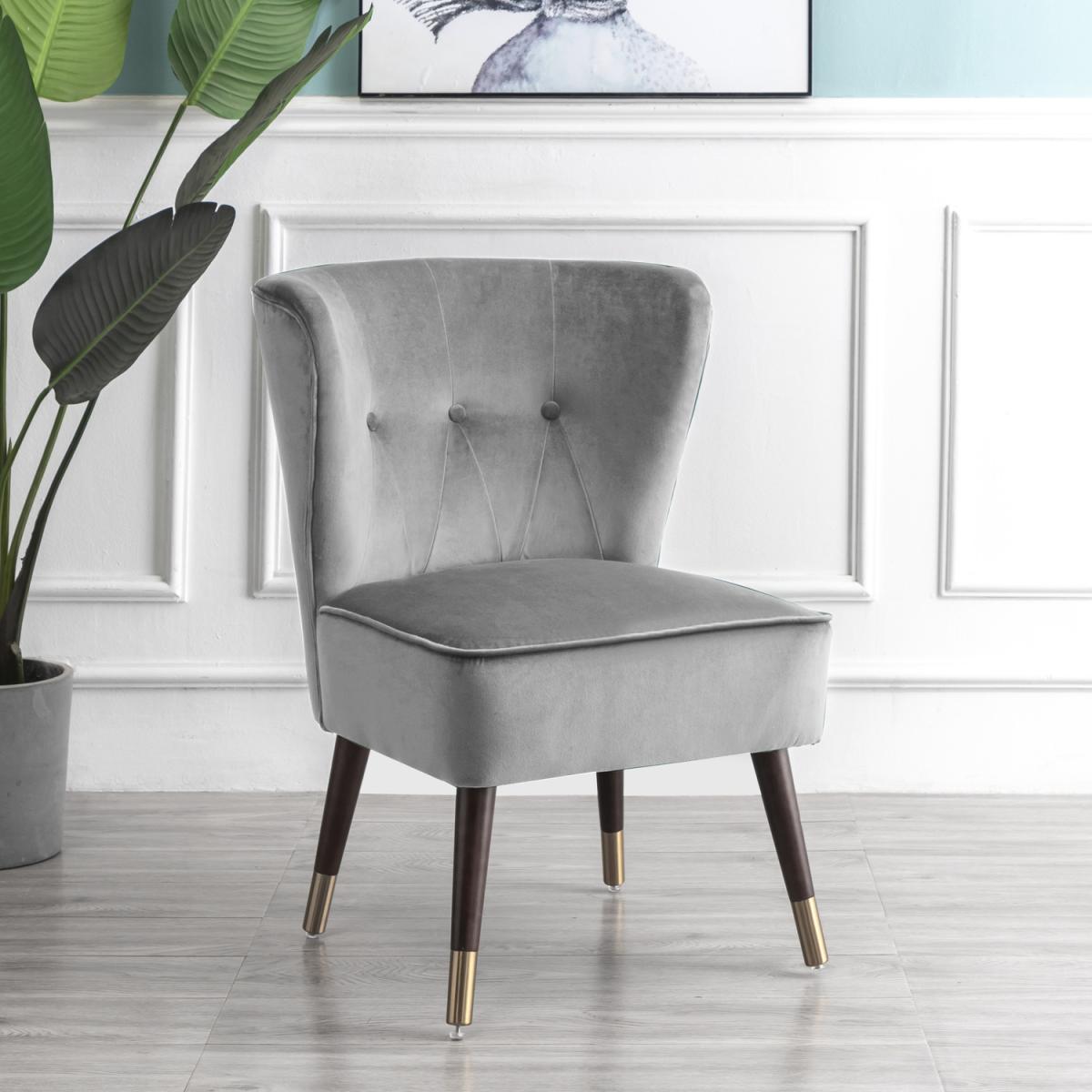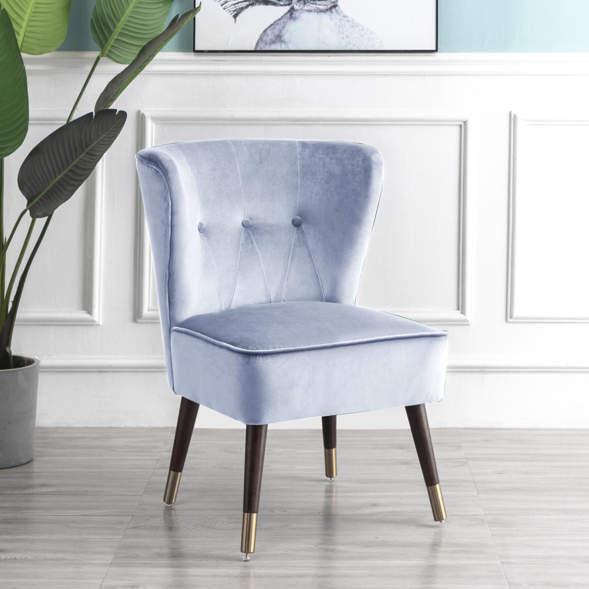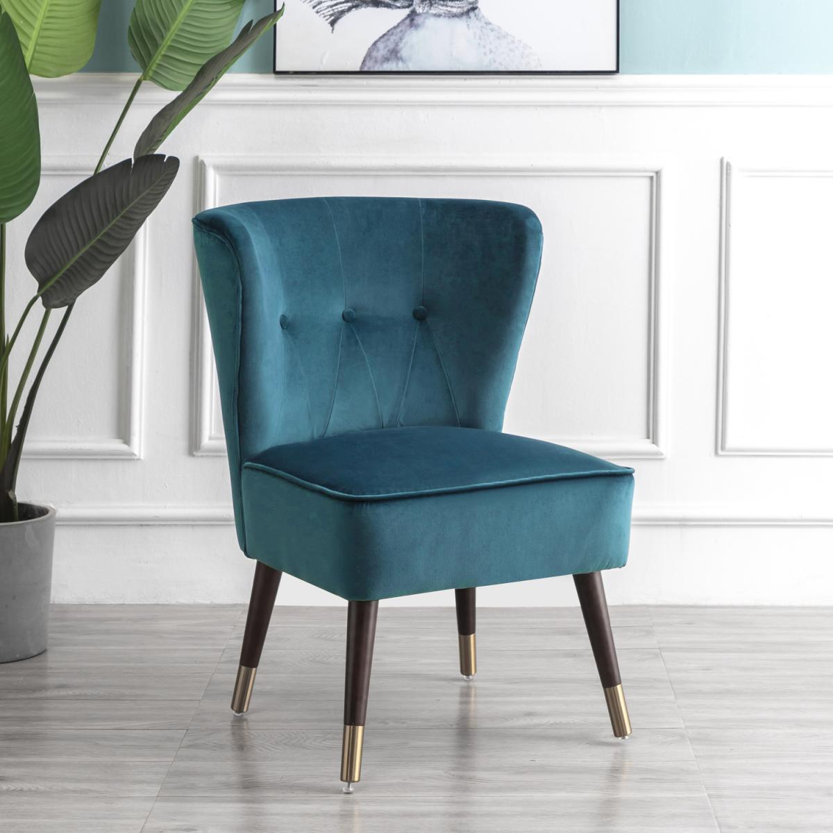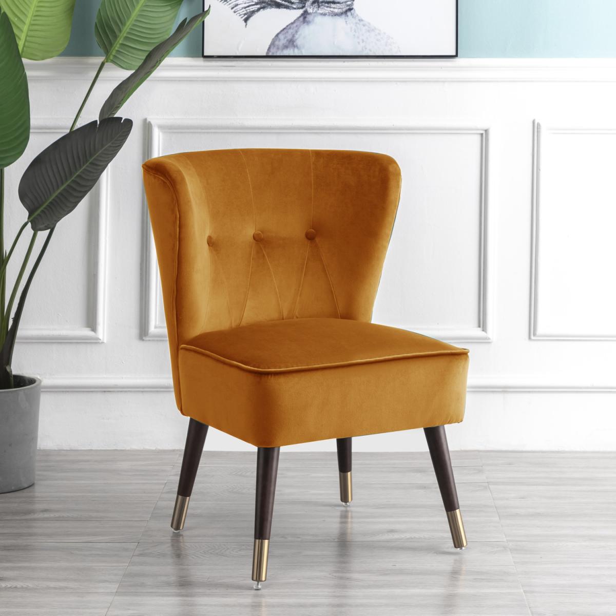 The Emmeline Accent Chair is a relatively new addition to our range that has proved instantly popular with our customers. The chair is constructed from solid hardwood and foam covered for comfort. The chair is then upholstered with a velvet fabric which is complimented by classical studded detail on the back and long, slender wooden legs with a brass-effect tip. This chair is ideal for any room in your home to both provide additional seating and add a little colour to your decor.