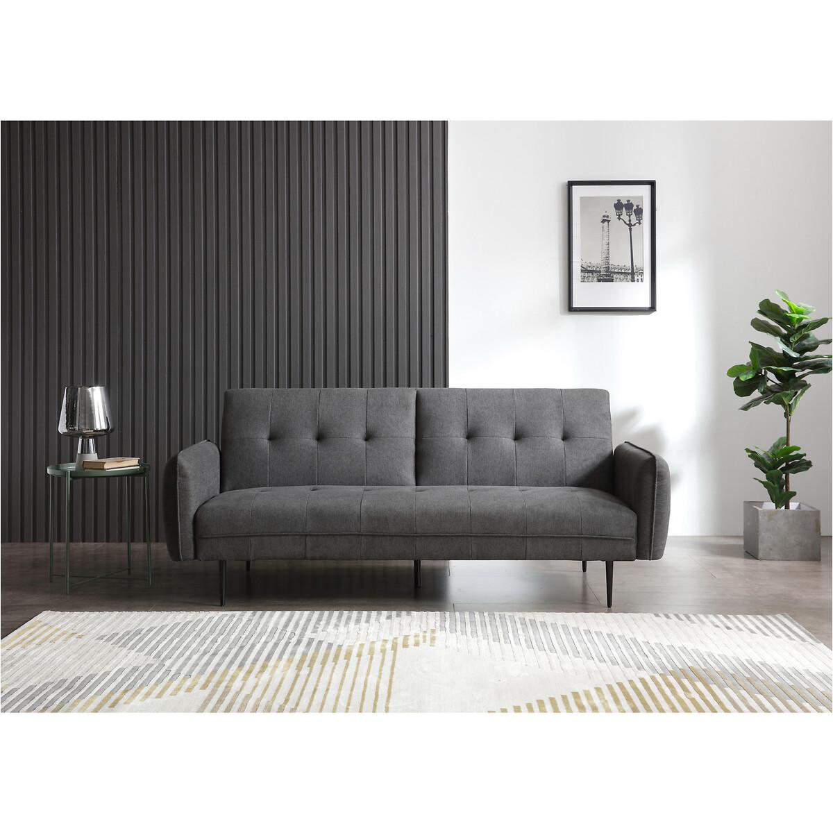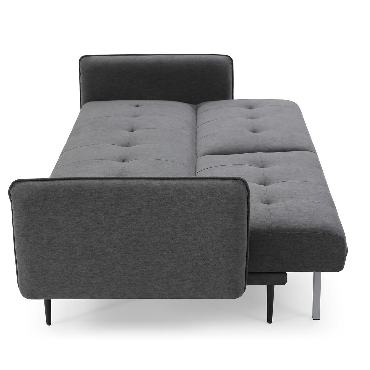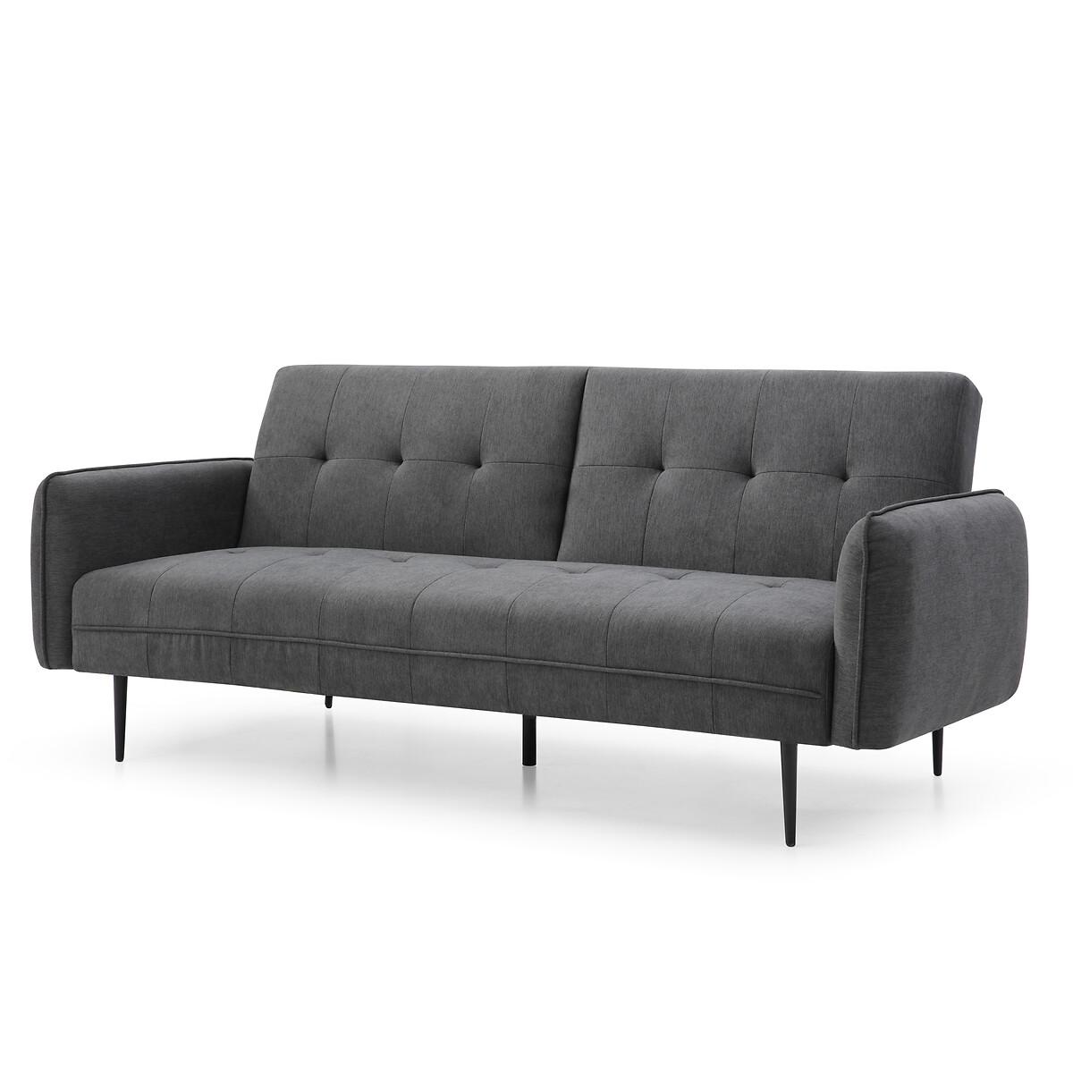 A click-clack futon style sofa bed which folds down to create a sleeping space in just one click! This comfy sofa features soft textured weave fabric complemented by slim metal legs. Envelope finishings and tufted button detail add a contemporary touch. Product details• Soft Textured Weave upholstery with a faux linen look• Matte black tapered legs• Tufted detailing on back and seat• Piped detaliing on arms• Seats 3• Click Clack mechanism• EUTR Compliant, BS5852 compliant• 1 Year Warranty. Product Composition • Fabric - Soft Textured Weave (100% Polyester)• Fillings - foam• Legs - Metal legs• Frame- Eucalyptus & Plywood. Product Dimensions Overall width - 91 cm Overall depth - 210 cm. Overall height - 88 cm Weight - 39 KGSeat Height - 43 cm. Seat Width-175 cm. Seat Depth - 54 cm. Back Height - 51 cm. Arm Height - 68cm. Leg Height - 20cm. Sofa Bed Sleeping Area Dimensions - W175 cm x D112 cm Package Dimensions - 181 cm x 115 cm x 27 cm, Weight 42 kg. Please remember to measure your available space before ordering. This product will be dispatched by one of our trusted suppliers. You’ll be contacted by their selected courier about your delivery. Please note: this product cannot be delivered to all Offshore Islands, Northern Ireland or Republic of Ireland. KYOTO01