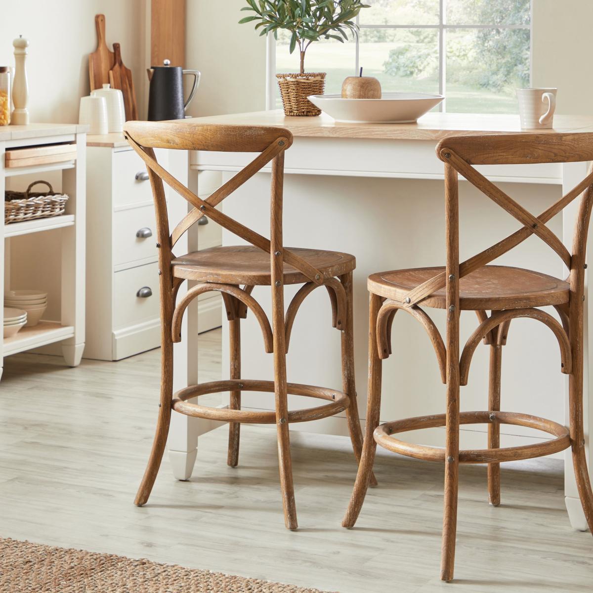 I’m a fan of this oak bar stool for its robust cross-back design and warm brown tone - it brings a relaxed, lived-in feel without leaning too rustic. The bentwood curves and sturdy footrest make it comfortable for everyday use, while the matt finish keeps things contemporary rather than shiny or overly polished. It sits equally well in a pared-back Scandi kitchen or a countryside-inspired breakfast bar. Style it with textured linen seat cushions in muted shades or layer a slim runner rug underneath to define the seating area. Group in odd numbers along your island for an effortlessly balanced look.