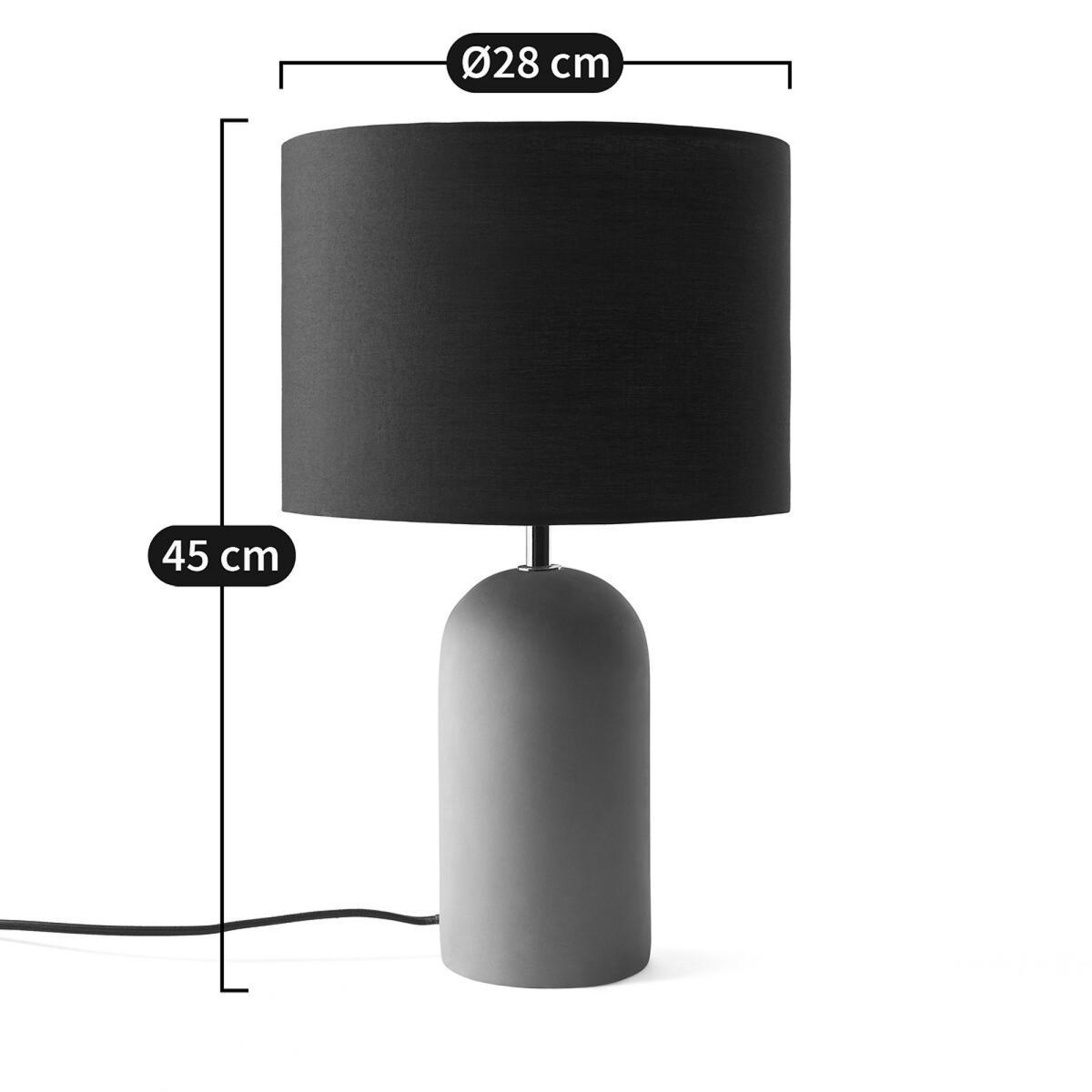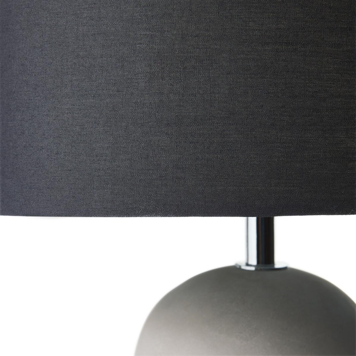 You'll love the urban, contemporary feel of this concrete table lamp. The combination of cotton lampshade and concrete base has a truly modern feel!Product Details. Base in clay-coloured raw concrete, bottle-shaped. Black cotton shade. E27 socket suitable for compact fluorescent bulb, 15W max (not included). Compatible with bulbs of energy classes: A Dimensions. Diameter: 28cm. Height: 45cm Shop the full lighting collection online.. Dimensions and weight of parcel 1 box. 40 x 33.5 x 37 cm. 3.6 kg.