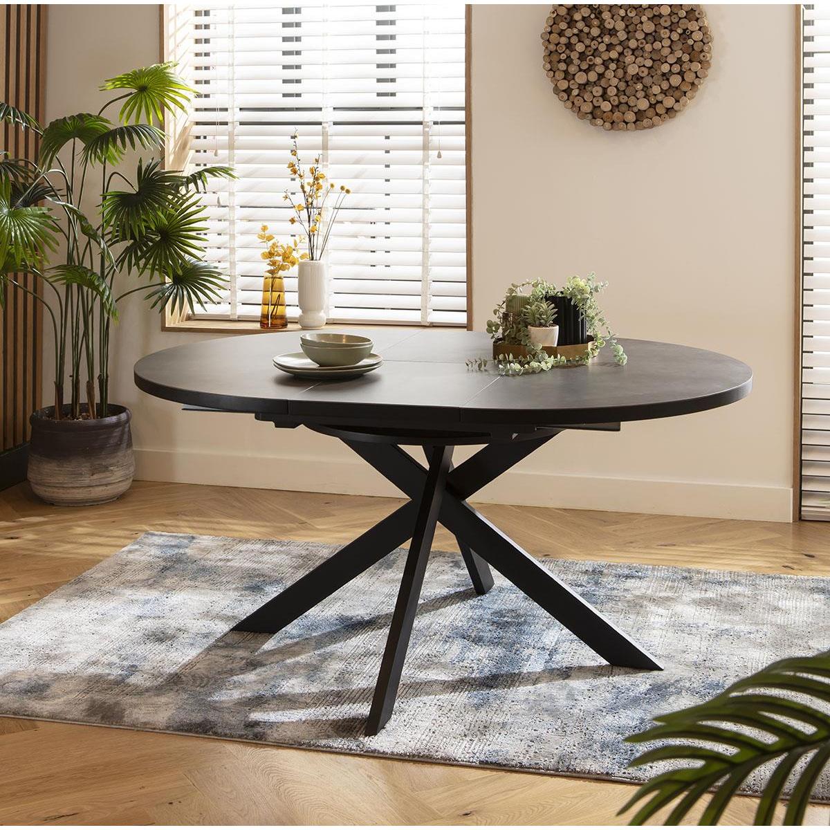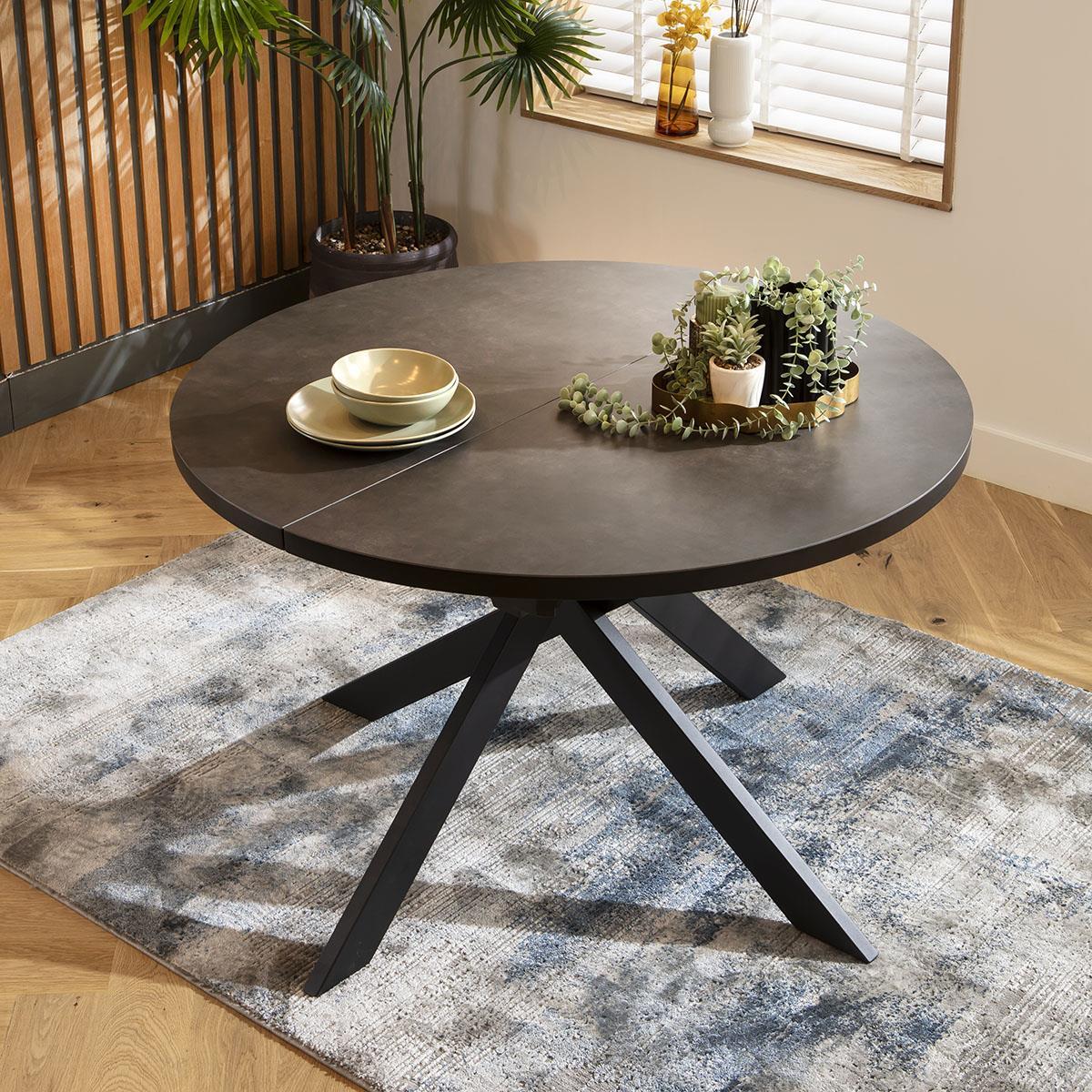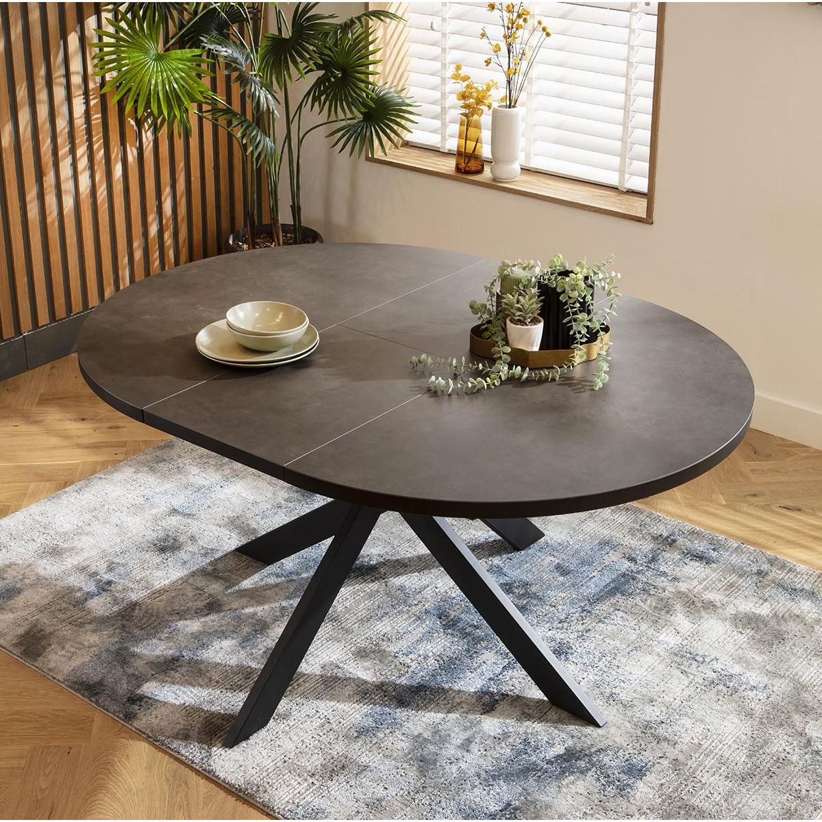 This modern extendable dining table features a unique one-hand opening extension, transitioning from a round 120cm to an oval 160cm dining table for 6. The super durable ceramic tabletop is scratch, stain and heat resistant - imported from Italy, it boasts a stunning marble effect with a grey gloss finish. Crafted for both style and longevity, this ceramic dining table showcases a premium build quality. The star base design, made from black powder-coated metal, provides robust support and industrial sleek appeal. The extending mechanism is seamlessly integrated into the tabletop, ensuring effortless operation and lasting performance. The Italian-imported ceramic tabletop features a sophisticated marble effect in a chic grey finish. This grey extendable dining table adds a touch of luxury and elegance to your dining space. The ceramic surface is not only beautiful but also highly practical, being scratch, stain, and heat resistant, making it perfect for everyday use. Our extendable dining table is designed for straightforward assembly. Clear instructions and all necessary hardware are included, making setup a breeze. Enjoy your new modern dining room table in no time, knowing its built to last and enhance your home with its luxurious and functional design. W120-160cm D120cm H76cm Ceramic is scratch, stain and heat resistant Dining Table for 6