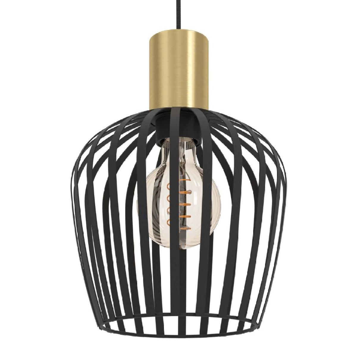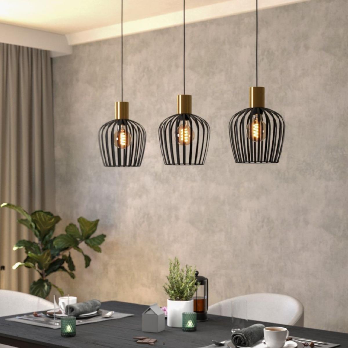 Empoli 3-light pendant ceiling light, featuring three caged shades made from black steel and brushed brass fittings. A captivating blend of industrial design and modern elegance, this pendant light features three caged shades, each crafted from durable black steel, creating a bold and contemporary look that enhances any room decor. The caged design allows the light to shine through beautifully, casting intriguing patterns and shadows that add visual interest to your space. Each of the three shades is complemented by a brushed brass fitting, adding a touch of warmth and sophistication. The contrasting materials and finishes create a balanced aesthetic, making the Empoli pendant bar a versatile addition to various interior styles, from industrial to modern and eclectic. Ideal for kitchens, dining areas or living spaces, the Empoli pendant bar provides ample illumination while serving as a striking statement piece. The trio of caged shades ensures even light distribution, enhancing both functionality and style in your home. Empoli 3-light pendant ceiling light, featuring three caged shades made from black steel and brushed brass fittings. A captivating blend of industrial design and modern elegance, this pendant light features three caged shades, each crafted from durable black steel, creating a bold and contemporary look that enhances any room decor. The caged design allows the light to shine through beautifully, casting intriguing patterns and shadows that add visual interest to your space. Each of the three shades is complemented by a brushed brass fitting, adding a touch of warmth and sophistication. The contrasting materials and finishes create a balanced aesthetic, making the Empoli pendant bar a versatile addition to various interior styles, from industrial to modern and eclectic. Ideal for kitchens, dining areas or living spaces, the Empoli pendant bar provides ample illumination while serving as a striking statement piece. The trio of caged shades ensures even light distribution, enhancing both functionality and style in your home.