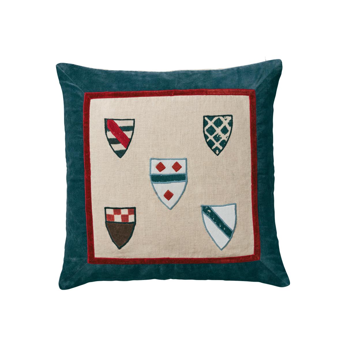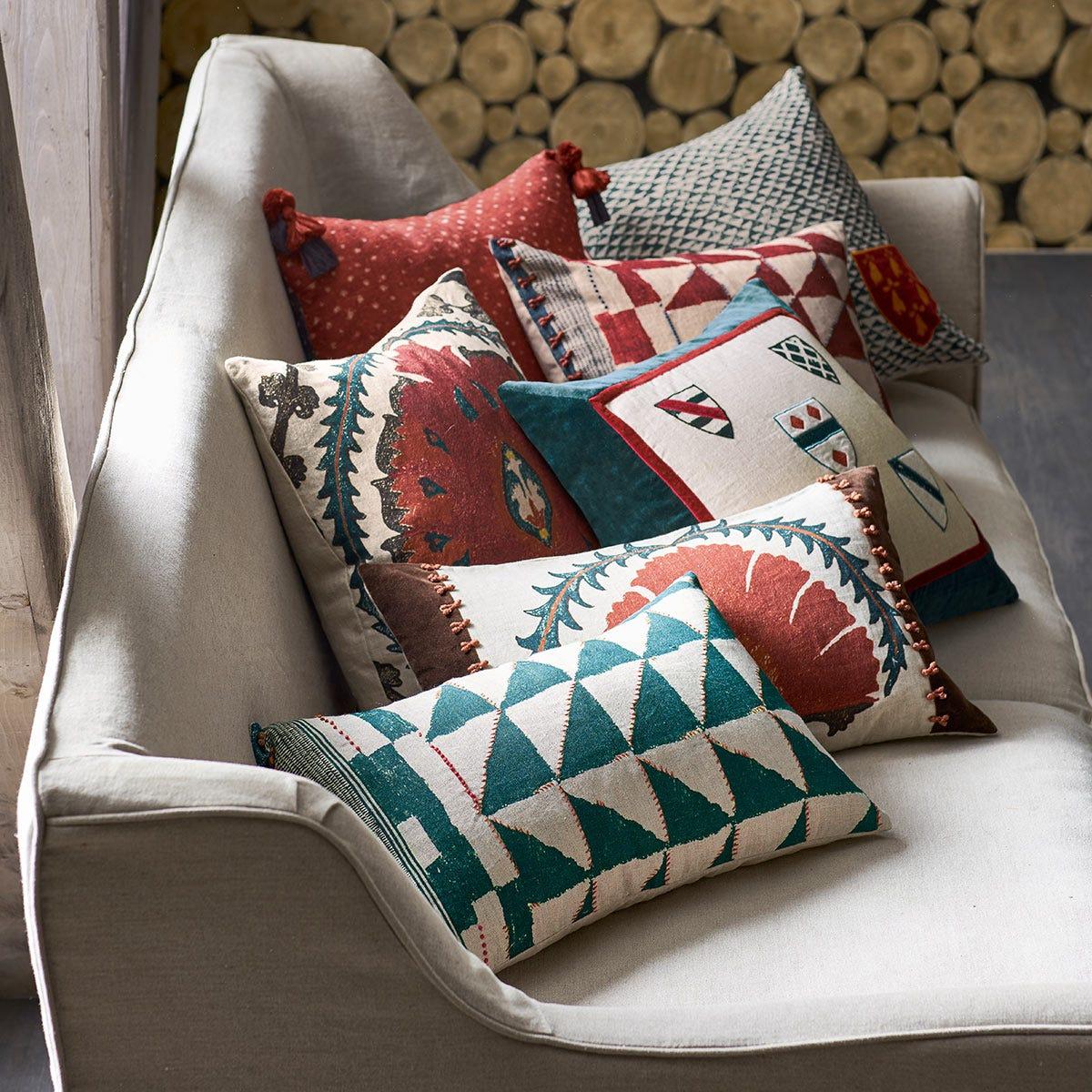 Sue's collection was initially inspired by scraps of old fabric. She wanted each cushion to look as though it had been cut from a large tapestry. The result is a combination of textures and finishes, using velvet, silk, over-stitching and braids. The majority of the collection is crafted from 100% linen, though some have a combination of linen and velvet and some are entirely made of velvet. Emre Cushion Cover - Multi