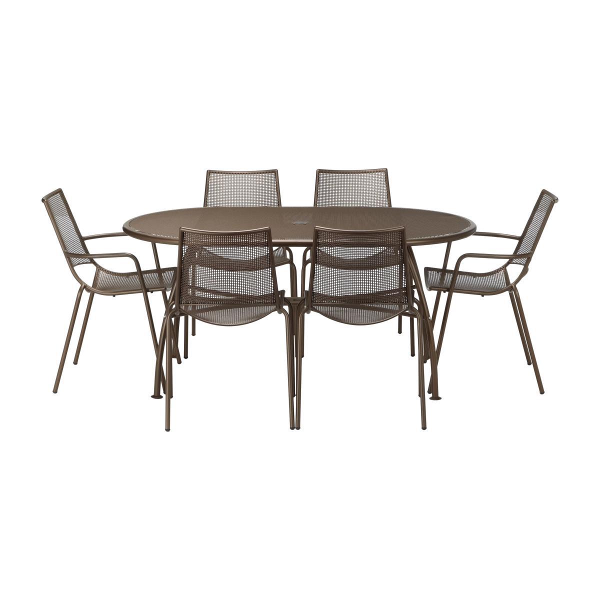 The Ala Mesh garden dining set is ideal for entertaining in the sun, with six dining chairs and a six-seater table designed in a bronze-coloured mesh for a contemporary look. The chairs are created using interwoven sheet metal, with a softly curved shape that ergonomically conforms to the body for a comfortable sit, even without a cushion. Made from powder-coated steel mesh, the frames are long-lasting, robust and remain rust-proof as long as they're undamaged. The set can be left outside all year round but it's recommended to use a protective cover during winter months. The chairs can be stacked for easy storage and maintenance. Seating in this furniture range has been tested to withstand a weight of 20 stone (127kg), exceeding the industry standard. Two of the chairs have armrests. Key benefits: Dining table and 6 stackable chairs Robust powder-coated steel frames Ergonomic design for comfort Part of the Ala Mesh range of garden furniture Want to see it first? You may want to see and get a feel for the furniture in one of our shops before ordering. We'll be able to tell you where the range you'd like to view is on display.