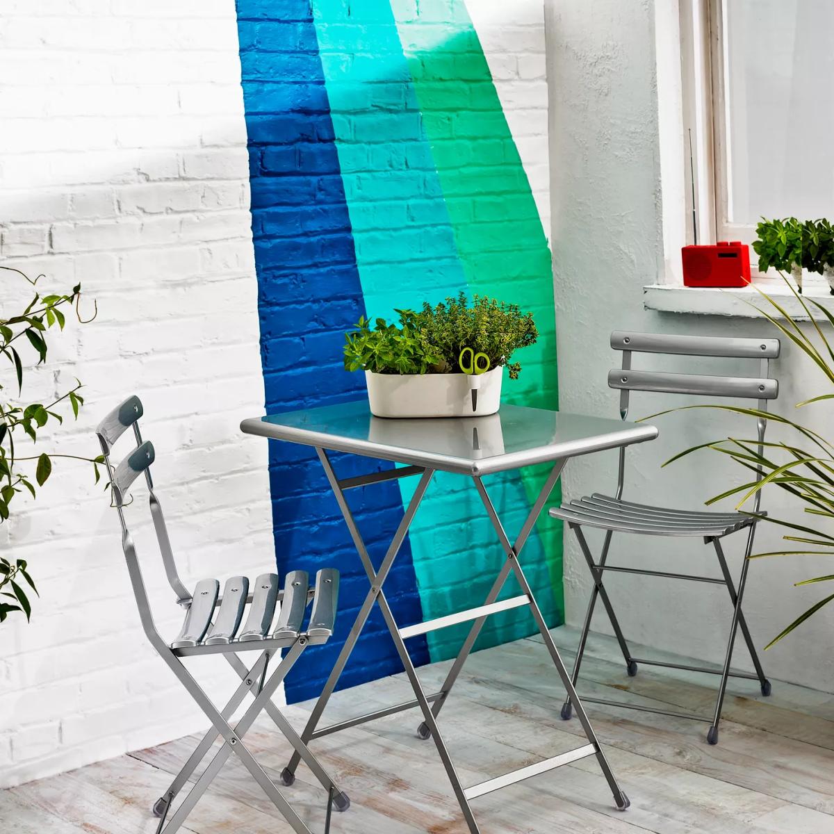 This handy two seater dining set makes enjoying the outdoors simple this summer. Perfect for entertaining in the sun in any outdoor space, no matter how small, it's lightweight and compact and folds away for easy storage. The sturdy steel frame is treated with EMU-Coat, a 4-layer electroplated coating, giving it a tough and scratch resistant all-weather finish suitable for outdoor use all year round. Long-lasting and functional, this lovely set makes dining outdoors easy. Dimensions Chairs: H81 x W42.5 x D43cm Table: H74 x W70 x D50cm. Good to know: To keep the set in good condition for years to come, we recommend storing it indoors and in a dry place during the winter. Before the winter and on a quarterly basis, if your home is near the sea, it's best to clean the metal surfaces with a soft cloth using water or detergent and protect them from the salty sea air with Vaseline oil or car wax. Want to see it first? You may want to see and get a feel for the product in one of our shops before ordering. We'll be able to tell you where the range you'd like to view is on display.