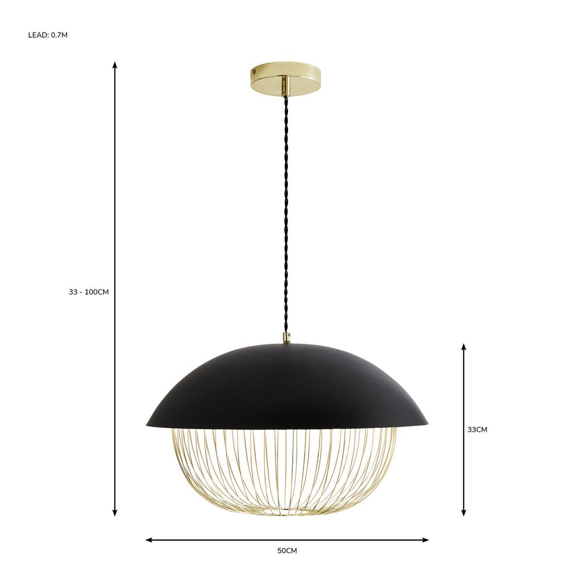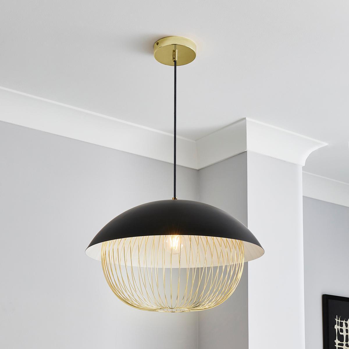 * Bulb required: 1 x 4W LED GLS ES (Edison screw) - E27* Bulb not included* Dimmable compatible* Height adjustable* Matching family items* Available in a smaller size* 2 year guarantee Add a contemporary feel to your home with this modern Emzo Ceiling Fitting. Crafted with a stunning black painted shade, finished with a striking gold metal cage and a gold ceiling fitting. This stunning ceiling fitting is complete with a height adjustable black cable. This piece is dimmable with a compatible bulb and light switch. Matching Emzo family items are available to help coordinate your décor.
