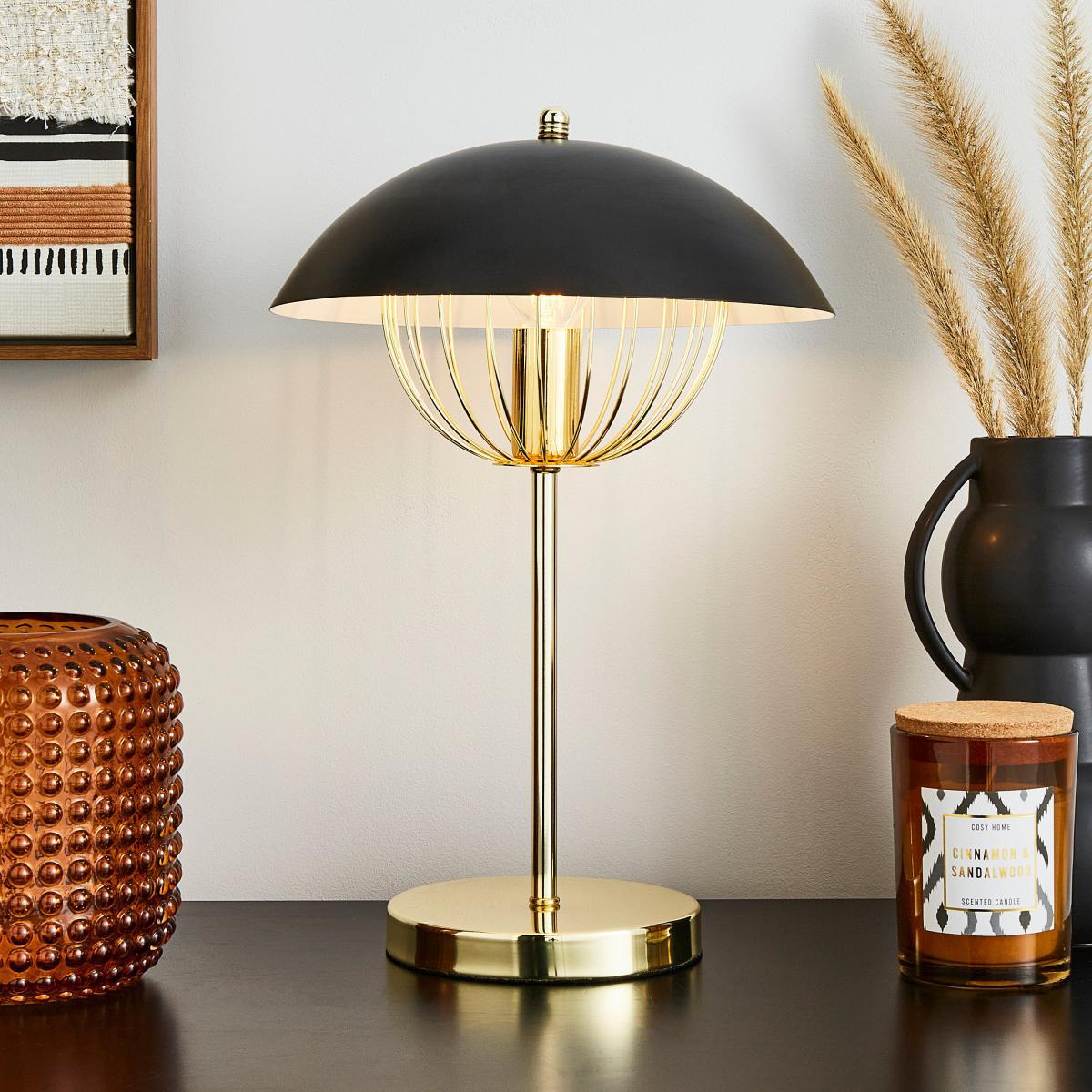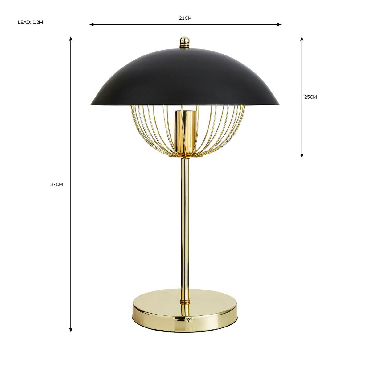 This modern Emzo table lamp is perfect for adding a contemporary feel to your home. Crafted with a stunning black painted shade, finished with a striking gold metal cage and a gold metal base. This stunning table lamp is complete with a 1. 2m cable in line switch. Matching Emzo family items are available to help coordinate your décor.