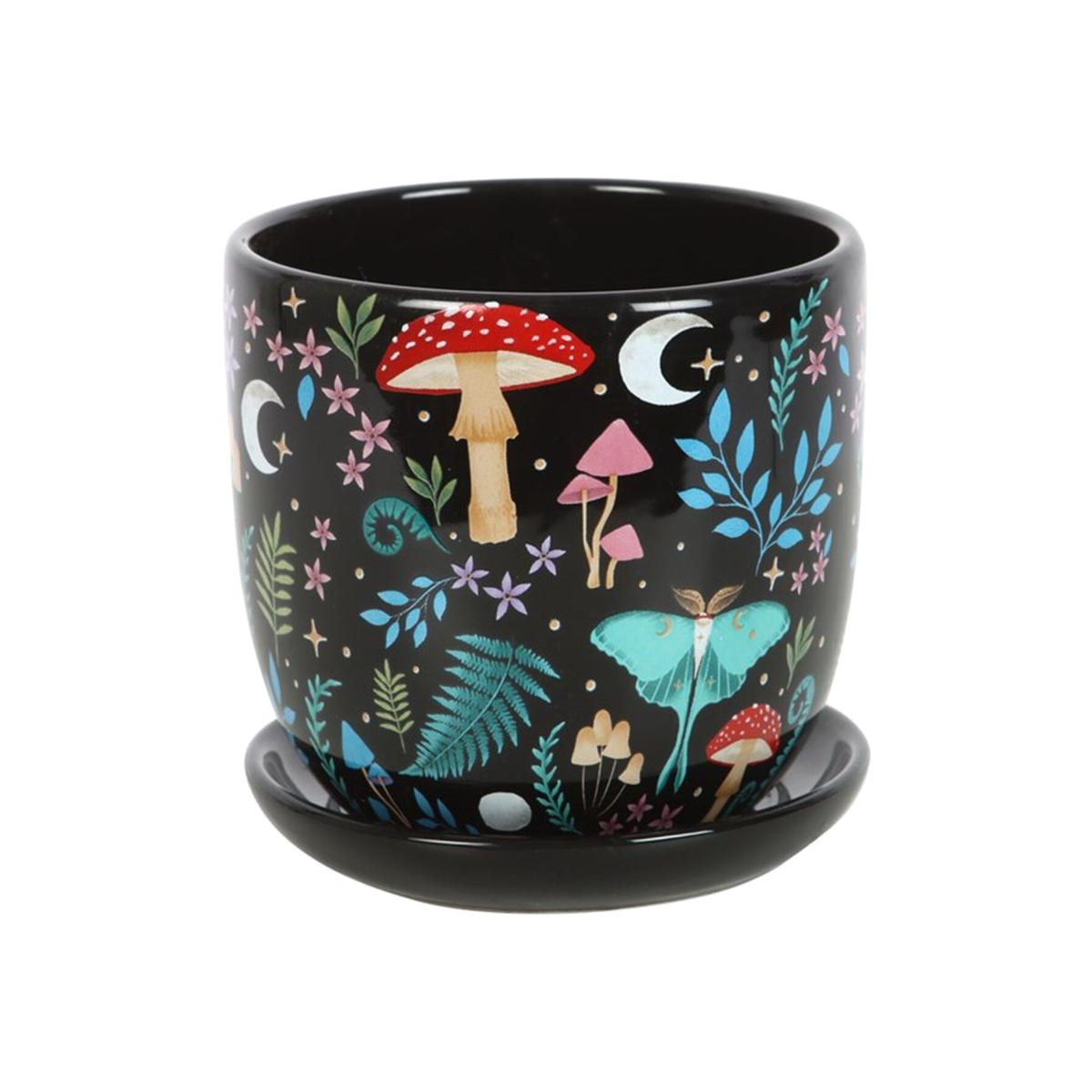 Give plants the home they deserve in this stunning dark forest print plant pot, complete with matching saucer. Featuring colourful flora and fauna illustrations and speckled with a pretty moon and star design, this pot is perfect for showcasing your most precious house plants.