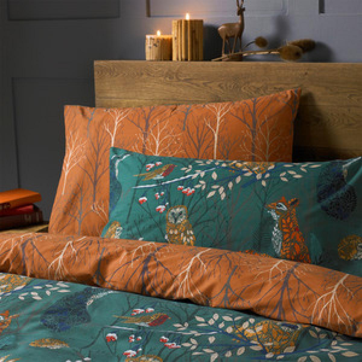 An enchanting scene, this bedding is a decorative print capturing the magic of nature. The animals are at one with their surrounding, with the woodland leaves and flowers swirling and curling together to camouflage them in their habitat. Inspired by the colours of leaves throughout the year, and featuring a beautiful woodland tree design on the reverse, this is a truly captivating design.