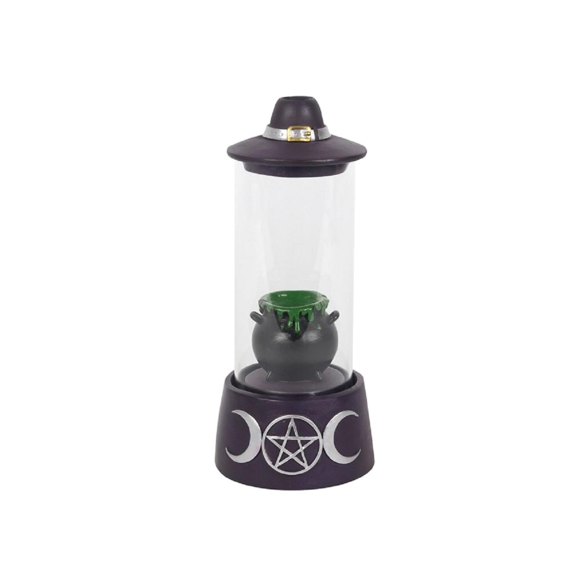 This impressive backflow cone burner is enclosed in a glass cylinder and features a bubbling cauldron, triple moon base and witch's hat lid. 4 LED lights gently cycle through a stunning rainbow of colours, beautifully showcasing the falling smoke that pools over the enclosed cauldron. Bottom on/off switch. Requires 2 AA batteries. Not included with the product. Product Dimensions H24cm x W10cm x D10cm Packaged Dimensions H23.5cm x W23cm x D14cm