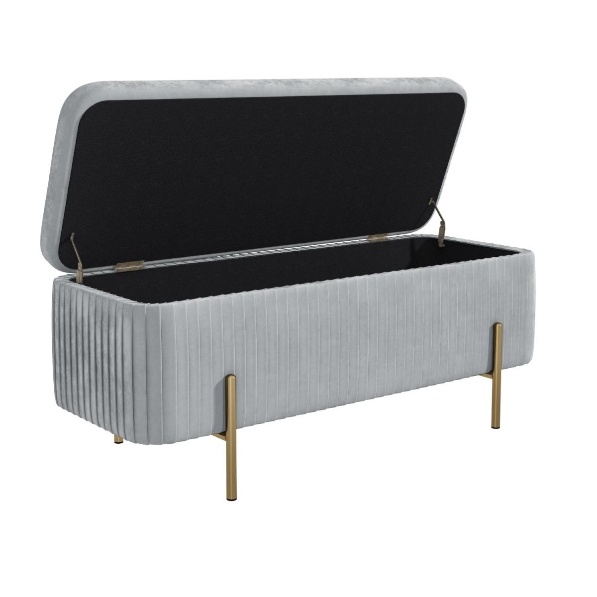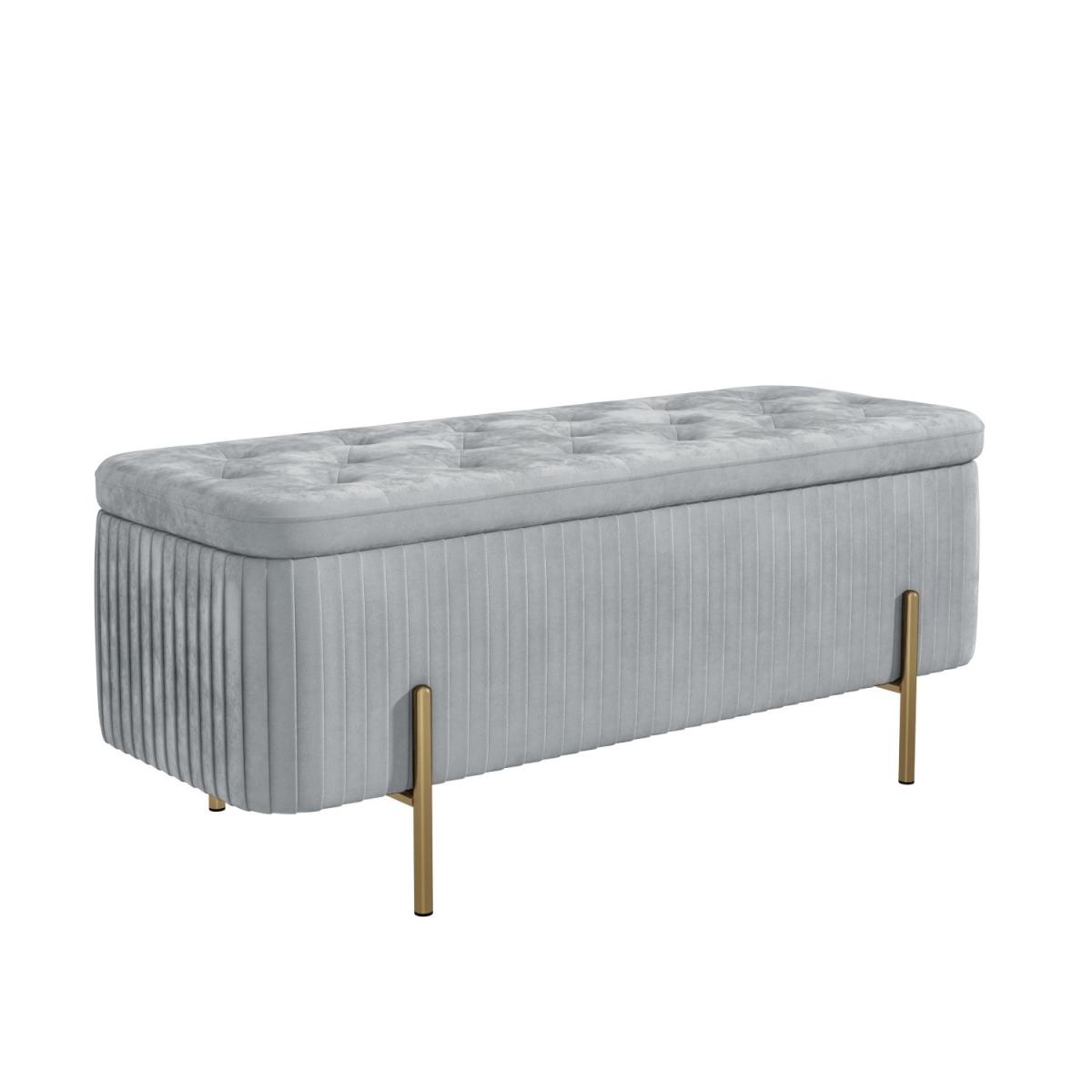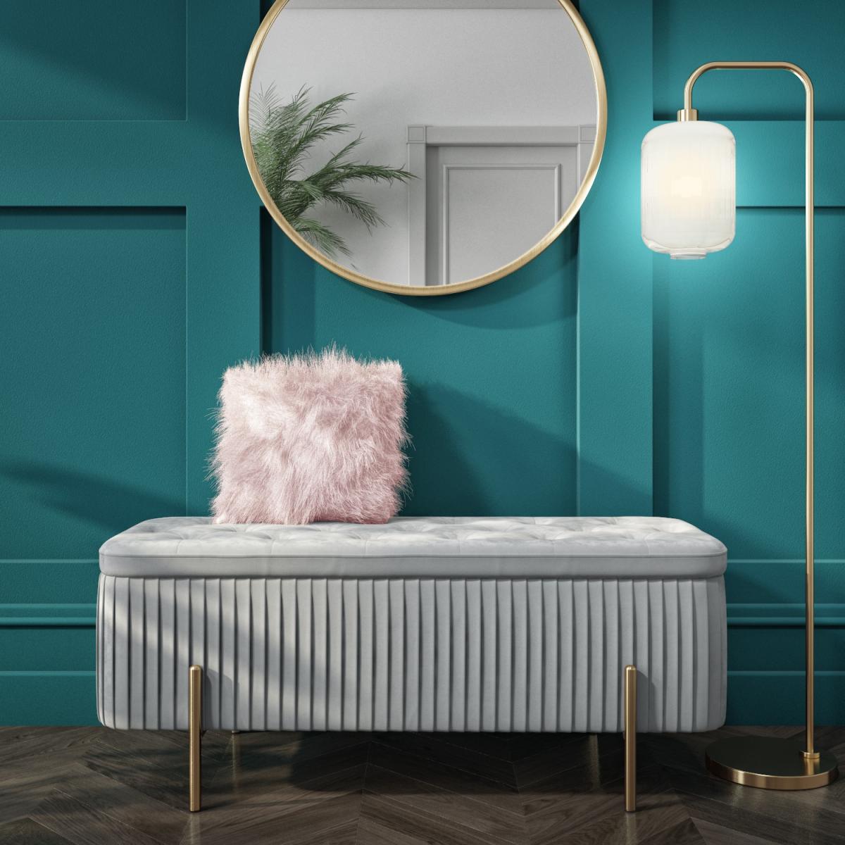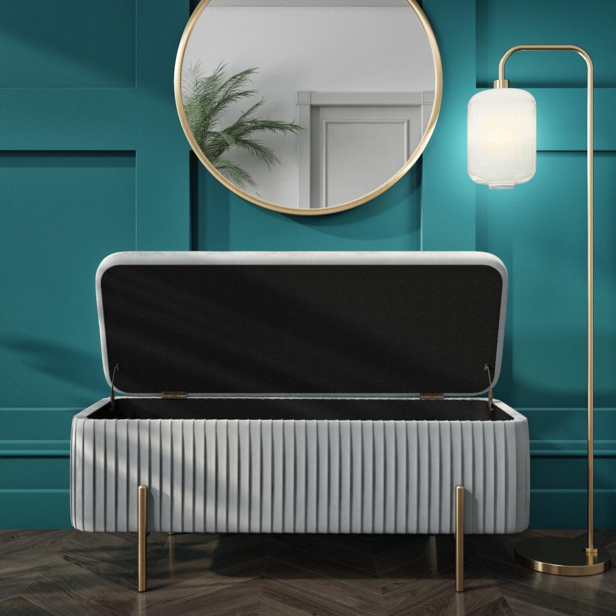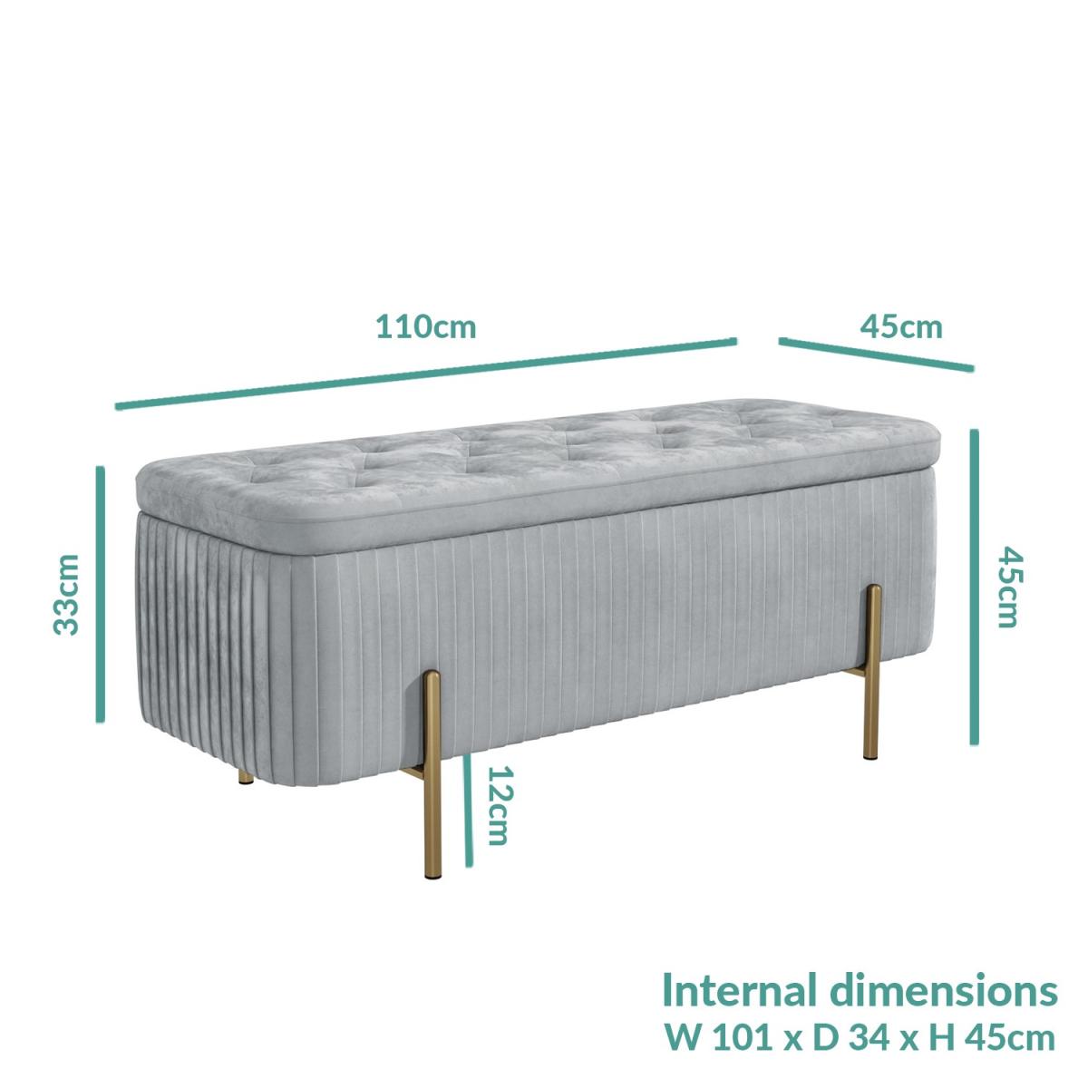 Features we love It's right on-trend with its irresistible soft plush velvet finish. Shiny gold legs contrast beautifully with the silver-grey upholstery. Buttoned quilted top and curved pleated front and sides give it a luxurious touch. Plenty of storage inside to discreetly store blankets throws and linens Strong metal hinges and supports make it easier for you to access and store items with ease All about me. This Harriet blanket box beautifully upholstered in a plush silver-grey velvet fabric features a quilted button top and curved pleated front and sides to give it an elegant and stylish finish; shiny gold legs complete the look. Practical in every sense with generous space for keeping blankets throws and linens neatly stored away. There's also a hinged lift-up top that locks into place once opened; so you can locate and rearrange items with ease. It doubles up as comfortable seating or foot stool too. It'd be perfectly placed at the end of your bed complementing any existing décor style. Need to know. Overall dimensions inlcuding leg. H45 x W110 x D45 cm Internal dimensions. H25 x W101 x D34 cm Number of hinges. 2 Number of legs. 4 Colour. Grey Finish. Velvet and shiny legs Material. Velvet and metal Weight. 18kg Assembly required. Yes.
