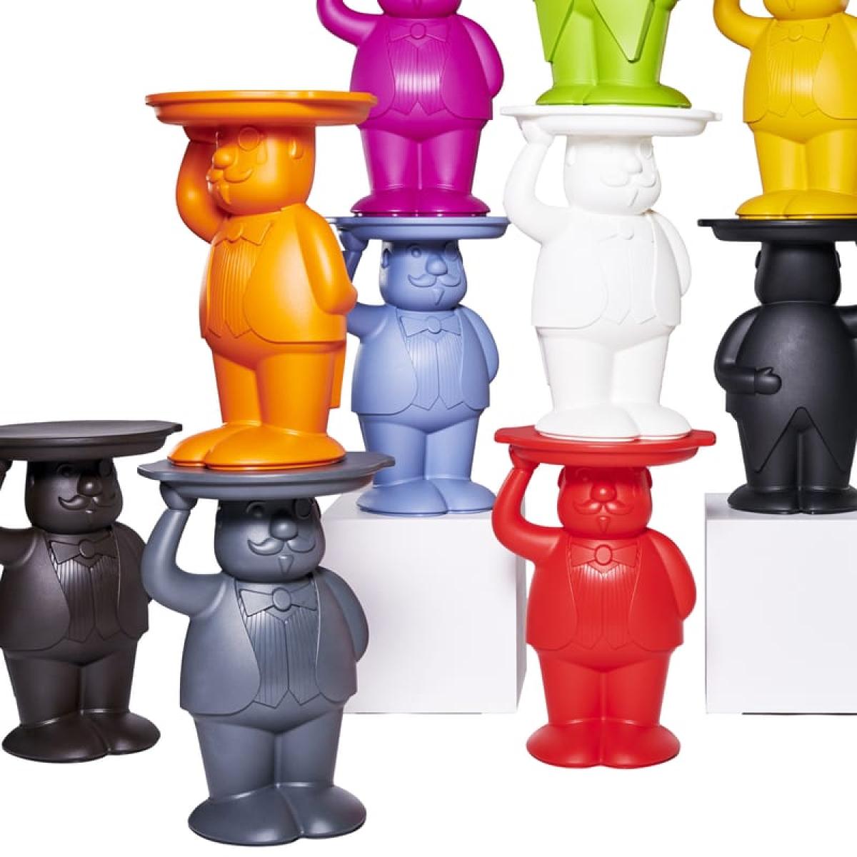 Always ready to help out, Ambrogio is a versatile, colourful butler. Designer Francesco Favaretto was inspired by his father's moustache when creating it, giving it a familiar look. Original and full of poetry, this piece of furniture-sculpture serves as a small side table or bedside table. Ambrogio can be used indoors and out. This small table decorates our interiors in an unusual way, bringing a bold, offbeat touch to your decor. The Ambrogio side table is made with 30% Eco. Allene, a 100% recycled plastic material designed with Tetrapack cartons, giving a second life to plastic that would otherwise go to landfills or incinerators.