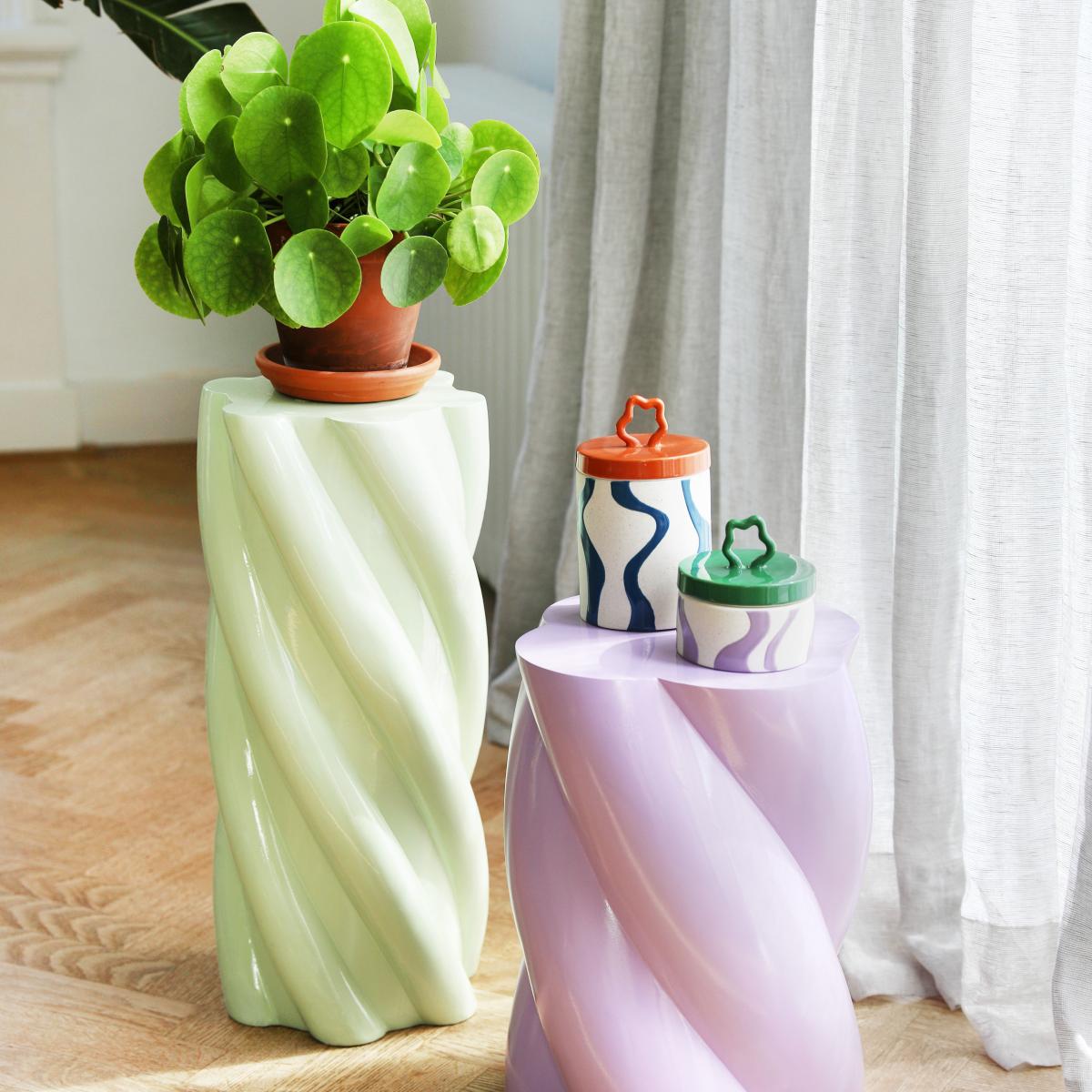 Extravagant and full of energy, these side tables boast astonishing shapes, twisted like marshmallow. These fibreglass columns are available in vibrant colourways that are sure to boost the dynamics of your interior. The smooth, soft-touch fabric with a high-shine is easy on both the eye and the hand. These columns are idea for a stunning lamp or even a plant. The different side tables from the Marshmallow collection can be combined to form a graphical set.