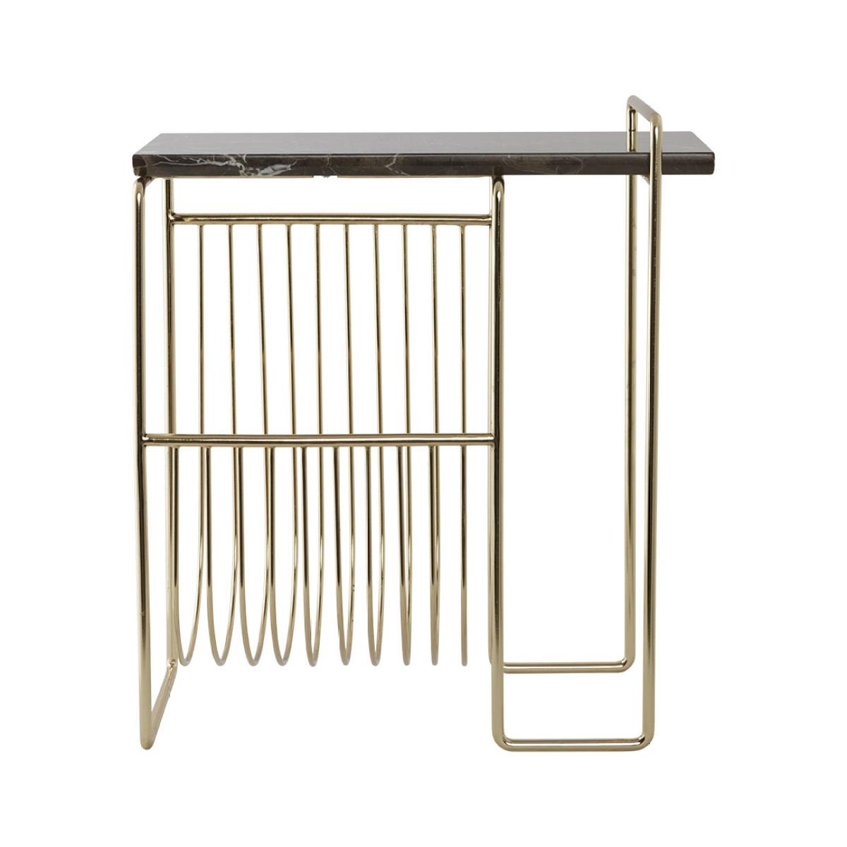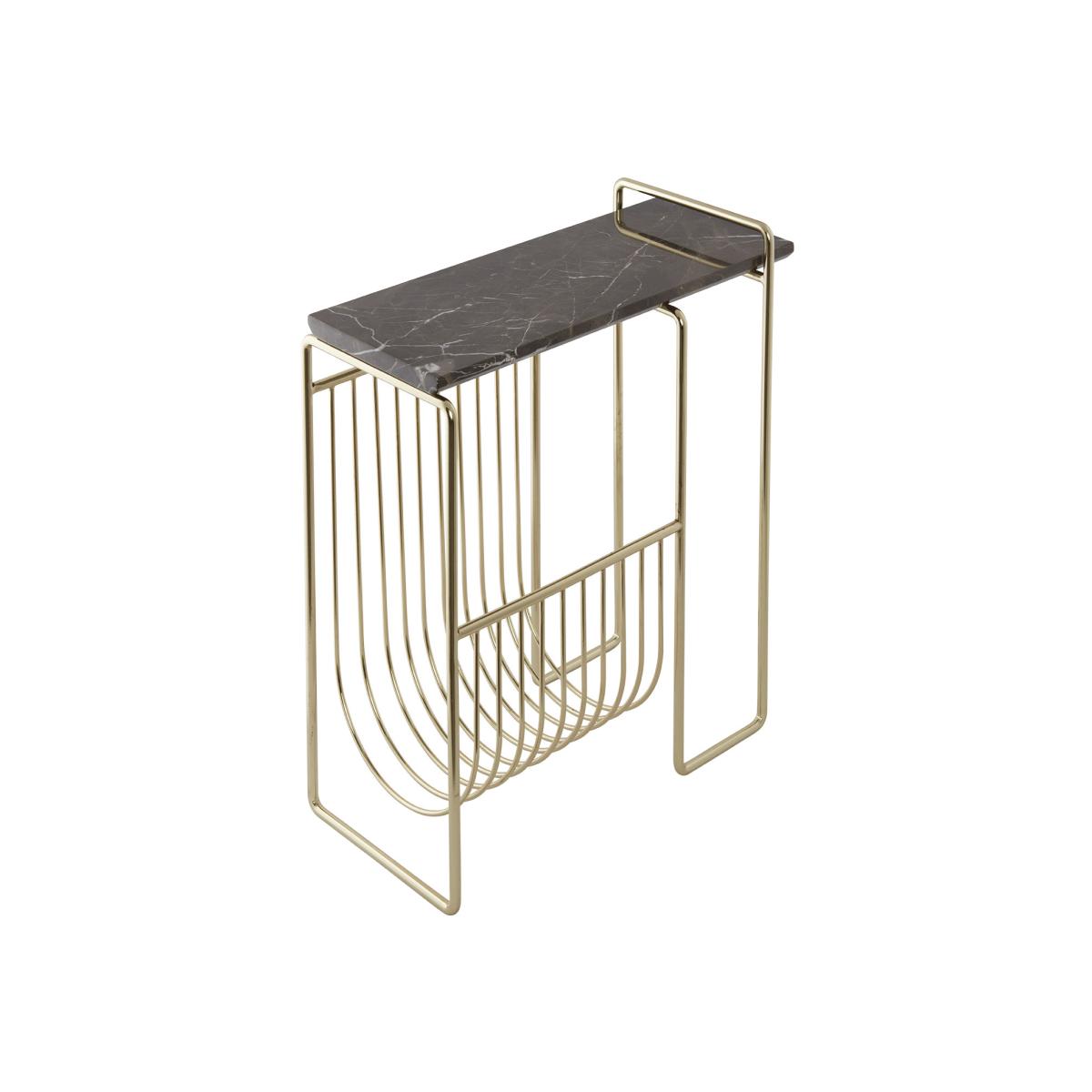 A flavourful combination of square lines and curves for this practical coffee table which includes a magazine holder. The metal strands form a wave which elegantly occupies the space. This openwork and ethereal structure serves as a magazine holder for your magazines and books. The very refined marble top strengthens the sophisticated and timeless aspect of this small table. Sino fits in anywhere: sofa-end, side table or bedside table.