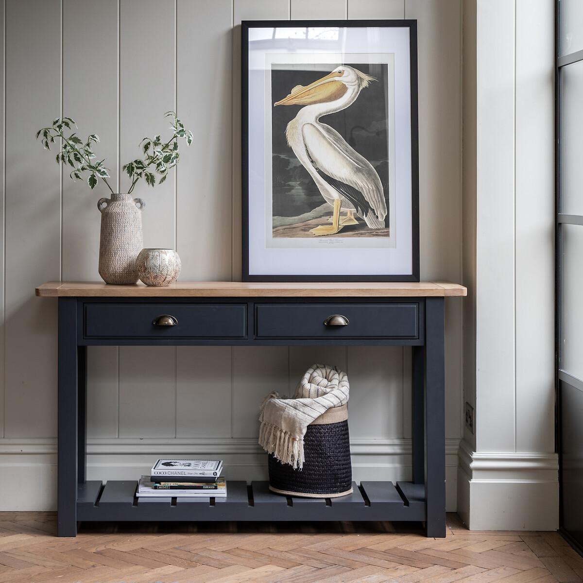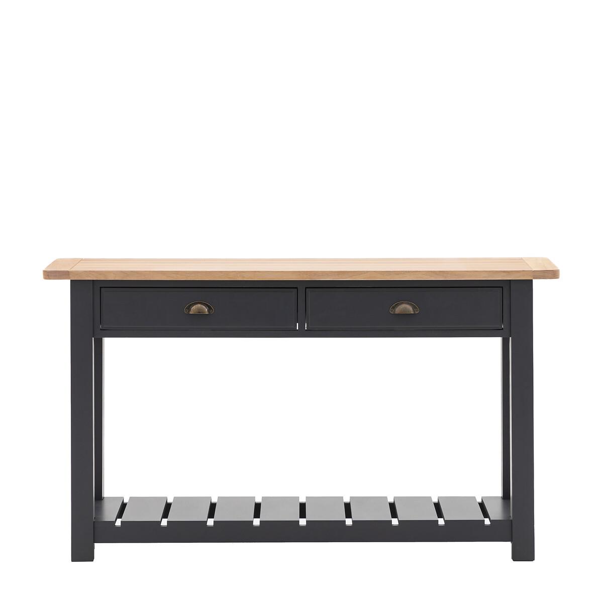 A modern update on a country classic, this console table is a versatile piece perfectly suited to both contemporary and rustic interiors. Featuring 2 drawers and a low shelf, the console table is perfect for living rooms, dining areas and kitchens alike, offering great additional storage. The hand painted subtly textured finish with metal drawer pulls and grooved & planked oak top add a modern twist to this country style console. Product details2 Drawers / 1 Shelf. Fixed shelving. Painted legs finished in matte lacquer. Anti-topple kit included. Assembly required. Product Composition - Oak / Pine / MDFProduct Dimensions - 38 cm x 140 cm x 80 cm , Weight - 31 KGInternal Drawer Size- W50 x D25 x H8cm Distance Between Shelves- 45 cm Clearance to floor- 4.5cm Package Dimensions - 149 cm x 48 cm x 34 cm, Weight 34 kg. This product will be dispatched by one of our trusted suppliers. You’ll be contacted by their selected courier about your delivery. Please note: this product cannot be delivered to all Offshore Islands, Northern Ireland or Republic of Ireland. GALLE01
