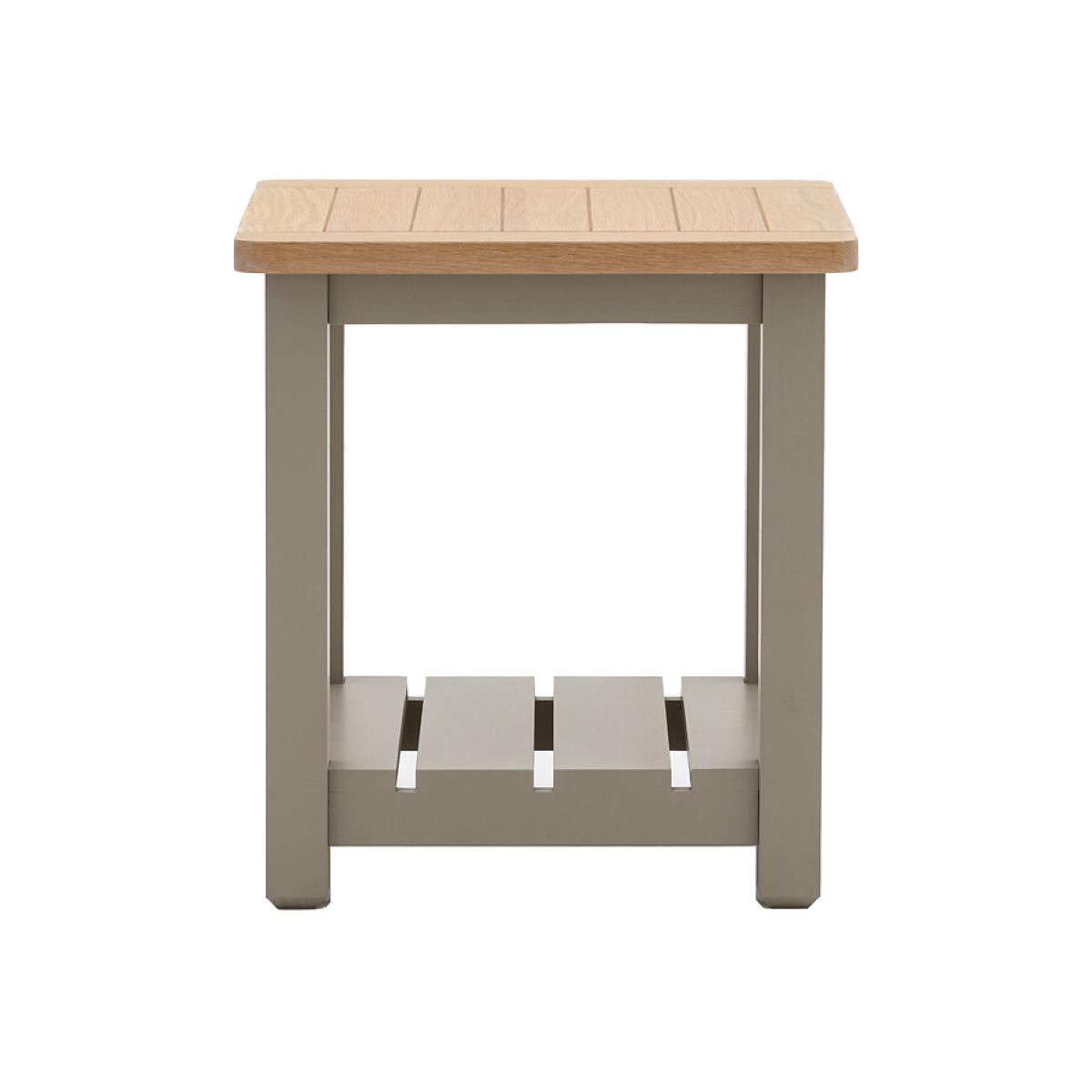 Ende table by name and end table by nature. With its simple design and combination of hand painted wood and grooved & planked oak top, this side table offers a contemporary twist on a traditional style. The slatted shelf below the table is a practical addition. Product details. Fixed shelf. Painted legs finished in matte lacquer Assembly required. Product Composition - Oak / Pine / MDFProduct Dimensions - 50 cm x 50 cm x55 cm , Weight - 11 KGDistance Between Shelves- 36 cm Clearance to floor- 4.5cm Package Dimensions - 60 cm x 60 cm x 25 cm, Weight 12.4 kg. This product will be dispatched by one of our trusted suppliers. You’ll be contacted by their selected courier about your delivery. Please note: this product cannot be delivered to all Offshore Islands, Northern Ireland or Republic of Ireland. GALLE01
