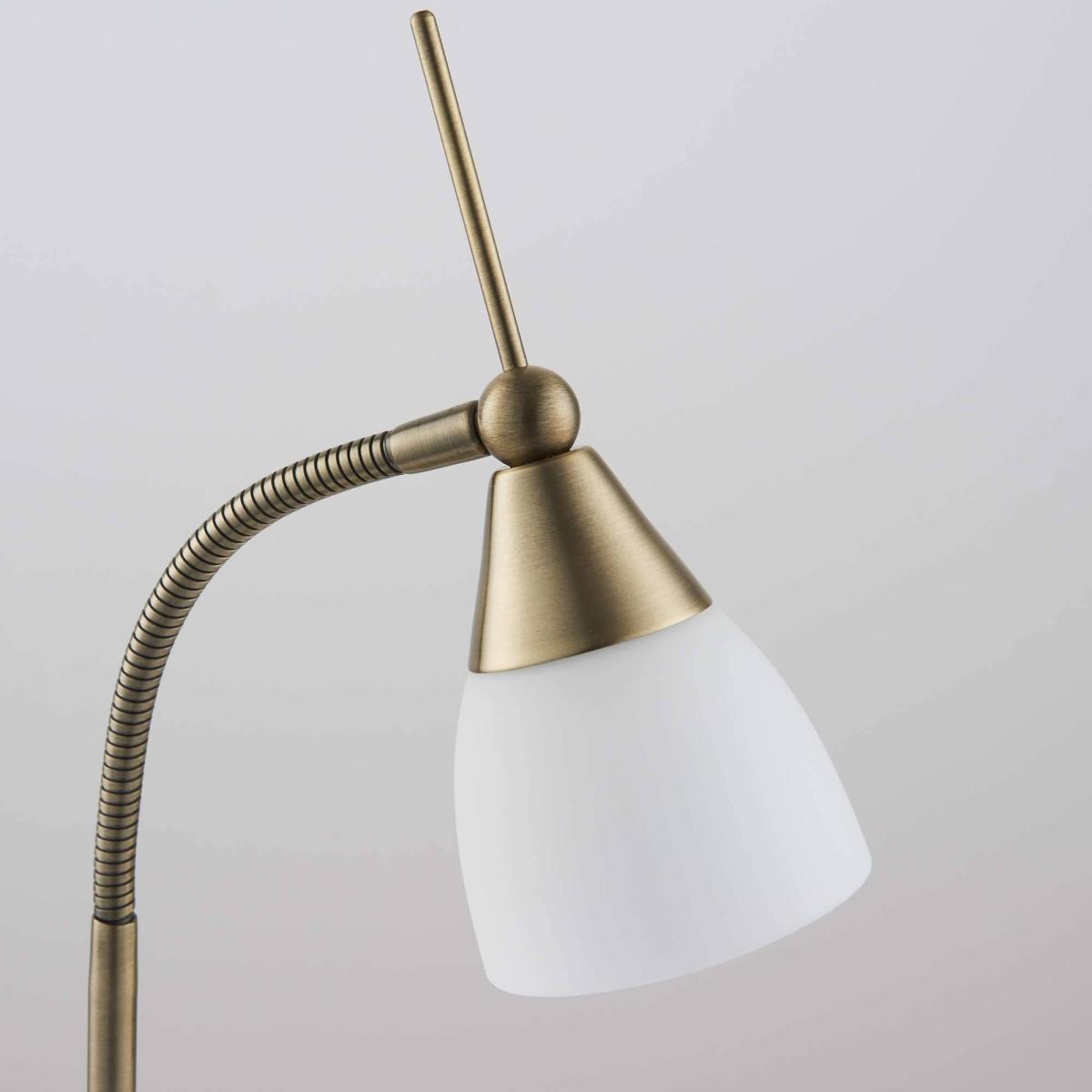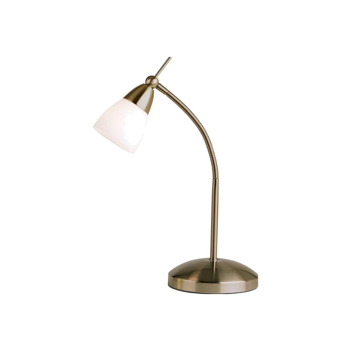 Touch Desk Lamp Antique Brass. The Touch desk table lamp from Endon lighting comes in an antique brass finish and features an adjustable arm with white frosted glass shade.