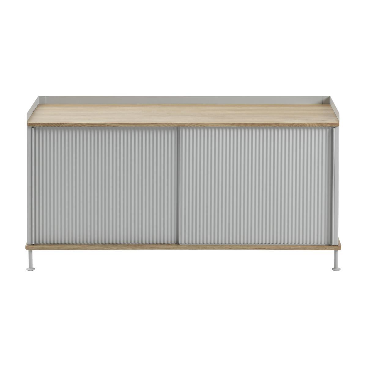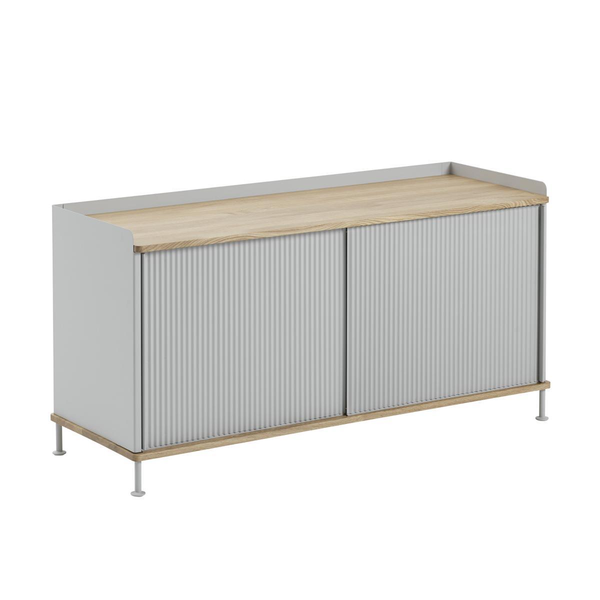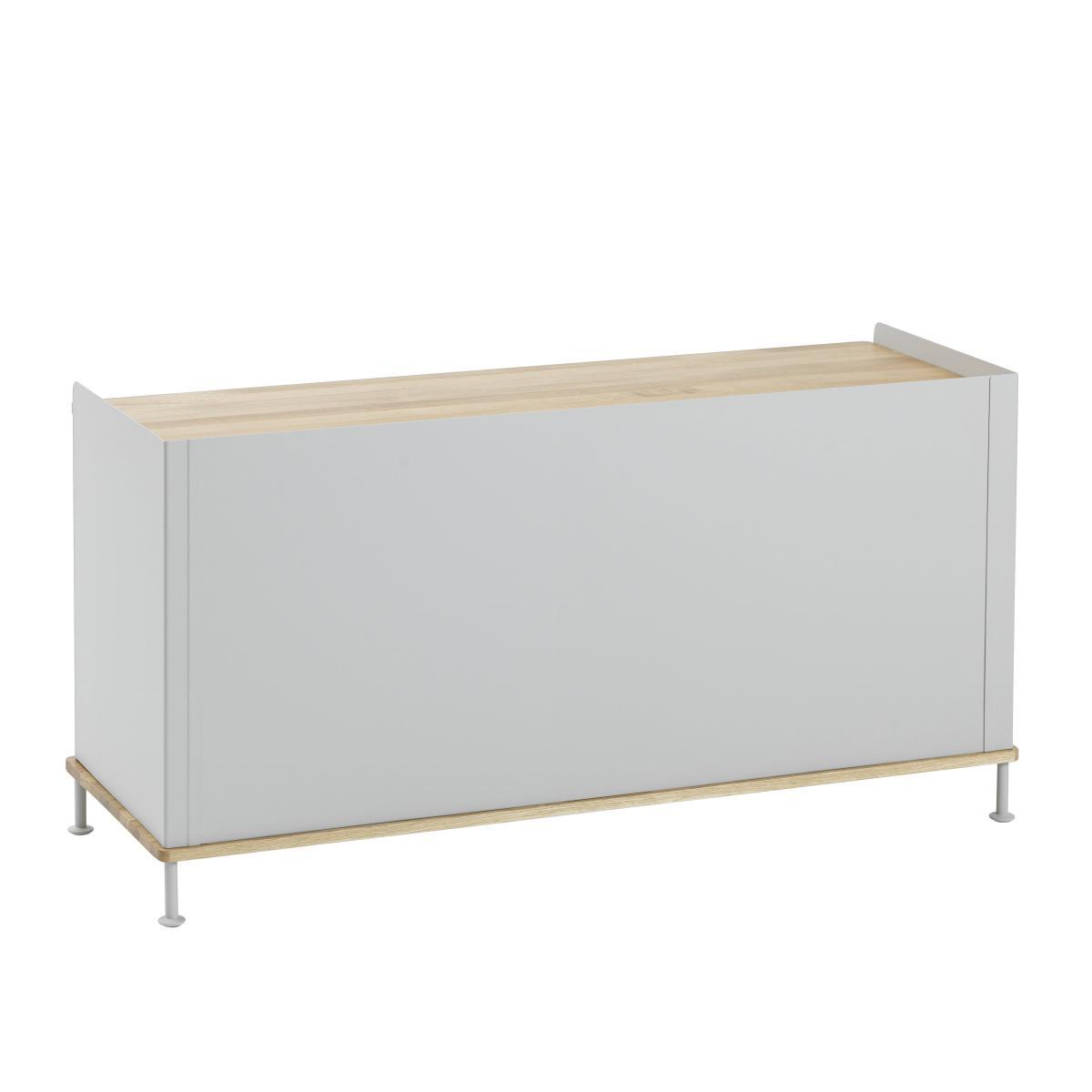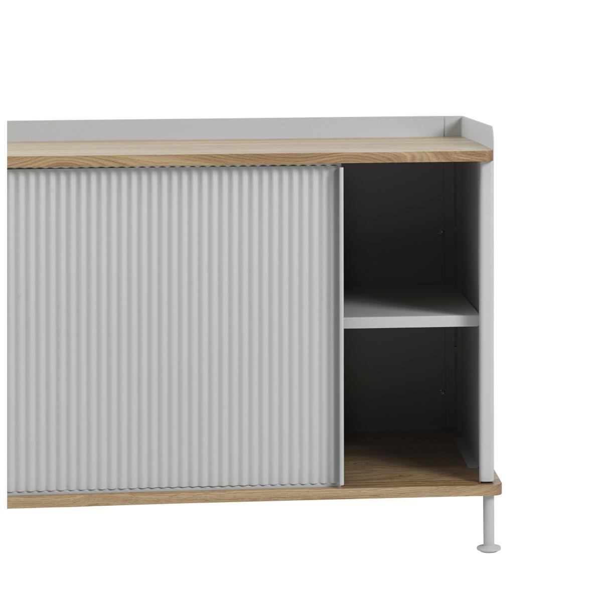 A successful mix of styles and materials! The Enfold low cabinet has a design that combines classic and modern characteristics. The base and the top part of this Muuto cabinet are made from solid oak, with soft and warm lines that are traditionally found in Scandinavian design. The choice of this material references the wooden dressers of the 20th century, contrasting wonderfully with the modern painted steel structure. The doors have pretty ridges on the metal, highlighting the industrial and elegant aspect of the dresser. This simple and refined piece also enables you to better organise your storage: the two sliding doors hide two shelves that you can adjust on five different levels, depending on what you want to place in the dresser. The Muuto Enfold cabinet is ideal in the living area, a dining room and in an office.
