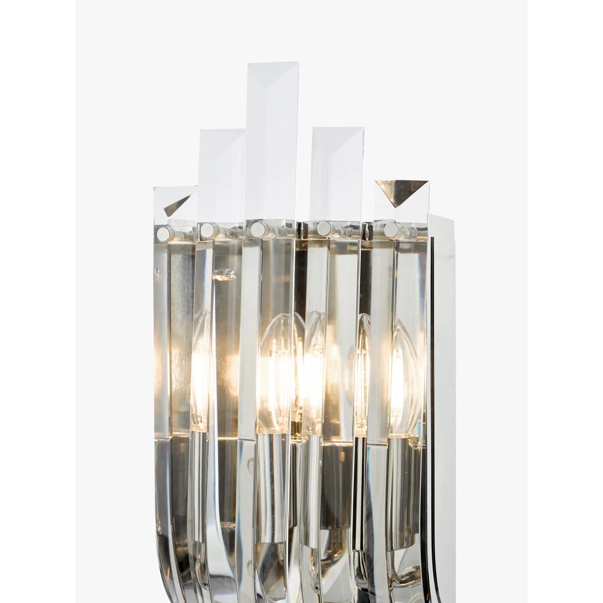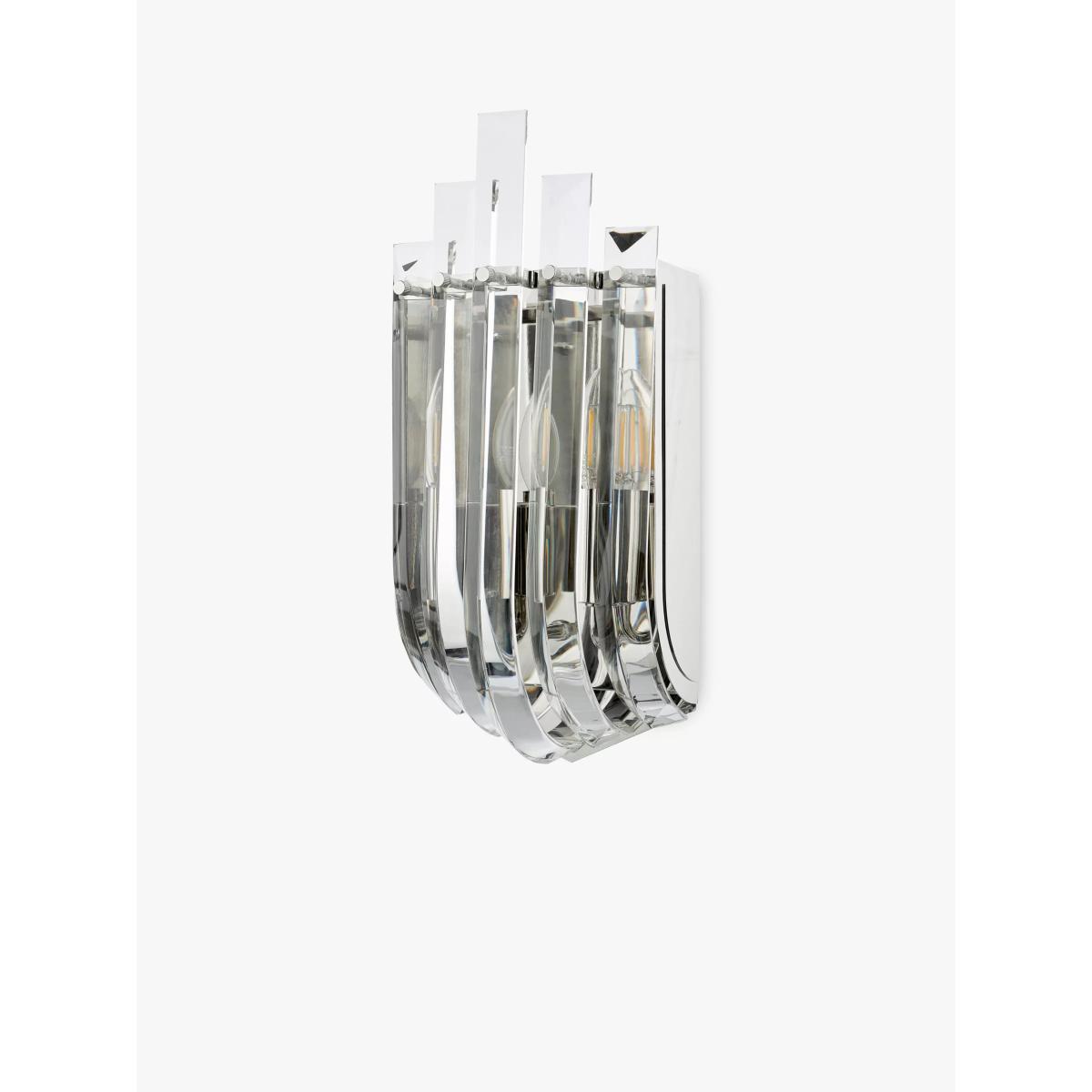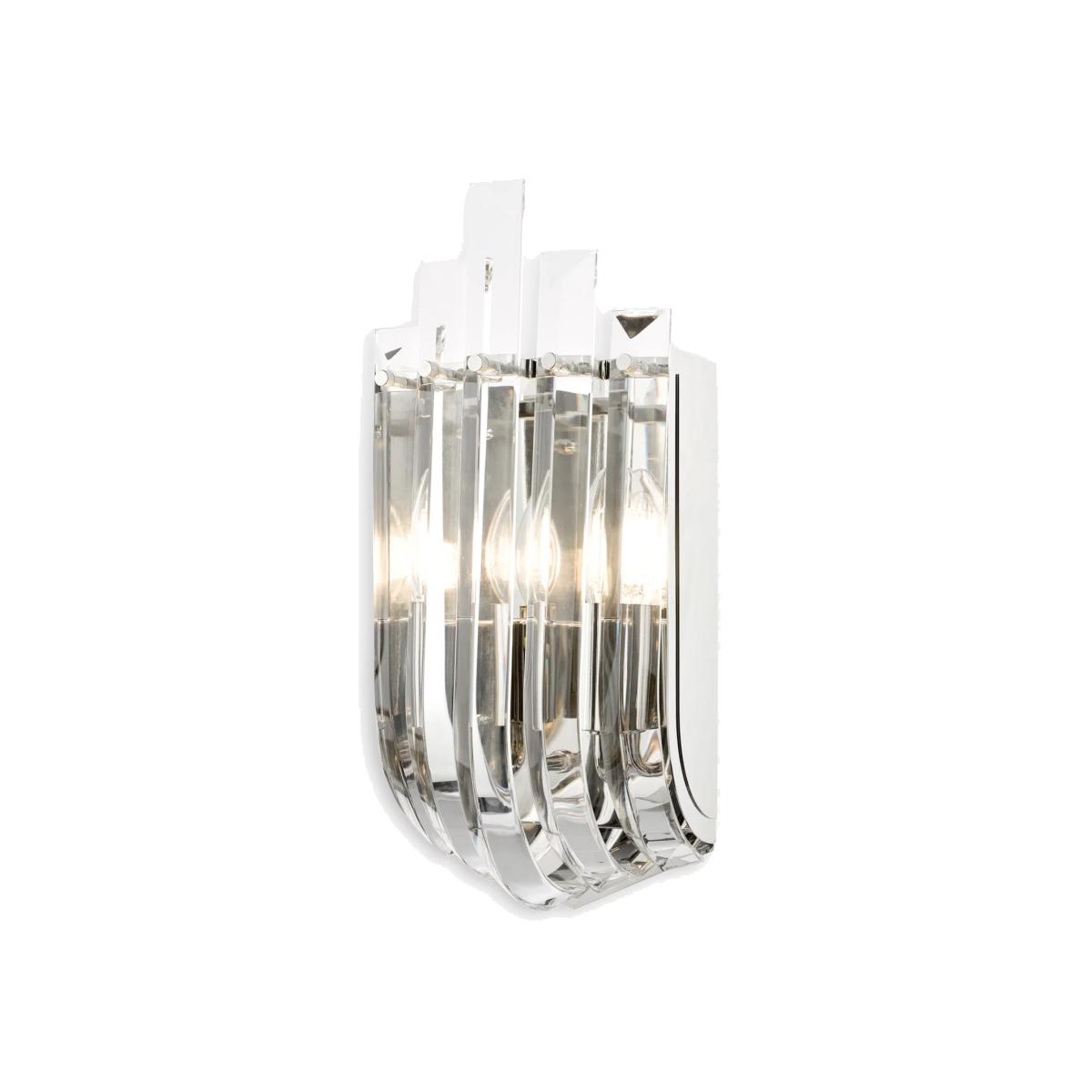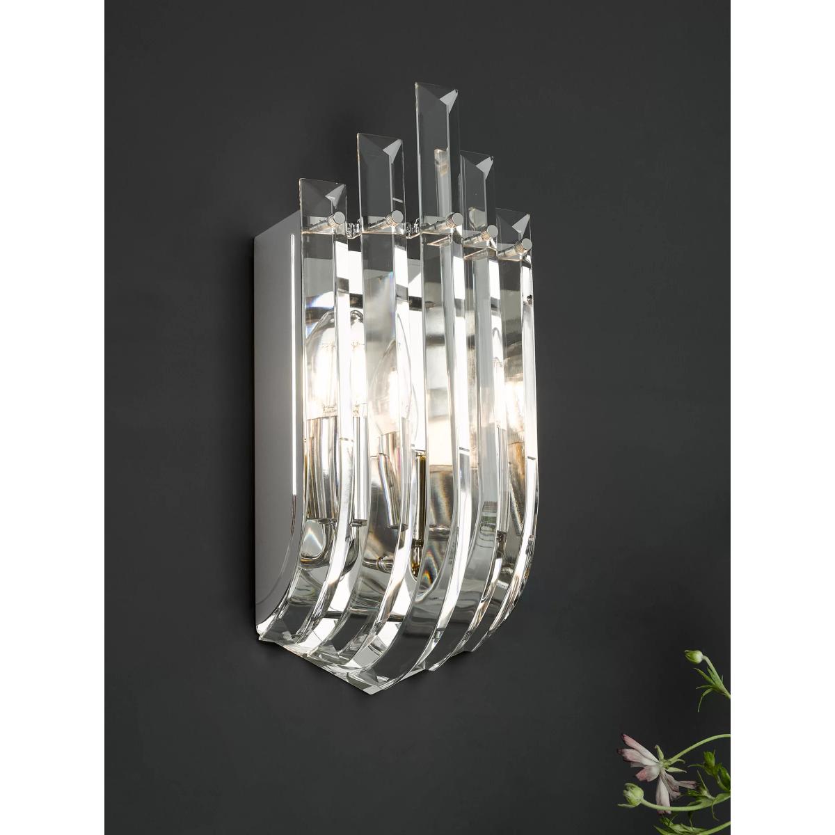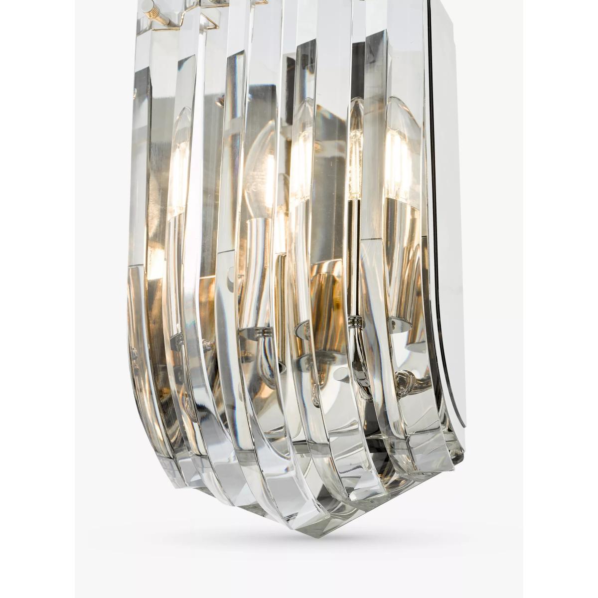 English Heritage designers bring a taste of 1930s glamour to your home with this opulent swagged crystal light with its geometric forms inspired directly by an Art Deco jewel. There's inspiration at every angle at Eltham Palace in southeast London. This ground-breaking house combines medieval remains with masterful Art Deco design, including Marion Dorn's circular rug, which took pride of place in the grand entrance hall and inspired this design. The Eltham 2 Light Swagged Crystal Wall Light makes a great Art Deco statement in any room and is a great addition to the matching Ceiling Light and Pendant. The use of polished nickel metalwork coupled with a subtle yet stylish surface flourish serves as a counterpoint to the crystal. Part of the English Heritage lighting collection, inspired by Great British houses and gardens.