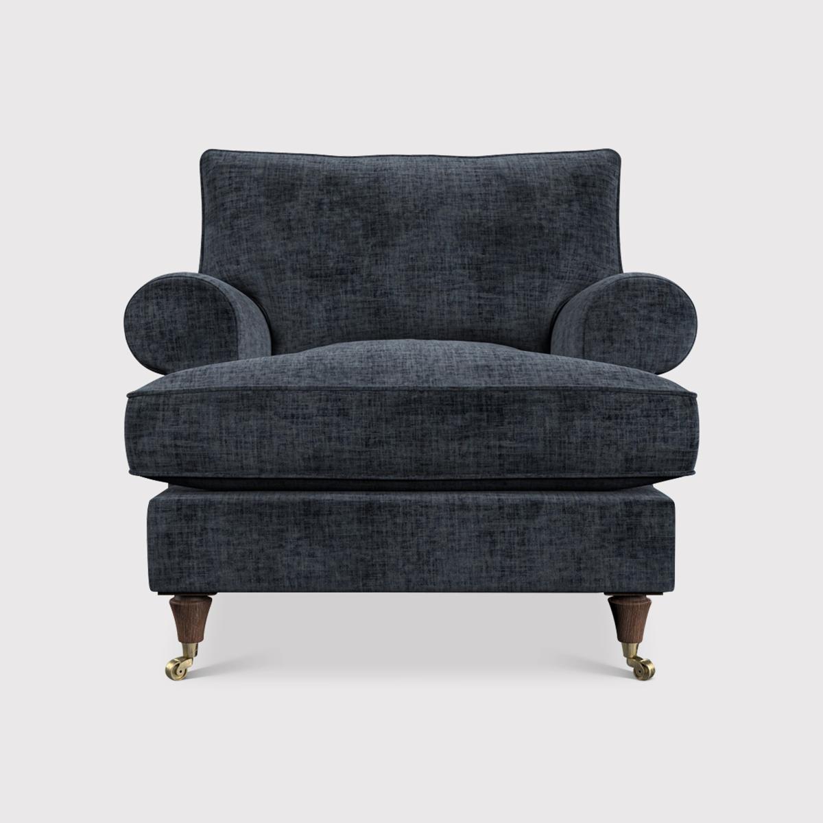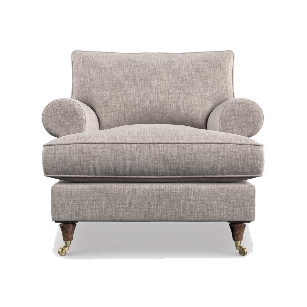 I often call this the Finch armchair in my schemes - its generous seat depth, rolled arms and subtle linen-look fabric strike a perfect balance between comfort and style. The turned wooden legs with brass castors give it a nod to traditional English design, yet the neutral tone makes it equally at home in contemporary or country-cottage settings. For a practical but inviting look, layer a chunky knit throw and one or two contrasting cushions (think deep teal or burnt ochre) to introduce colour and texture. Tuck it into a cosy reading corner with a slimline floor lamp and a small side table, or angle it opposite your sofa to create an informal conversation area.