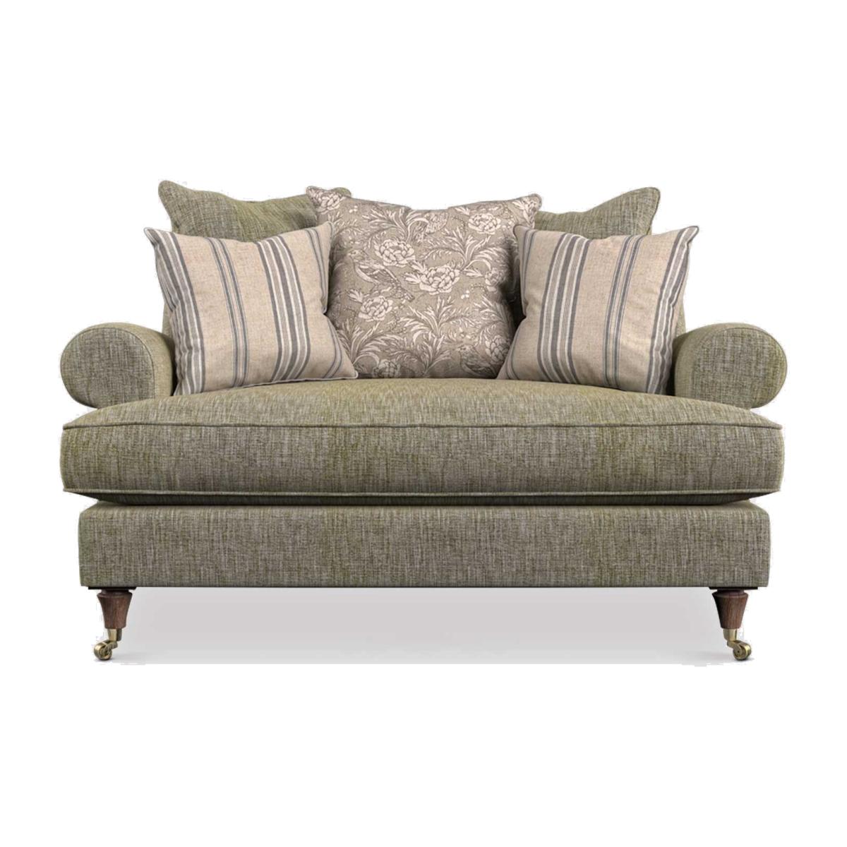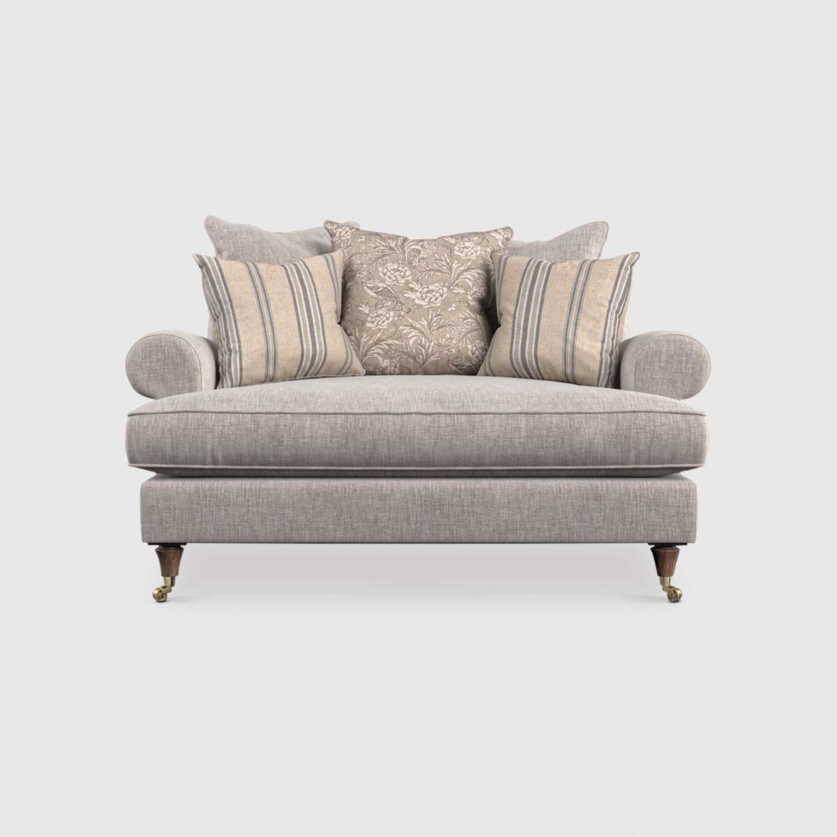 The Finch Linen Mix Pillow Back Cuddler Chair brings together timeless charm and modern comfort. Designed for relaxation, it features a cosy pillow back, deep comfort seating, and classic scroll arms. Upholstered in a textured linen mix fabric, it offers a breathable, durable feel that enhances its inviting appeal. Resting on vintage oak feet with optional castors, this chair is inspired by the interiors of Charles Darwinrsquo;s family home. Hand-drawn finch motifs and subtle botanical details complete the design, adding a refined, nature-inspired touch.