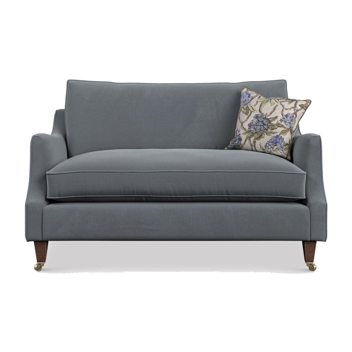 I’m a big fan of the Quarry cuddler for its neat two-seater width and deep, foam-wrapped cushion that still looks tailored rather than slouchy. The muted slate-blue fabric sits comfortably in modern classics, Scandi or softly traditional rooms, and the turned-front legs with brass castors give just enough character without over-doing it. For styling, layer in a botanical-print cushion or two to echo the gentle curve of the arms, then add a woollen throw in a complementary hue thrown over one side. Position it beside a slim-legged side table or a woven rattan lamp stand to balance the solidity of the wraparound back. If you’ve got room, pick a low-profile footstool in a contrasting texture to extend the seating and keep the look inviting yet streamlined.