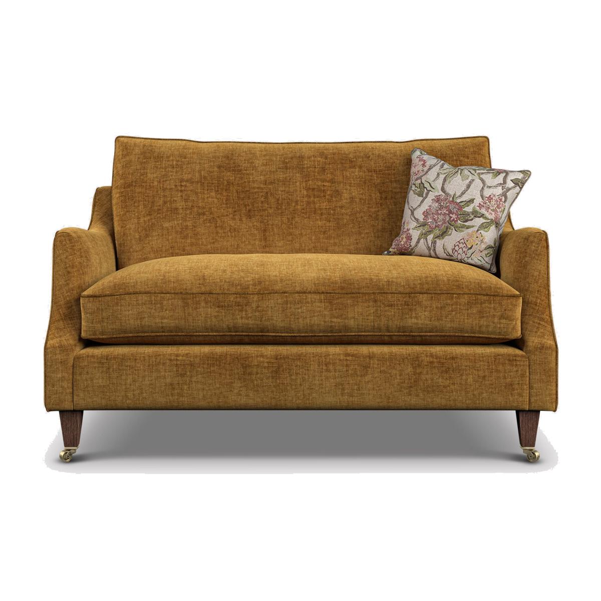 I’m a fan of the gold Quarry cuddler because its compact proportions and warm, textured fabric make it both comfortable and versatile. It works equally well in a contemporary city flat or a traditional cottage living room, where the deep seat and slim arms don’t overwhelm smaller spaces. For styling, layer in a couple of cushions in muted florals or geometric prints and drape a soft woollen throw over one arm. Pair it with a dark-stained oak side table or a slim brass-legged coffee table to echo the sofa’s feet, and introduce a natural-fibre rug to ground the area. Finish with a couple of potted green plants to lift the warm tones without adding too much contrast.