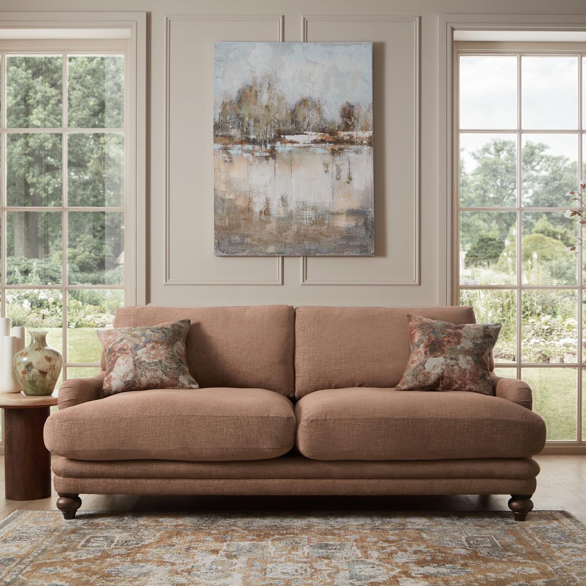 I’d describe this as “the Rosa sofa”-a medium-sized, soft-pink cord style piece that’s as practical as it is pretty. I love its rolled arms and turned-wood legs for the subtle nod to classic English interiors, yet the muted rose hue makes it equally at home in a contemporary or Scandi-inspired scheme. Pair it with natural textures (think a chunky wool throw or woven jute rug) and cushions in dusty greens or warm terracotta to balance the pink. It’s roomy enough for two yet compact enough for a snug, and its neutral tone means you can switch up accent colours seasonally without replacing your main piece. A low, simple coffee table in oak or black metal will complete the look without overpowering the sofa’s soft silhouette.