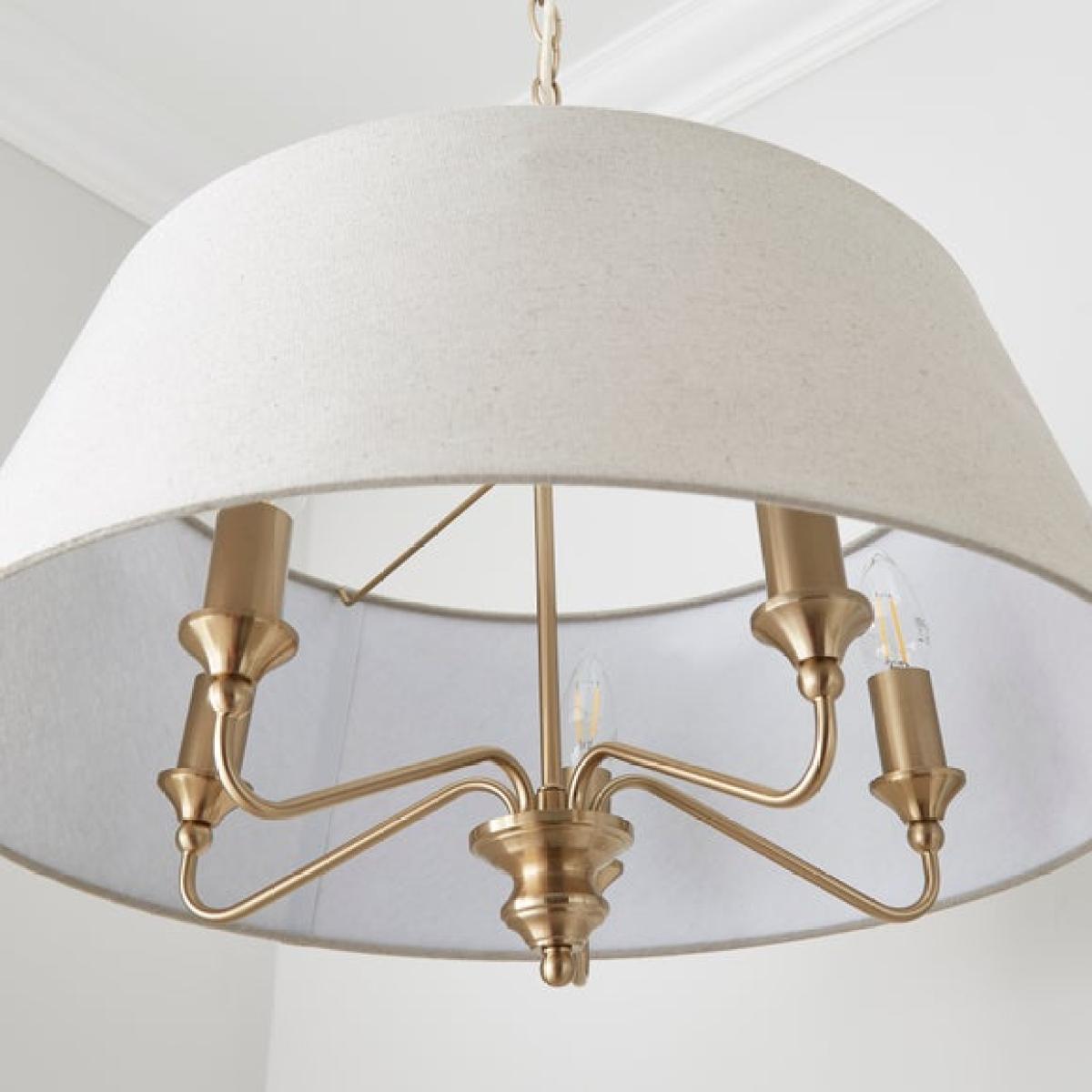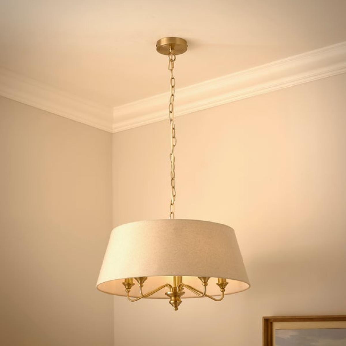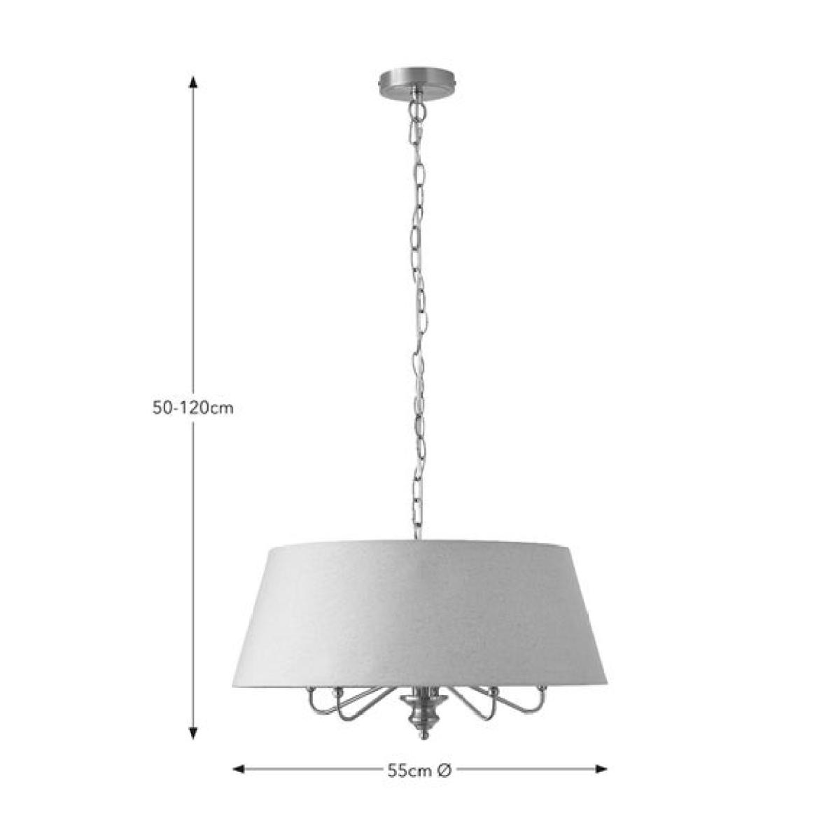 * Stylish & Understated Design * Soft Grey Shade, Warm Gold Frame * Adjustable Height - Tailored Ambience Meet the Enid 5 Light Adjustable Chandelier - the epitome of elegance, modernity, and versatility. Featuring a soft grey linen-effect shade set against a warm gold metal frame, this understated - yet effortlessly stylish - light adds sophistication, whilst the adjustable height offers tailored ambience. Ideal for creating a welcoming atmosphere in dining rooms, living areas, or entryways.