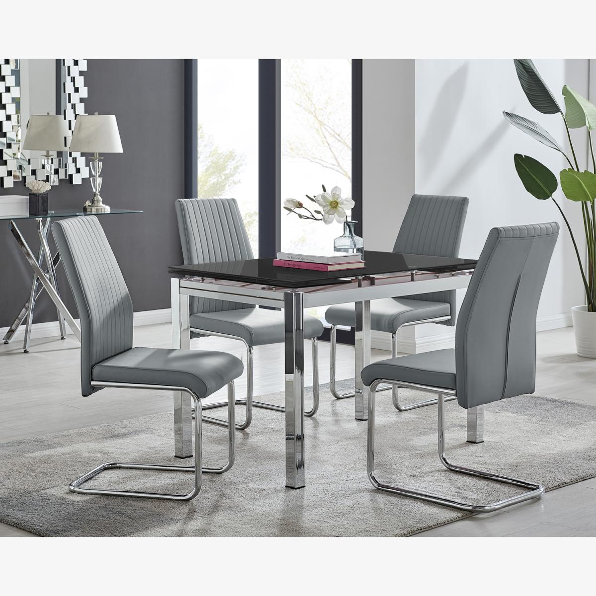 The Enna extending dining table is the perfect example of how we love to combine beautiful design with practical functionality here at Furniturebox! The elegant chrome legs support a sleek and beautiful tempered white or black glass top. The extending mechanism is also a visible design feature and allows the addition of extra diners once fully drawn-out. A bar handle at each end of the table allows effortless extension, with each panel sliding smoothly from under the table-top to click neatly into place. If you're looking for style and versatility in your dining area then the Enna Table ticks all the boxes! Matched with our elegant, cantilever Lorenzo dining chairs for a classic look with a contemporary edge. The Lorenzo chairs are made from high quality soft touch faux leather in a range of colours, elephant grey, cappuccino grey, white, black or mustard. Ergonomically designed featuring a deep foam seat cushion and moulded backrest to offer lumbar support, for maximum comfort without compromising on design. Protective plastic feet come as standard on the stylish chrome legs and will protect your floor from damage.