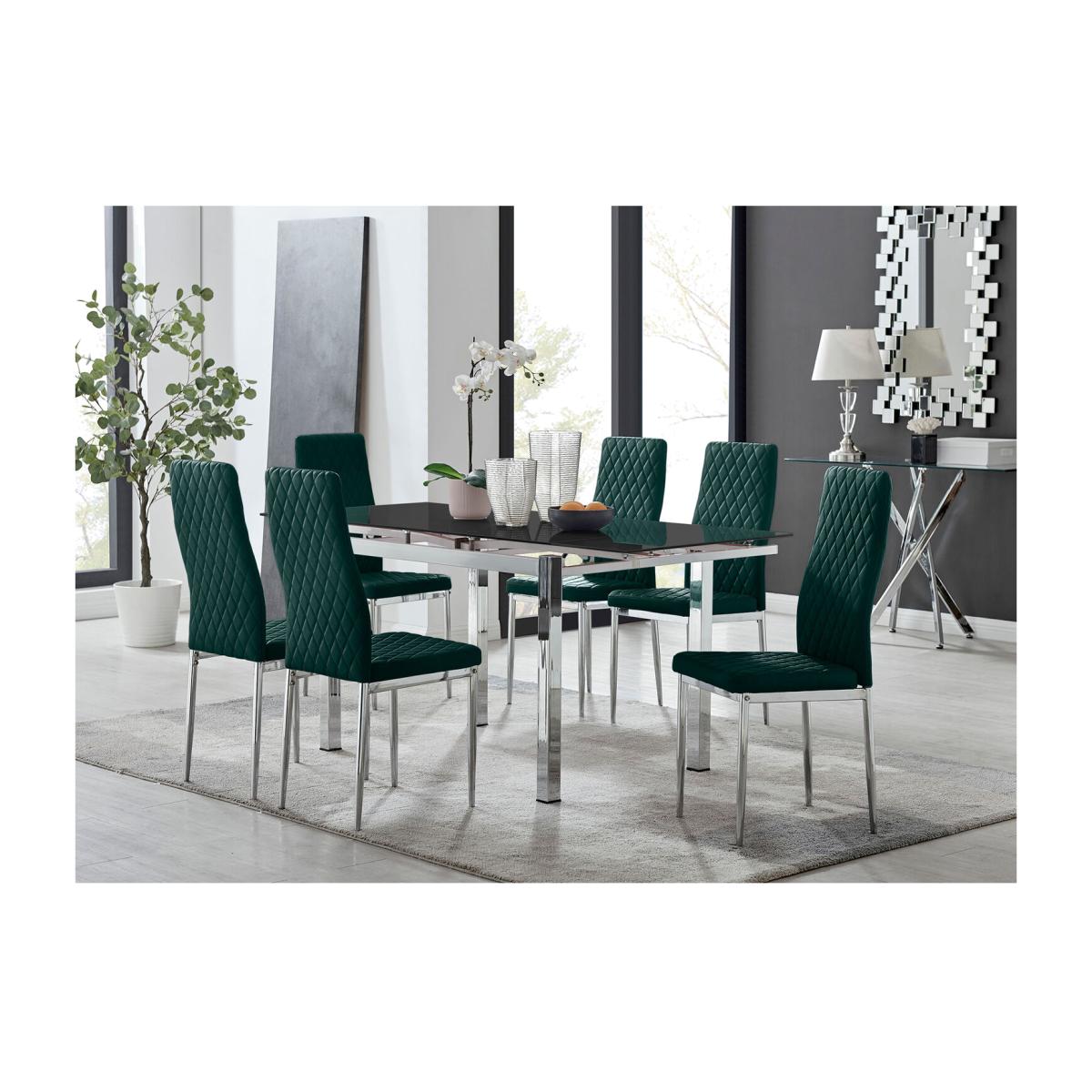 The Enna extending dining table is the perfect example of how we love to combine beautiful design with practical functionality here at Furniturebox! The elegant chrome legs support a sleek and beautiful tempered white or black glass top. The extending mechanism is also a visible design feature and allows the addition of extra diners once fully drawn-out. A bar handle at each end of the table allows effortless extension, with each panel sliding smoothly from under the table-top to click neatly into place. If you're looking for style and versatility in your dining area then the Enna Table ticks all the boxes! Upholstered in soft touch green velvet and finished with diamond pattern stitching the Milan dining chairs would seamlessly fit in with most dining spaces, whilst not compromising on either style or comfort. The stylish shiny chrome silver leg and hatched velvet combination gives this chair a contemporary edge, whilst it's simple design allows for practical everyday usage. The chairs are made from high quality durable velvet that's easy to keep clean and are ergonomically designed for maximum comfort and support. They feature a deep foam seat cushion and plastic feet to protect the floor from any damage! At an unbeatable price you cannot go wrong with these chairs!