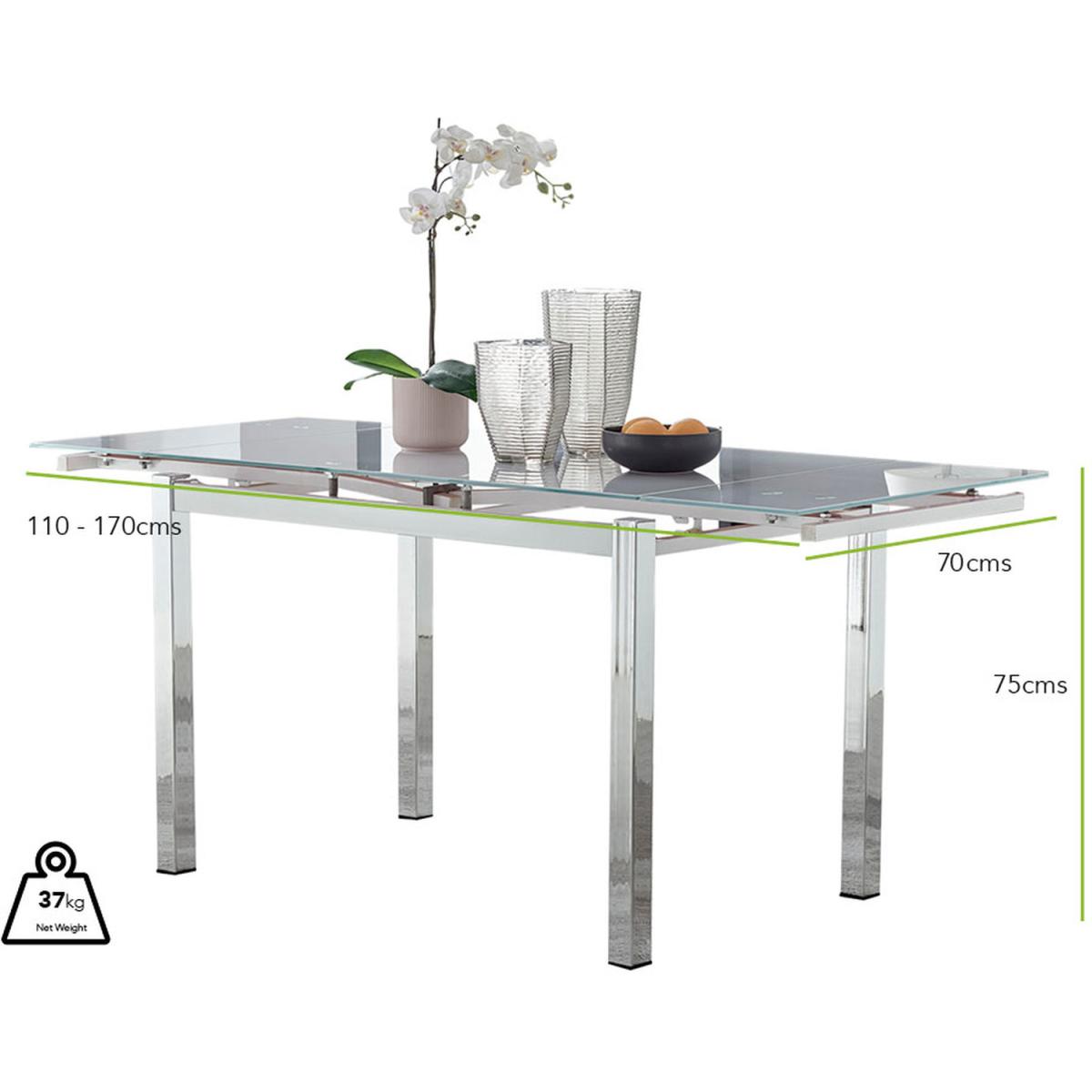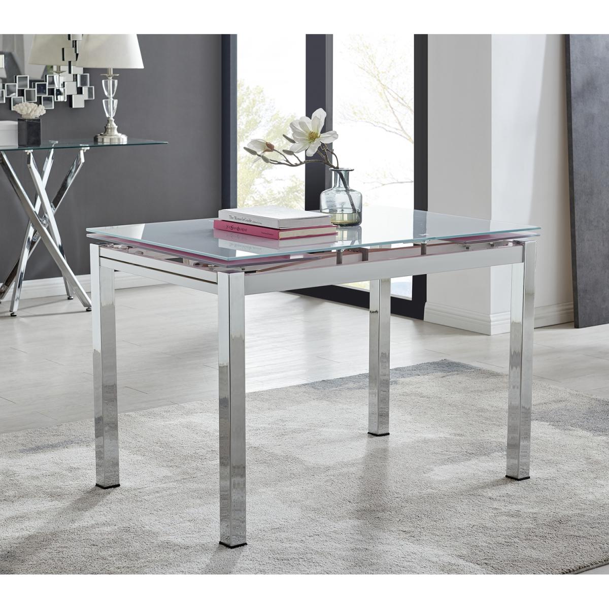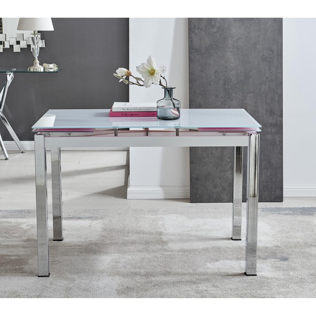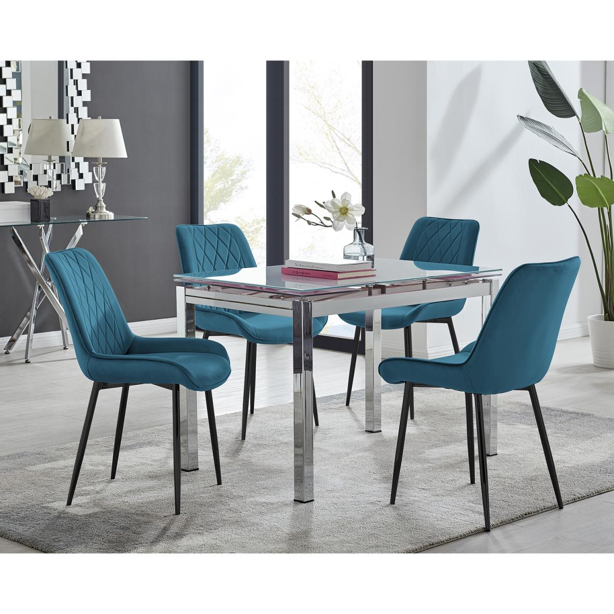 The Enna extending dining table is the perfect example of how we love to combine beautiful design with practical functionality here at Furniturebox! The elegant chrome legs support a sleek and beautiful tempered white or black glass top. The extending mechanism is also a visible design feature and allows the addition of extra diners once fully drawn-out. A bar handle at each end of the table allows an effortless extension, with each panel sliding smoothly from under the table-top to click neatly into place. If you're looking for style and versatility in your dining area then the Enna Table ticks all the boxes! Combined with our luxurious velvet upholstered Pesaro dining chairs, this set will shout luxury and style! With a nod to the Mid-century modern design era, the Pesaro chairs feature gorgeous textured diamond stitching with an ergonomically designed curved seat pad blending seamlessly to the supporting medium-high backrest. Sat atop elegant slightly tapered black legs, these chairs perfectly complement this luxury dining set.