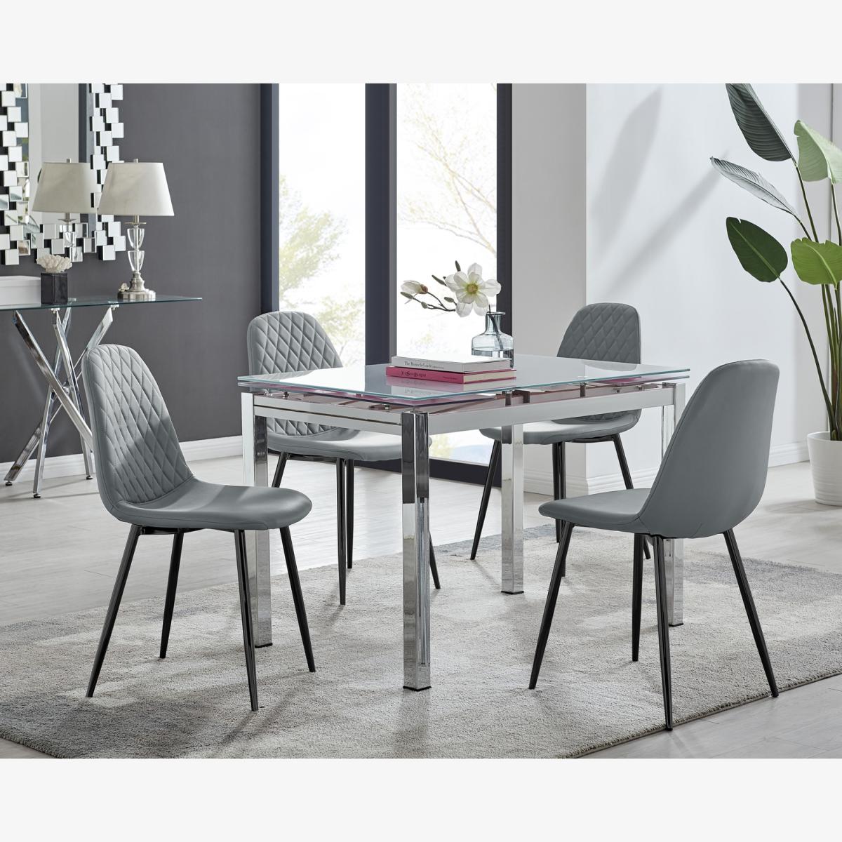 The Enna extending dining table is the perfect example of how we love to combine beautiful design with practical functionality here at Furniturebox! The elegant chrome legs support a sleek and beautiful tempered white or black glass top. The extending mechanism is also a visible design feature and allows the addition of extra diners once fully drawn-out. A bar handle at each end of the table allows effortless extension, with each panel sliding smoothly from under the table-top to click neatly into place. If you're looking for style and versatility in your dining area then the Enna Table ticks all the boxes! Styled with our statement Corona dining chairs, this set is a perfect balance of pattern and texture. The sleek black powder coated legs of the Corona chairs are a great way to add a touch of minimalist style to your home. The Scandi-style faux leather seat with diamond pattern stitching is a unique take on a classic design offering comfort and durability for everyday use.