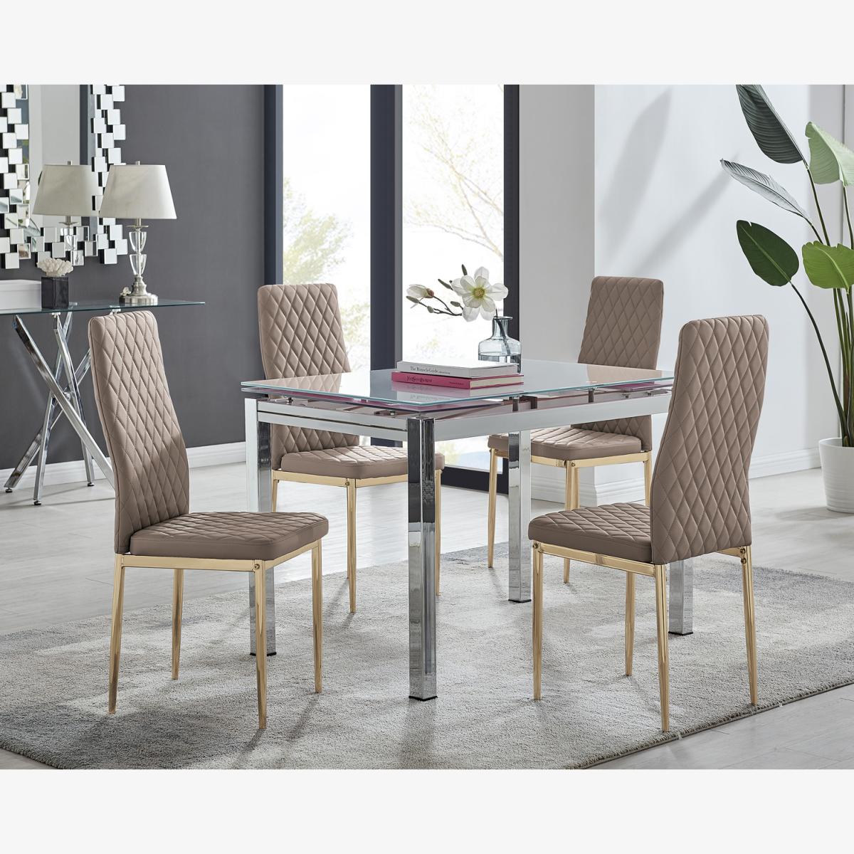 The Enna extending dining table is the perfect example of how we love to combine beautiful design with practical functionality here at Furniturebox! The elegant chrome legs support a sleek and beautiful tempered white or black glass top. The extending mechanism is also a visible design feature and allows the addition of extra diners once fully drawn-out. A bar handle at each end of the table allows effortless extension, with each panel sliding smoothly from under the table-top to click neatly into place. If you're looking for style and versatility in your dining area then the Enna Table ticks all the boxes! Paired alongside our beautiful faux leather diamond quilted Milan dining chairs for a sophisticated contemporary look. The Milan chairs are made from high quality faux leather with trendy gold effect legs and are ergonomically designed for maximum comfort and back support. Made for regular use, the protective plastic feet will protect your floor from any damage. Available in elephant grey, cappuccino grey, white, black or mustard to add your own personality and complete this gorgeous dining set.