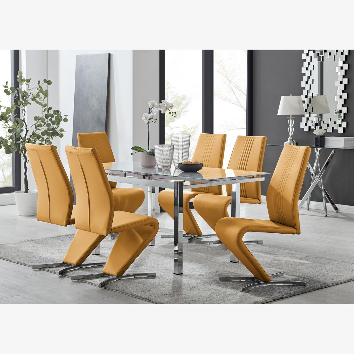 The Enna extending dining table is the perfect example of how we love to combine beautiful design with practical functionality here at Furniturebox! The elegant chrome legs support a sleek and beautiful tempered white or black glass top. The extending mechanism is also a visible design feature and allows the addition of extra diners once fully drawn-out. A bar handle at each end of the table allows effortless extension, with each panel sliding smoothly from under the table-top to click neatly into place. If you're looking for style and versatility in your dining area then the Enna Table ticks all the boxes! Partnered alongside our premium modern Willow dining chairs, this dining set will really offer the wow factor! These eye-catching, faux leather chairs are fully padded throughout and have an ergonomically designed back support to maximise comfort. They also feature half-moon chromed feet, which give these chairs a sturdy base. The curved design gives the Willow chair a contemporary elegance and they compliment the table perfectly. Add your own personality by choosing from a range of colours for the chairs
