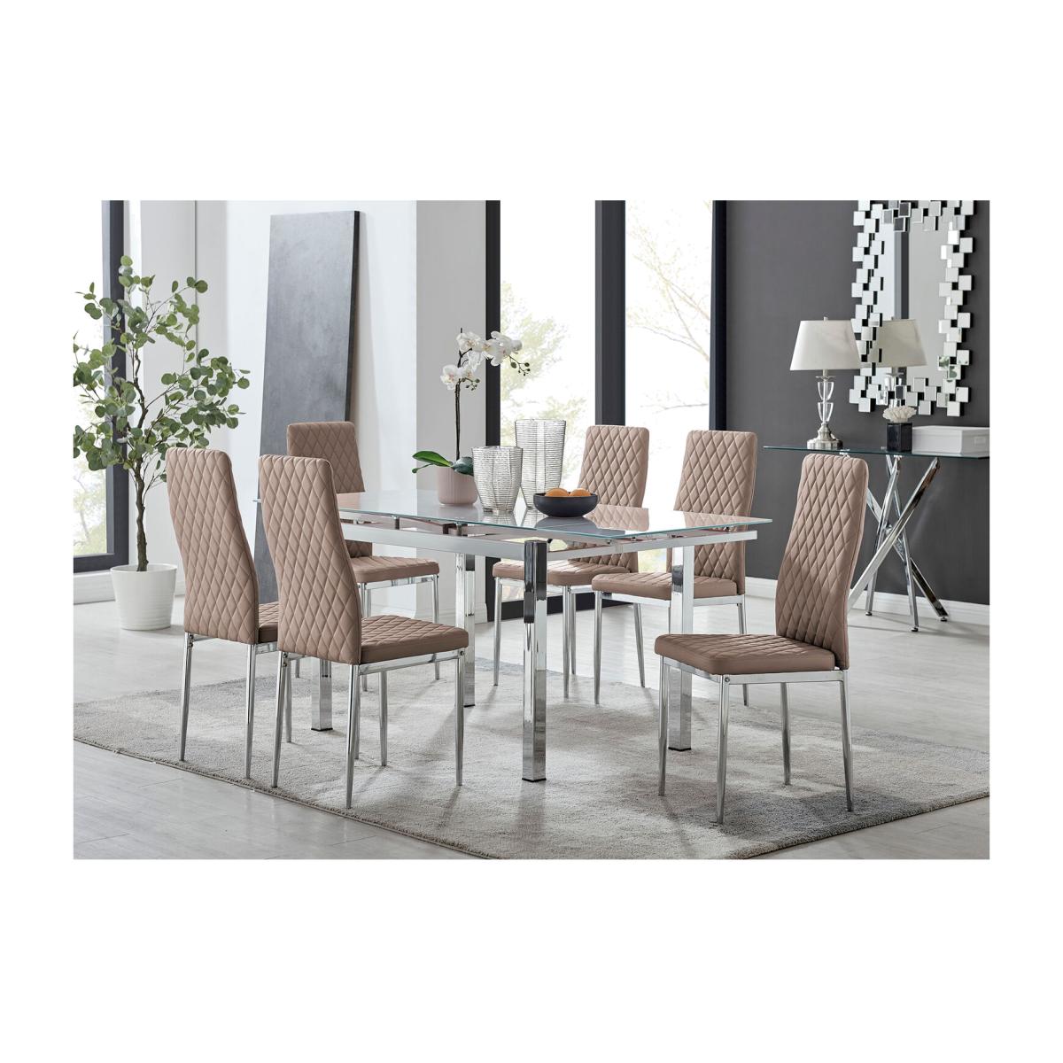 The Enna extending dining tableis the perfect example of how we love to combine beautiful design with practical functionality here at Furniturebox! The elegant chrome legs support asleek and beautifultempered white or black glass top. The extending mechanism is also a visible design feature and allows the addition of extra diners once fully drawn-out. A bar handle at each end of the table allows effortless extension, with each panel sliding smoothly from under the table top to click neatly into place. If you're looking for style and versatility in your dining area then the Enna Table ticks all the boxes! Upholstered in soft faux leather and finished with diamond pattern stitching the Milan dining chairs would seamlessly fit in with most dining spaces, whilst not compromising on either style or comfort. The stylish chrome leg and hatched leather combination gives this chair a contemporary edge, whilst it's simple design allows for practical everyday usage. The chairs are made from high quality faux leather and are ergonomically designed for maximum comfort and support. They feature soft touch faux leather with a deep foam seat cushion and plastic feet to protect the floor from any damage! At an unbeatable price you cannot go wrong with these chairs!