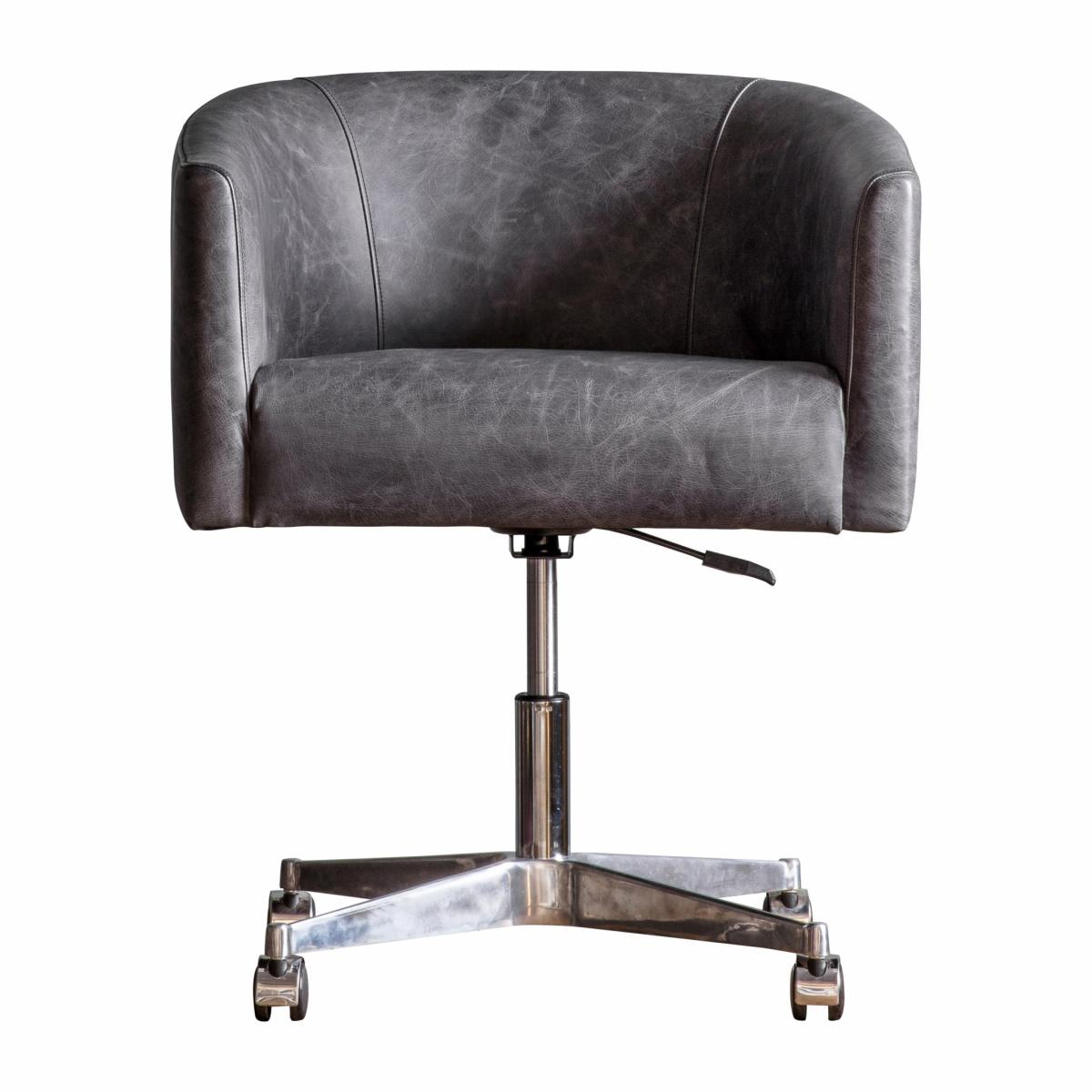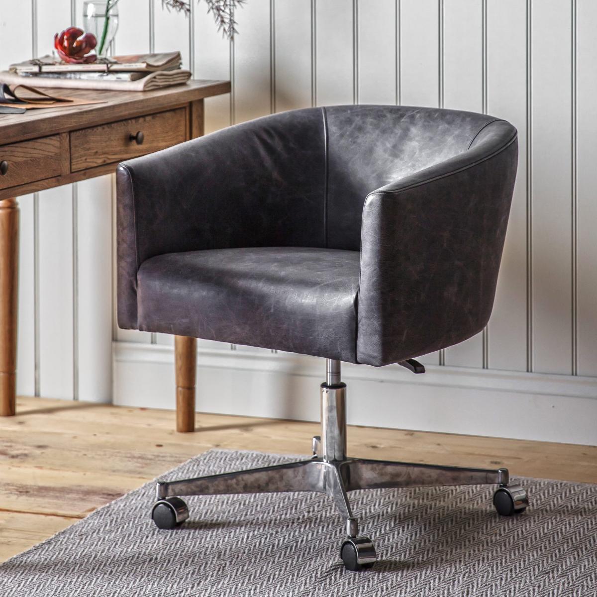 The Enrico Swivel Chair Antique Ebony offers a quality stylish solution to home office working. The chair is upholstered in full leather hide and has a padded back and sides and a deep padded seat for comfort. This is paired with a classy silver base with castors for easy manoeuvrability. Gas adjustment of the seat height adds a practical touch. Material: Leather. Colour/Finish: Grey.